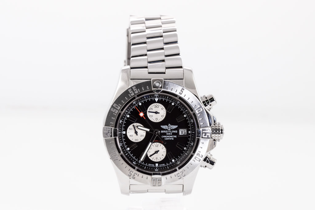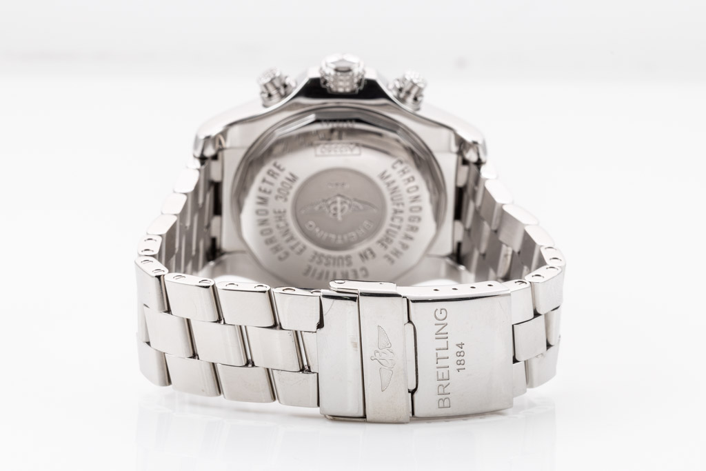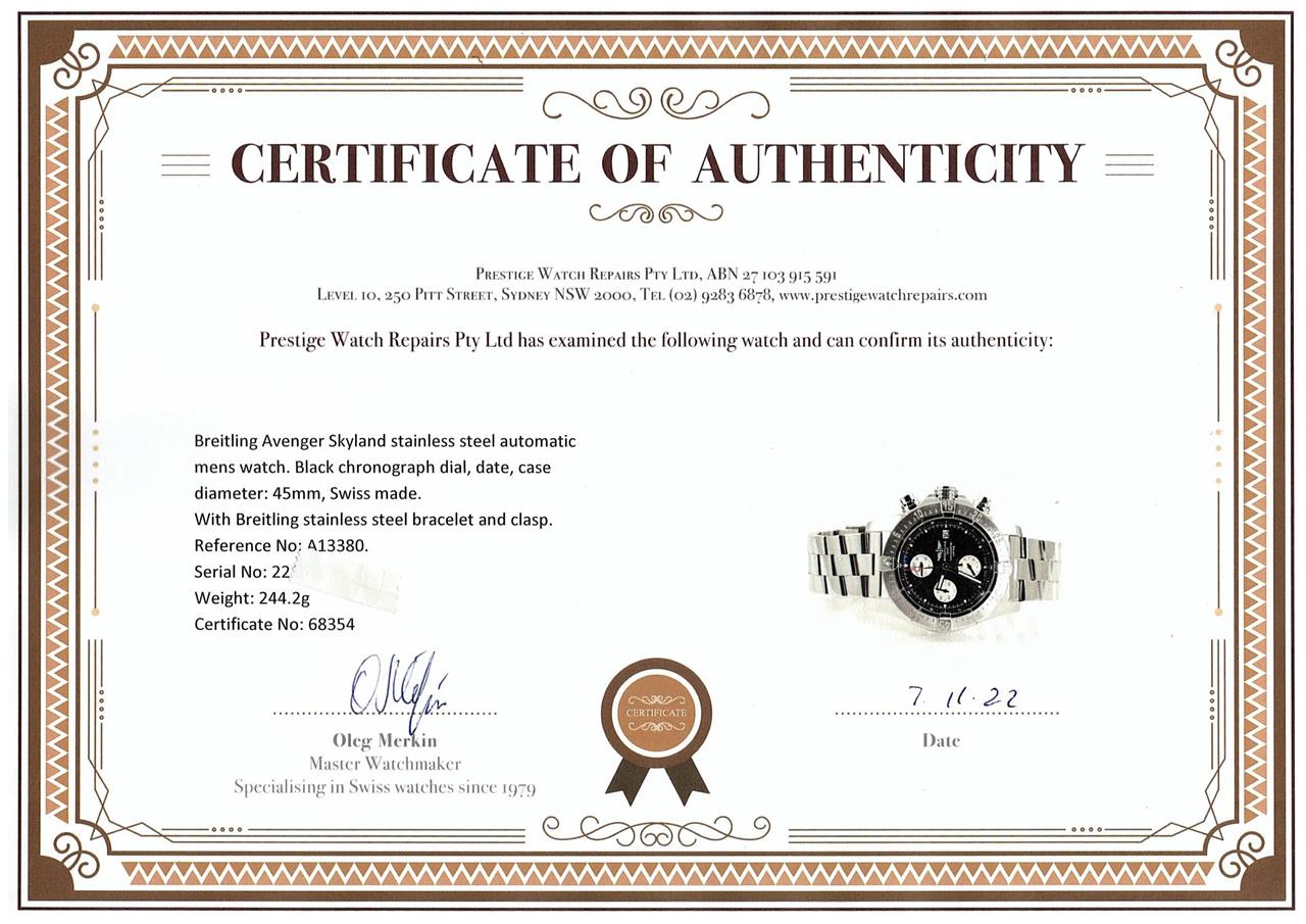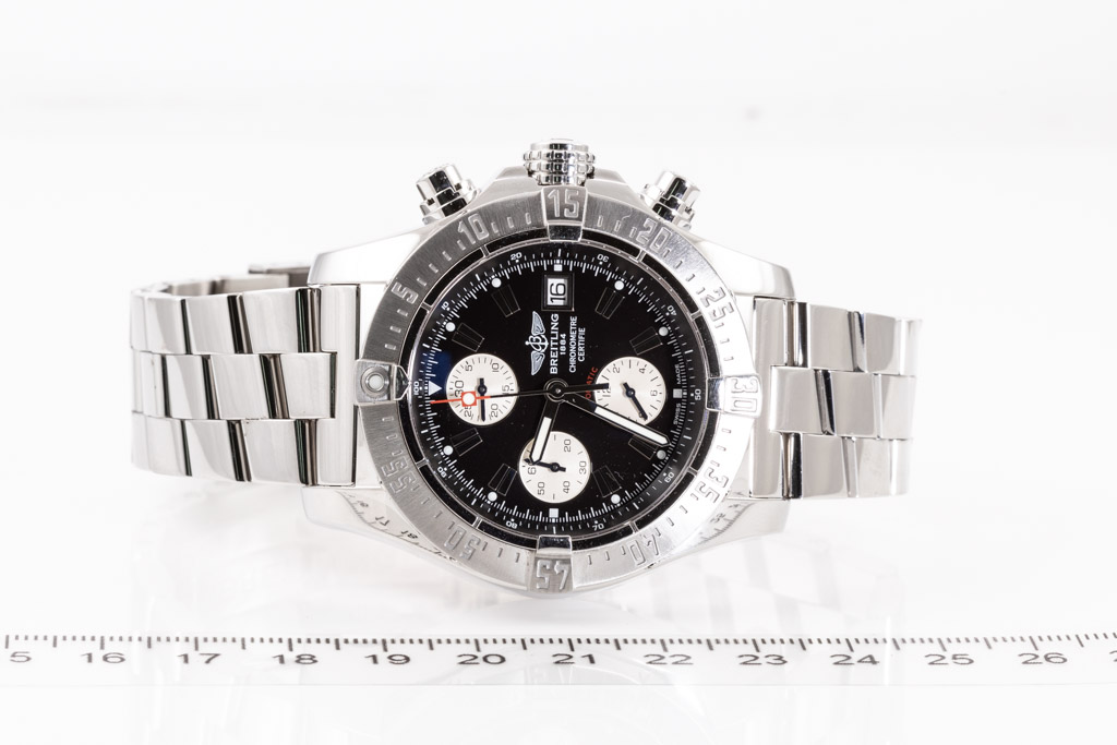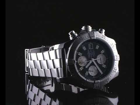 Breitling Avenger Skyland stainless steel automatic mens watch. Black chronograph dial, date, case diameter: 45mm wrist size: 21cm Swiss made Ref# A13380 With Breitling stainless steel bracelet and clasp. With Certificate of Authenticity. 3 moth FSA warranty (Pre-owned)