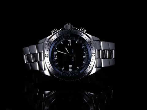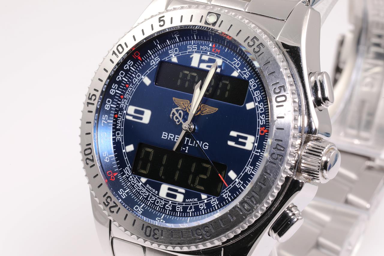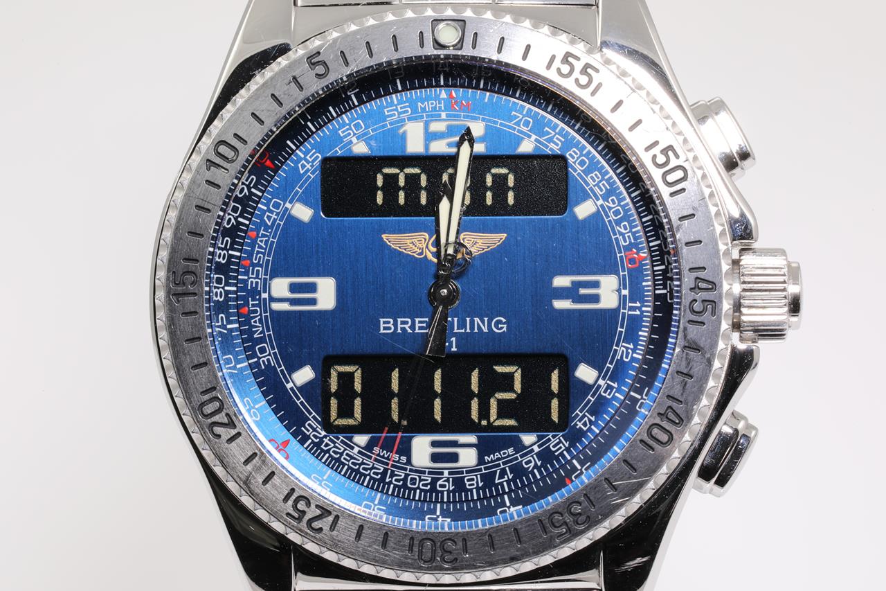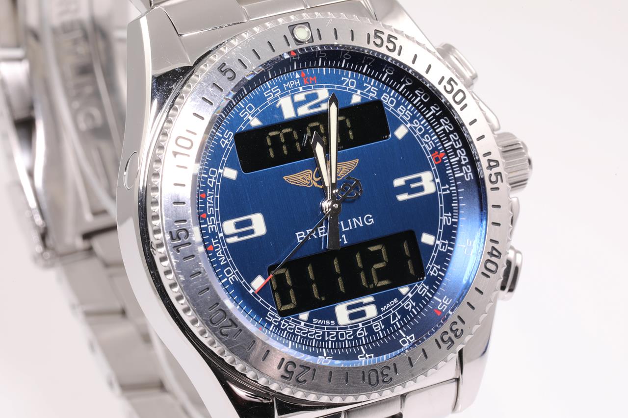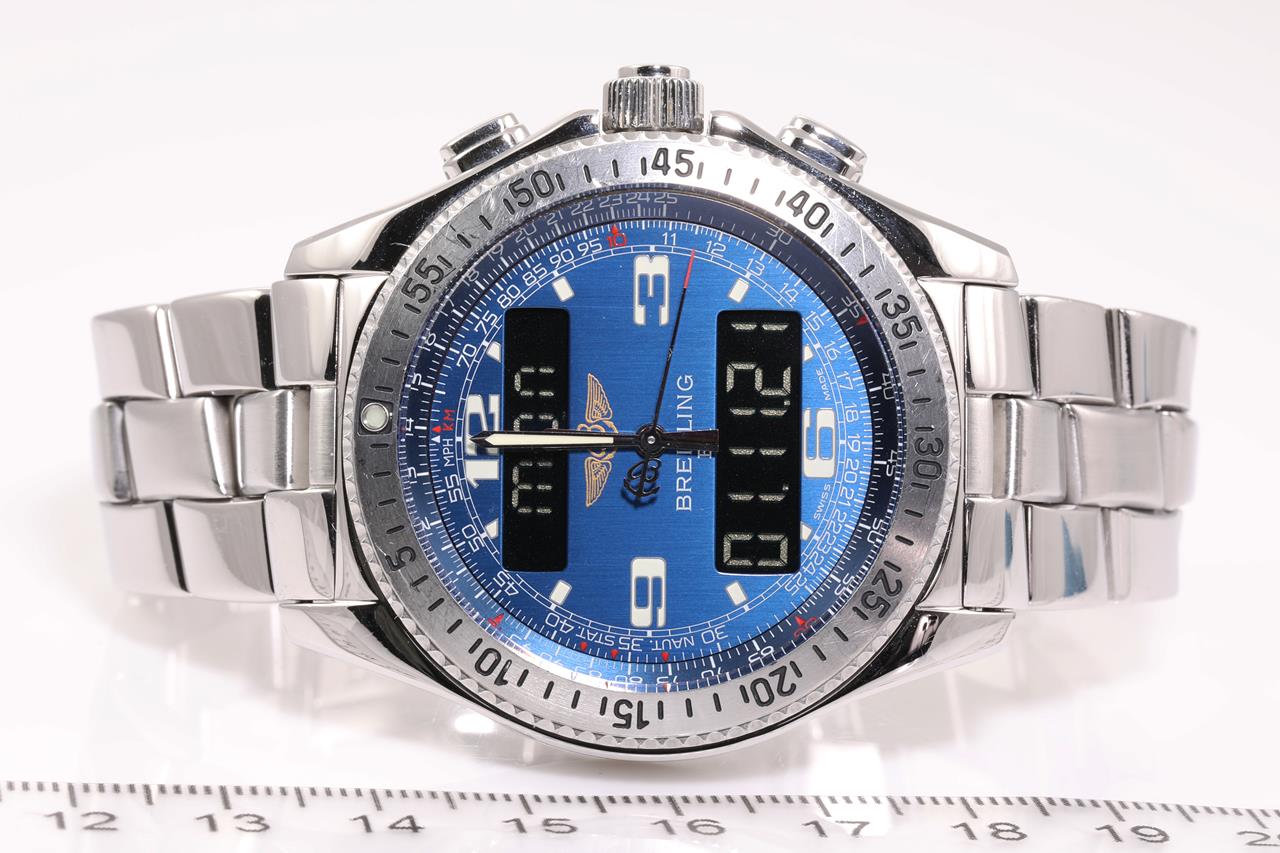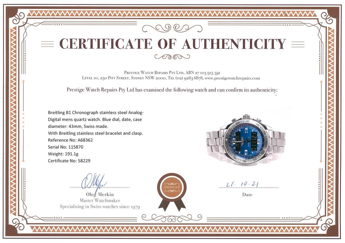 Breitling B1 Chronograph stainless steel Analog-Digital mens quartz watch. Blue dial, date, case diameter: 43mm, wrist size: 20cm, Swiss made. Ref# A68362. With Breitling stainless steel bracelet and clasp. With certificate of authenticity. 3 month FSA warranty. (Pre-owned)