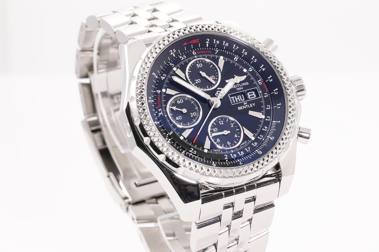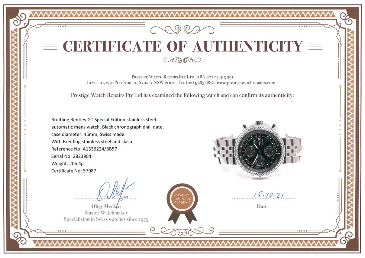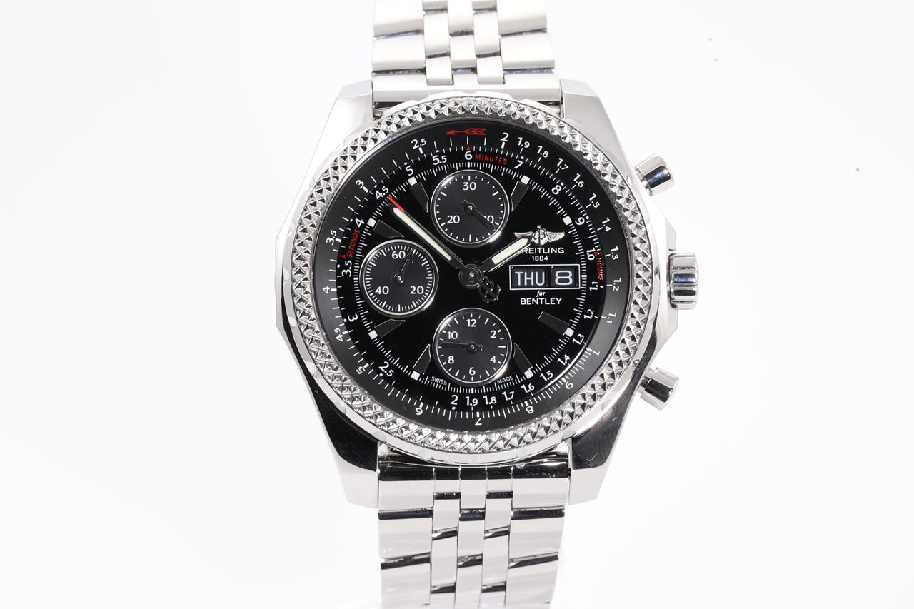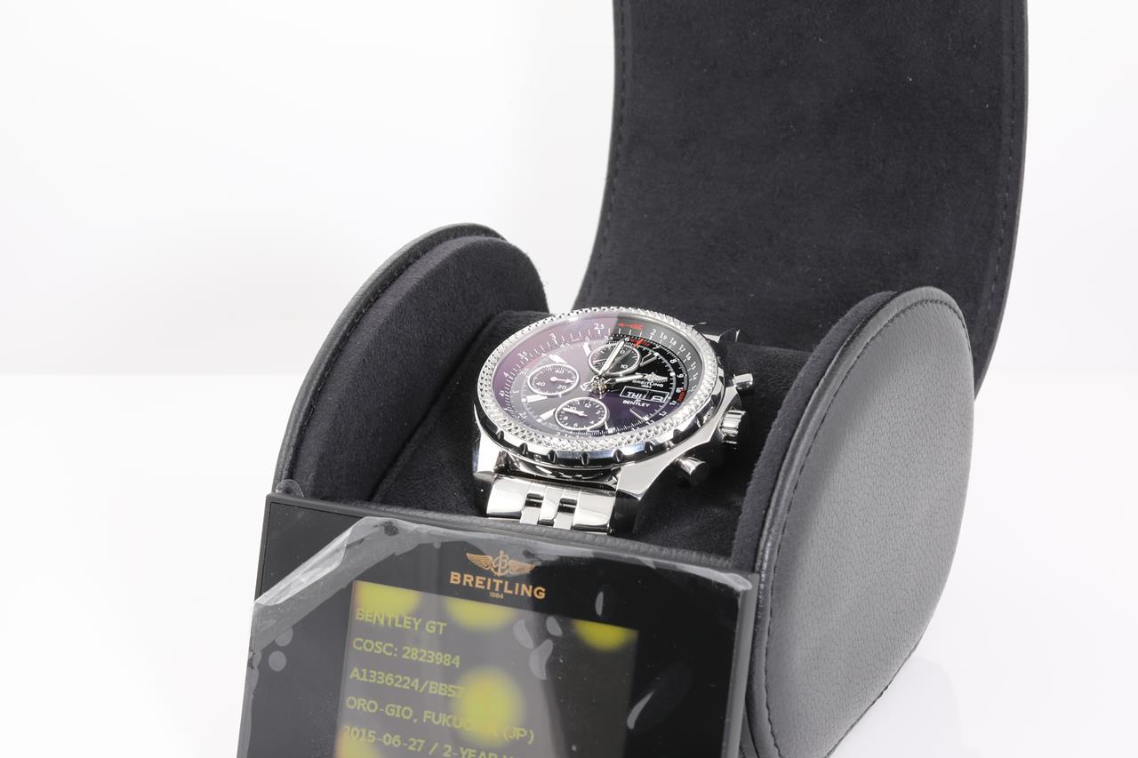 Breitling Bentley GT Special Edition stainless steel automatic mens watch. Black chronograph dial, date, case diameter: 45mm, wrist size: 20cm, Swiss made. Ref# A1336224/BB57. With Breitling stainless steel and clasp. With certificate of authenticity, Breitling e-warranty card dated 27/06/2015 and Breitling box. 3 month FSA warranty. (Pre-owned)