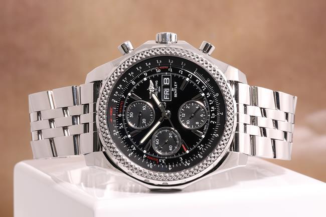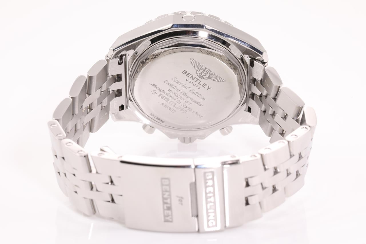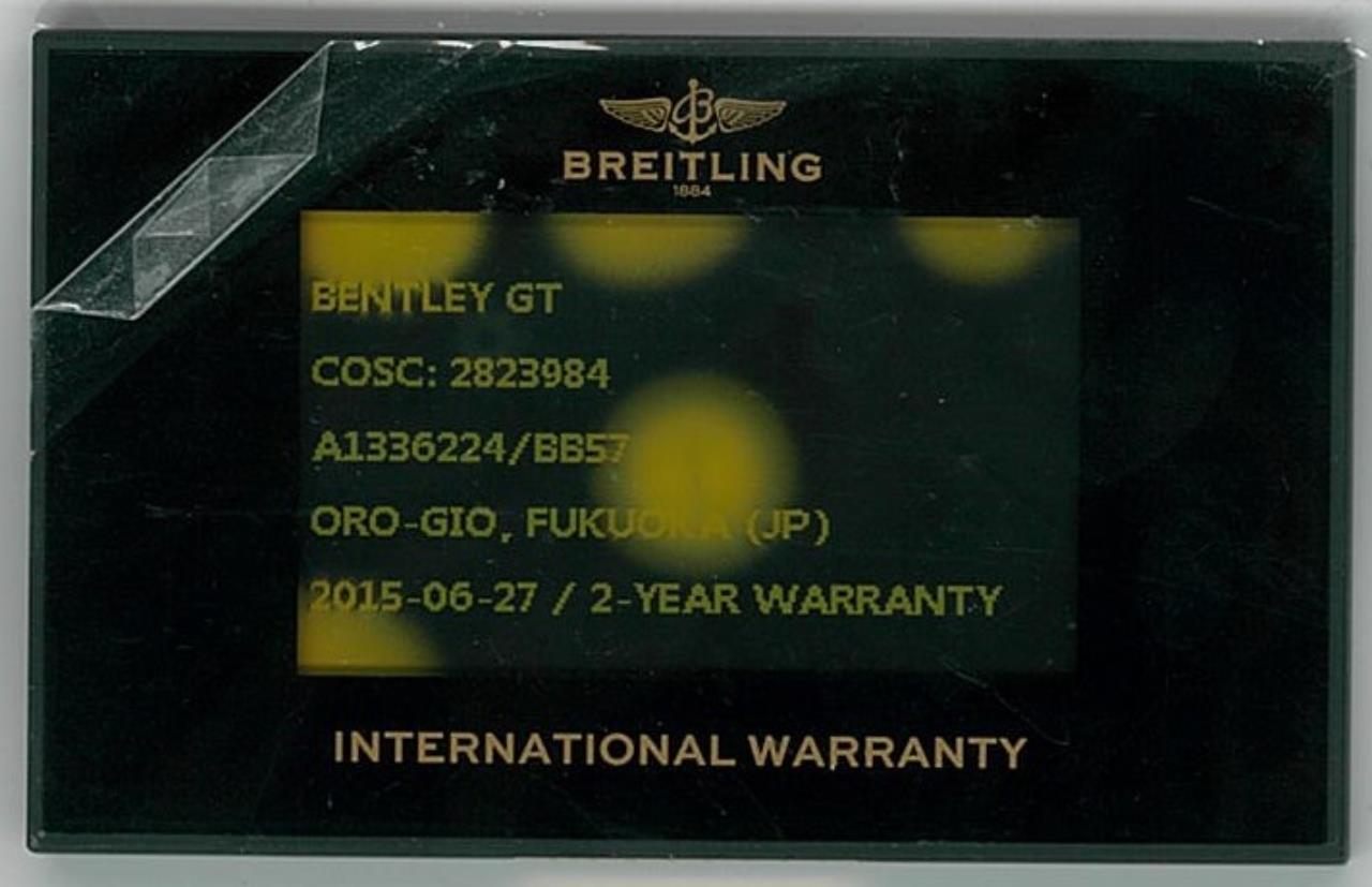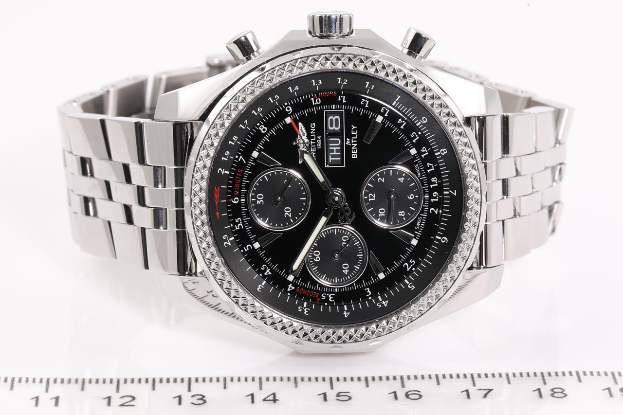Breitling Bentley GT Special Edition stainless steel automatic mens watch. Black chronograph dial, date, case diameter: 45mm, wrist size: 20cm, Swiss made. Ref# A1336224/BB57. With Breitling stainless steel and clasp. With certificate of authenticity, Breitling e-warranty card dated 27/06/2015 and Breitling box. 3 month FSA warranty. (Pre-owned)