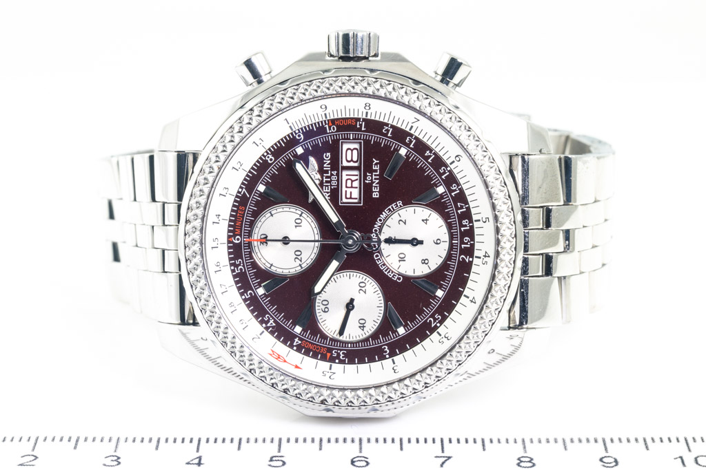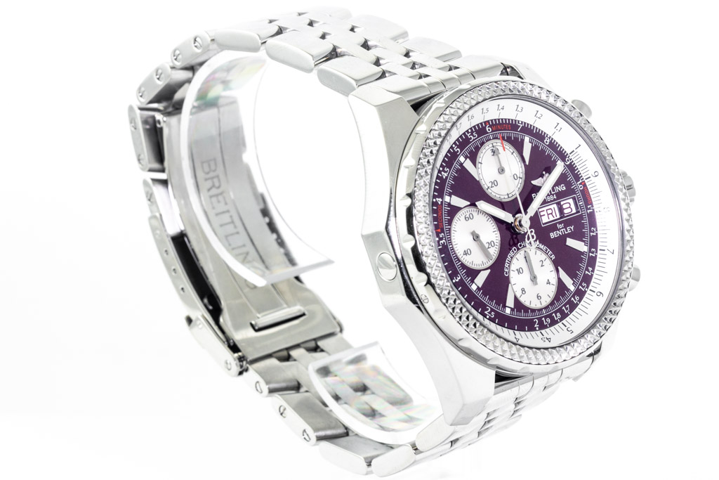 Breitling Bentley GT Special Edition stainless steel automatic mens watch. Dark red chronograph dial, day & date, case diameter: 44mm, wrist size: 19.5cm, Swiss made. Ref# A362K06SP (A13362). With Breitling stainless steel bracelet and clasp. With Certificate of Authenticity, Breitling International Warranty booklet dated 10/07/2005 and Breitling box. 3 month FSA warranty. (Pre-owned)