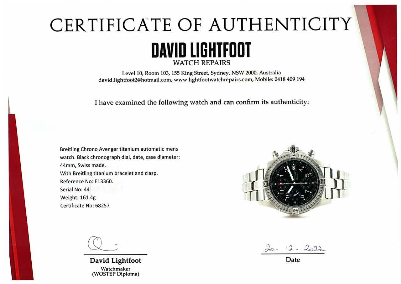 Breitling Chrono Avenger titanium automatic mens watch. Black chronograph dial, date, case diameter: 44mm, wrist size: 20cm, Swiss made. Ref# E13360. With Breitling titanium bracelet and clasp. With Certificate of Authenticity, Breitling International Warranty Certificate booklet dated: 22/11/2001 and Breitling box. 3 month FSA warranty. (Pre-owned)