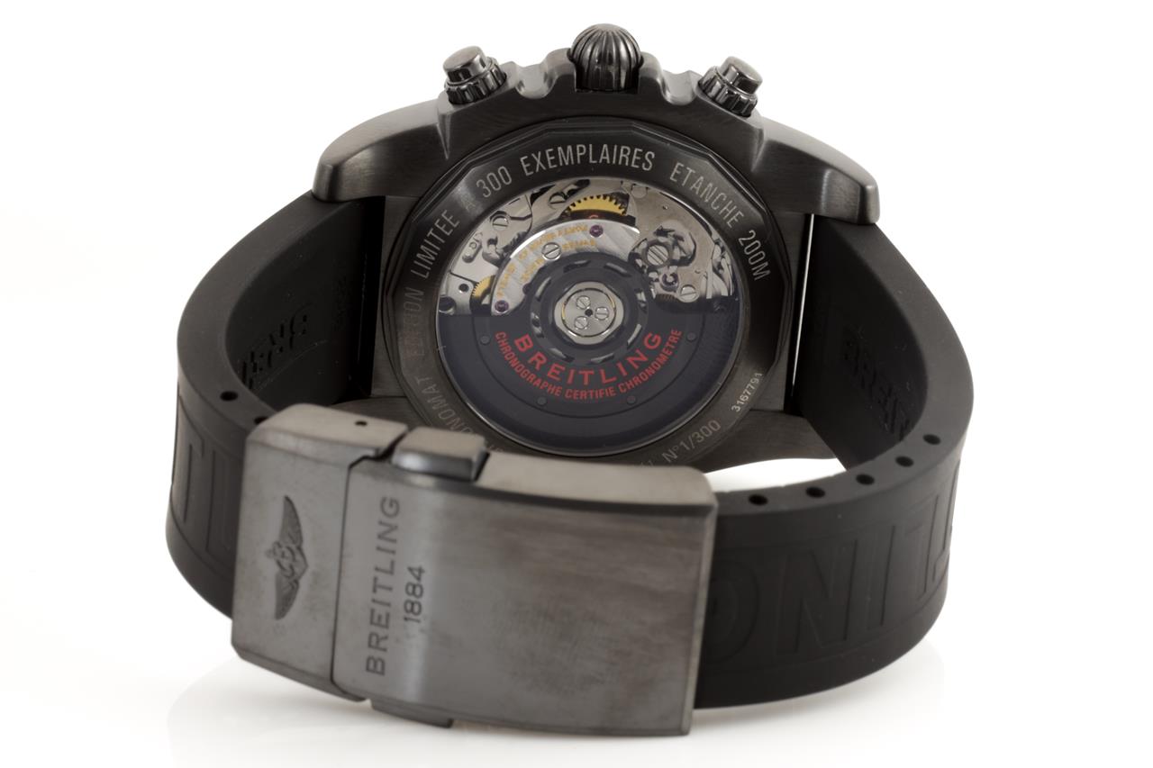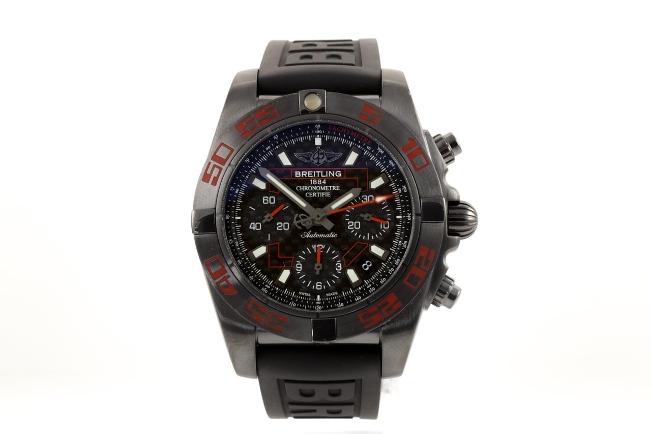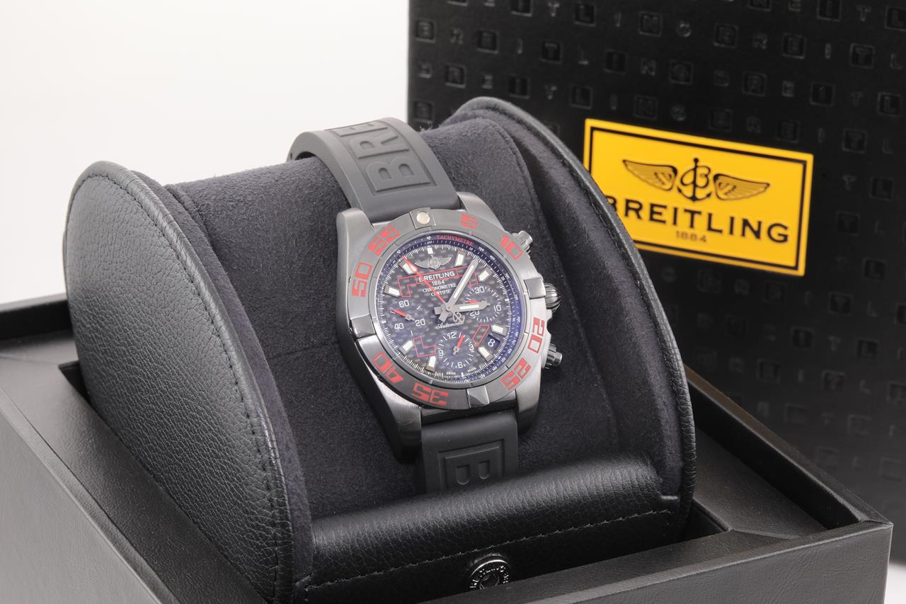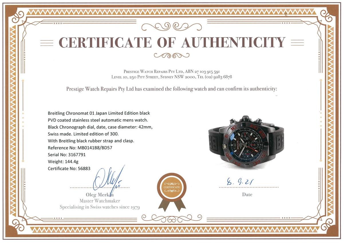 Breitling Chronomat 01 Japan Limited Edition black PVD coated stainless steel automatic mens watch. Black Chronograph dial, date, case diameter: 42mm, wrist size: 18cm, Swiss made. Ref# MB0141B8/BD57, limited edition of 300. With Breitling black rubber strap and clasp. With certificate of authenticity, Breitling international e-warranty card dated 03/07/2013, spare Breitling black rubber strap, watch travel case and Breitling box. 3 month FSA warranty. (Pre-owned)
