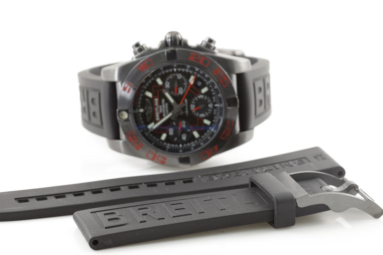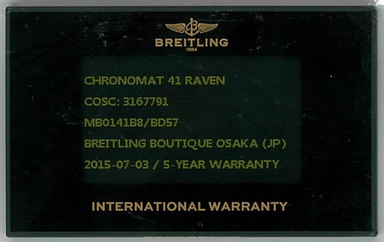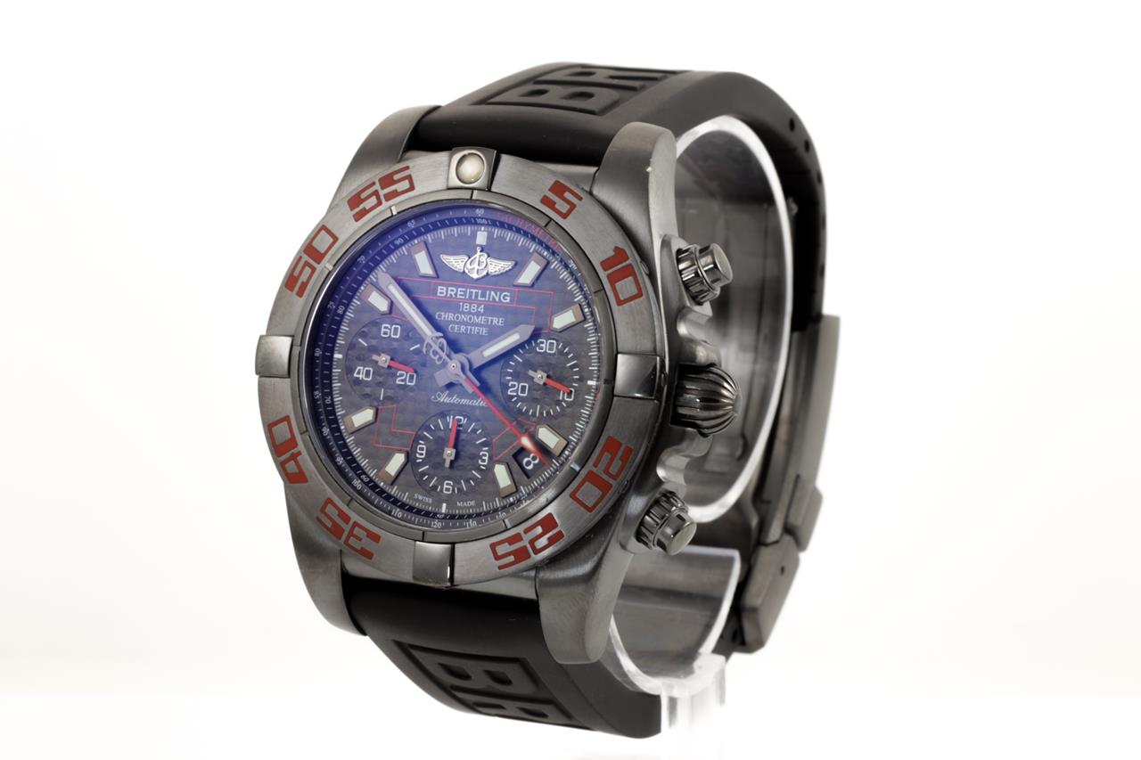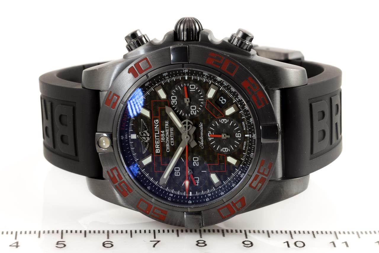Breitling Chronomat 01 Japan Limited Edition black PVD coated stainless steel automatic mens watch. Black Chronograph dial, date, case diameter: 42mm, wrist size: 18cm, Swiss made. Ref# MB0141B8/BD57, limited edition of 300. With Breitling black rubber strap and clasp. With certificate of authenticity, Breitling international e-warranty card dated 03/07/2013, spare Breitling black rubber strap, watch travel case and Breitling box. 3 month FSA warranty. (Pre-owned)