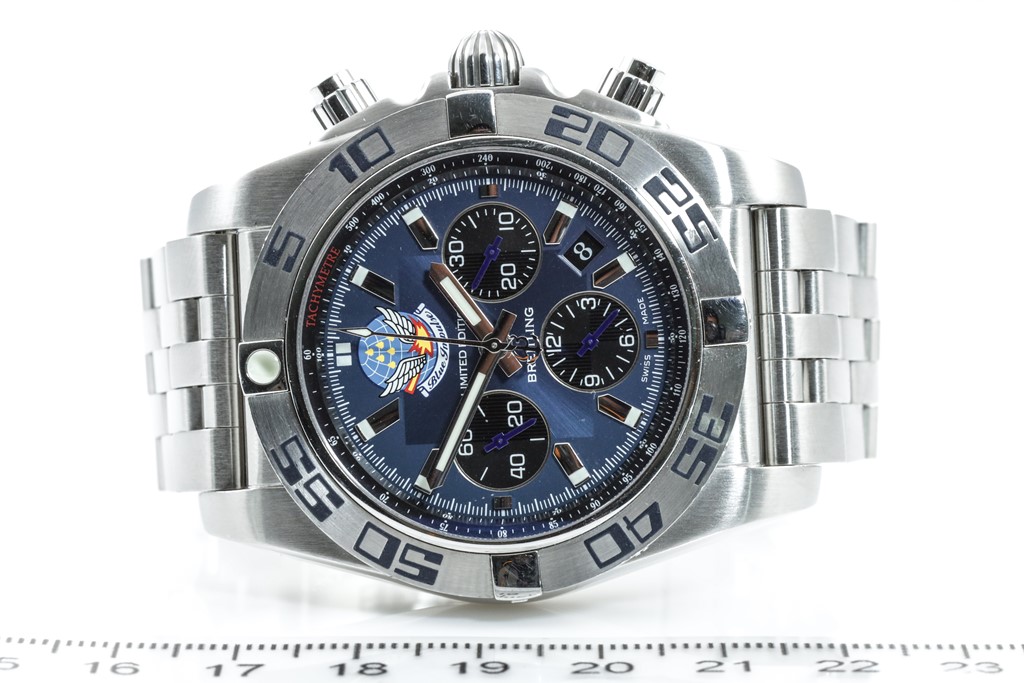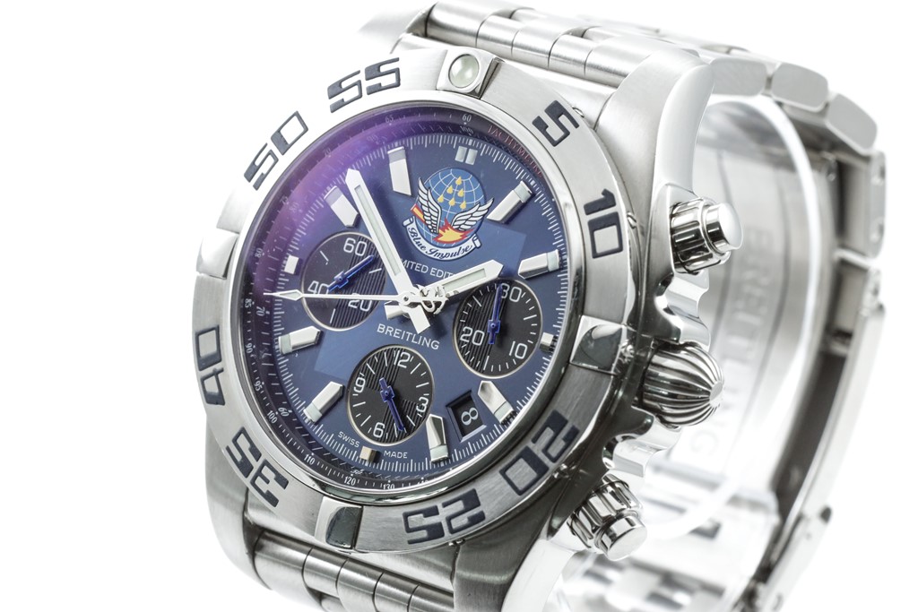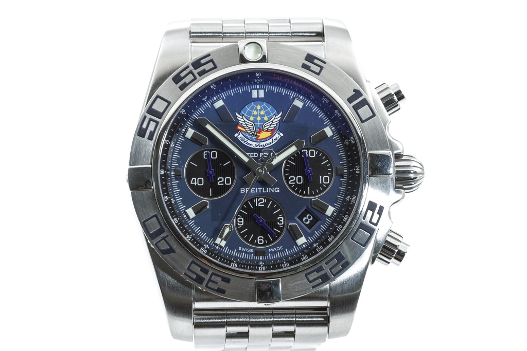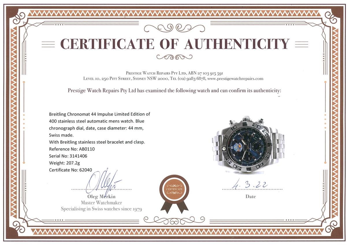 Breitling Chronomat 44 Impulse Limited Edition of 400 stainless steel automatic mens watch. Blue chronograph dial, date, case diameter: 44 mm, wrist size: 16cm, Swiss made. Ref# AB0110. With Breitling stainless steel bracelet and clasp. With Certificate of Authenticity. 3 month FSA warranty. (Preowned)