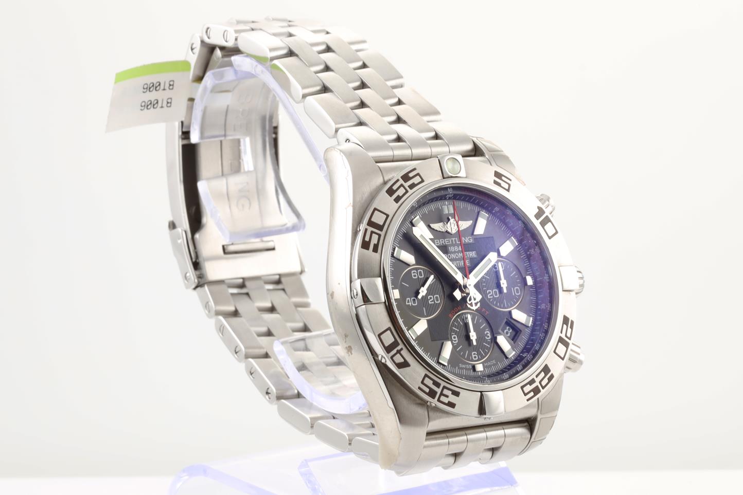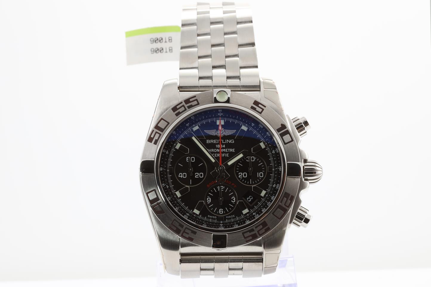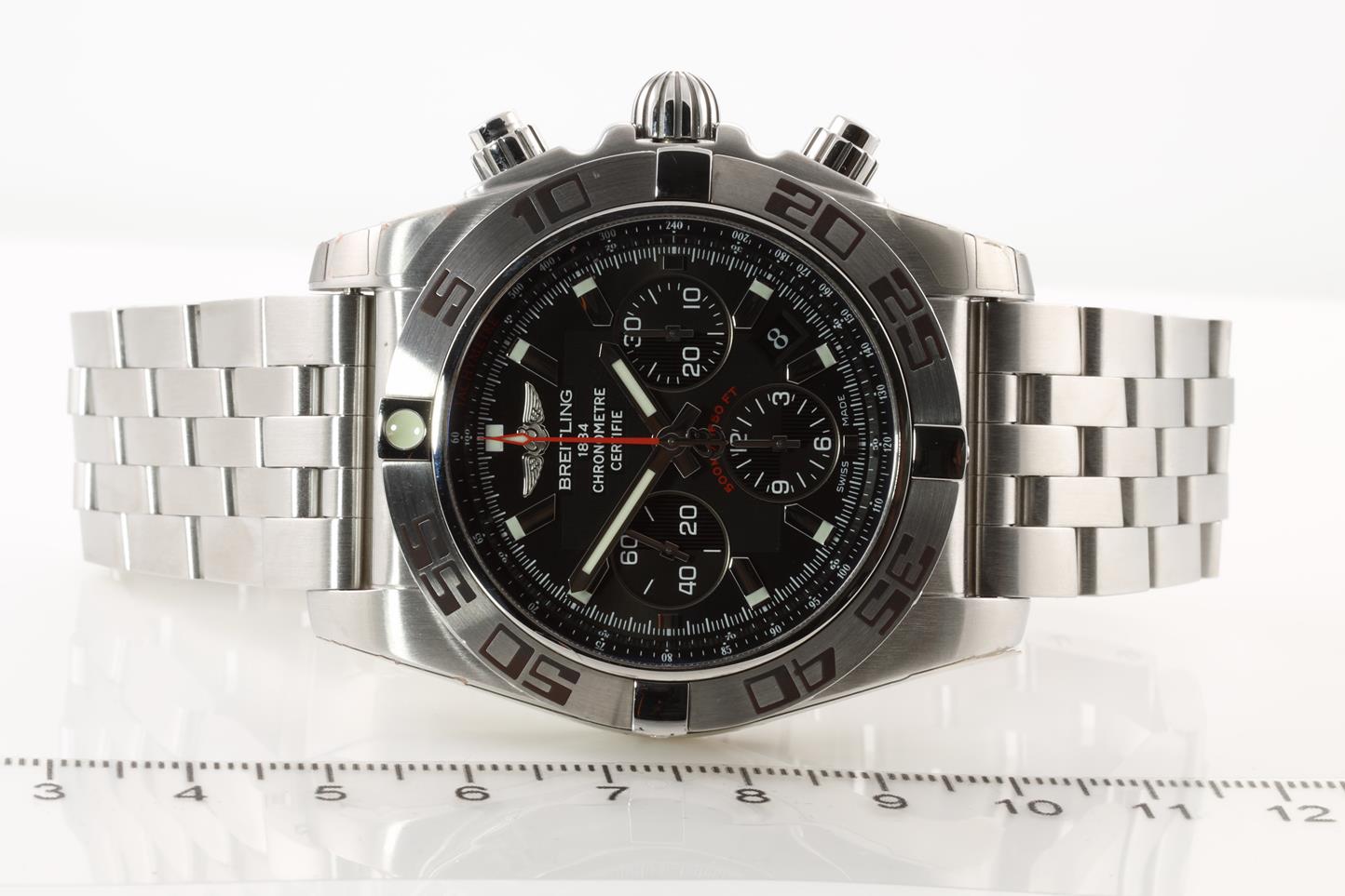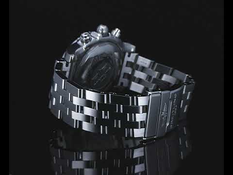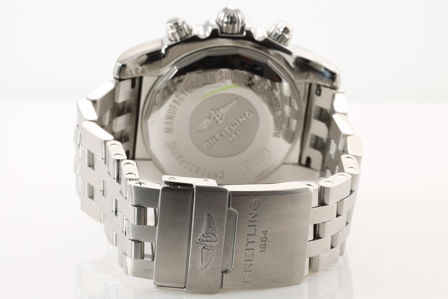 Breitling Chronomat 44 Flying Fish stainless steel automatic mens watch. Black chonograph dial, date, case diameter: 44mm, Swiss made. Ref # AB011610/BB08/377A. With Breitling stainless steel bracelet and clasp. Note: minor scratches on back case due to being display stock. With Breitling booklet inside Breitling box. 3 month FSA warranty. (New)