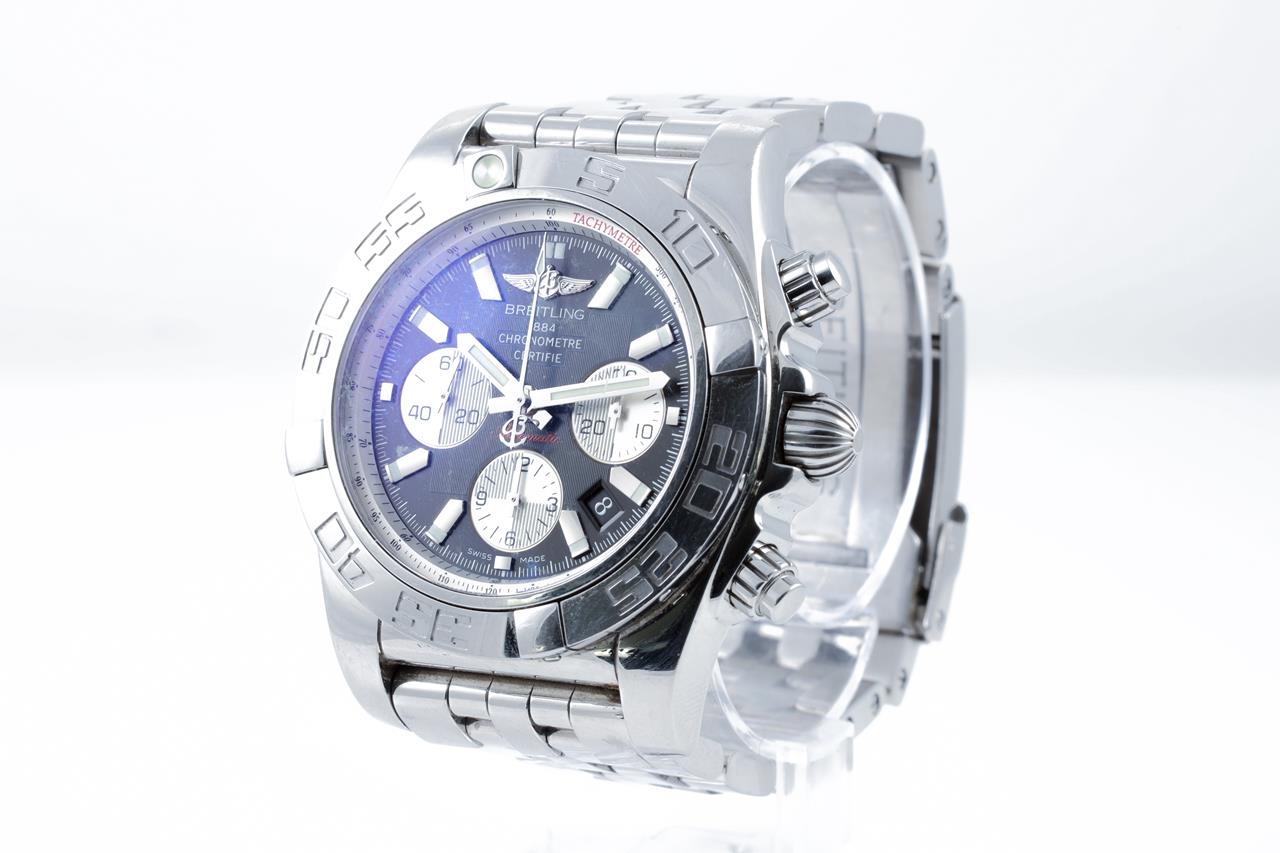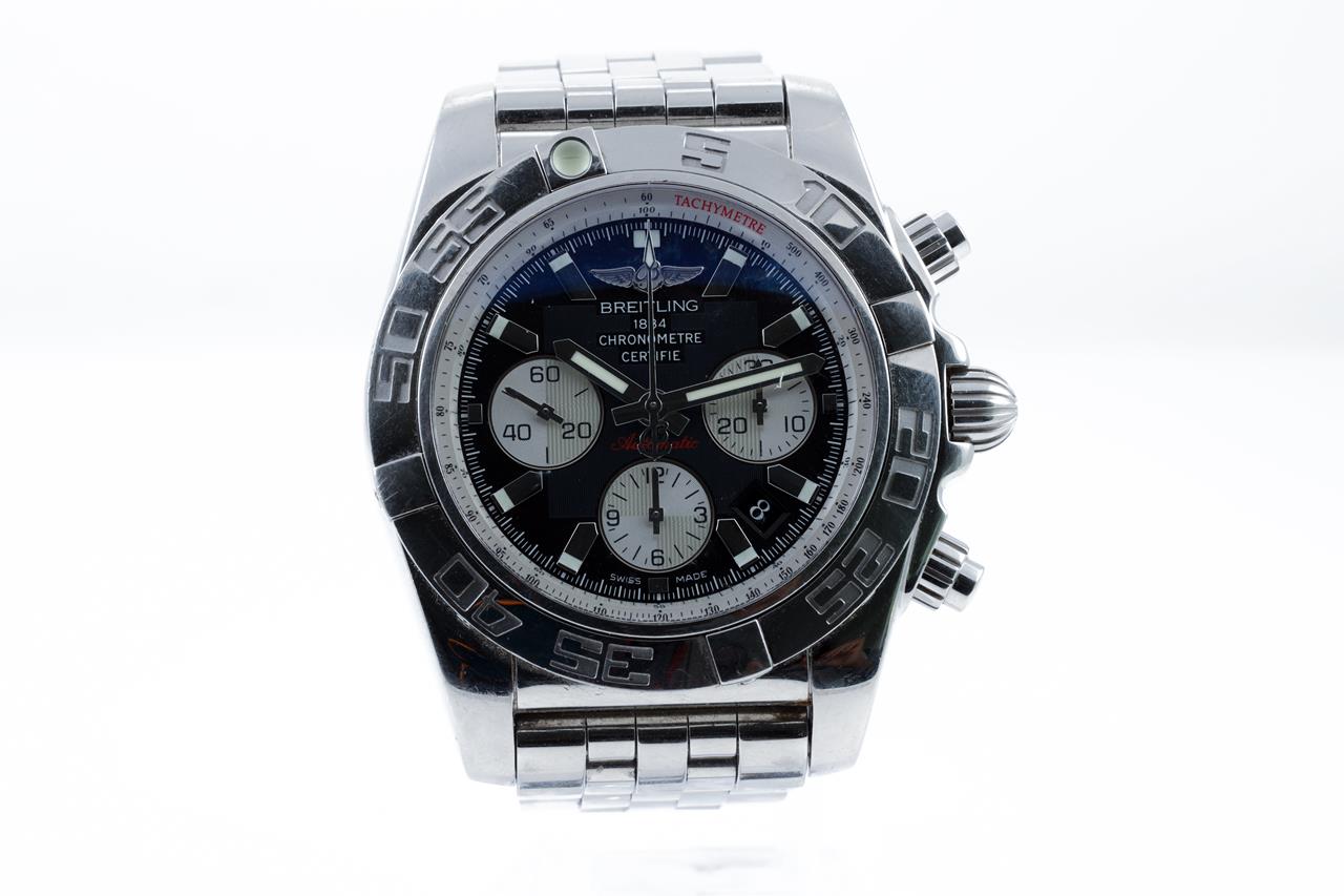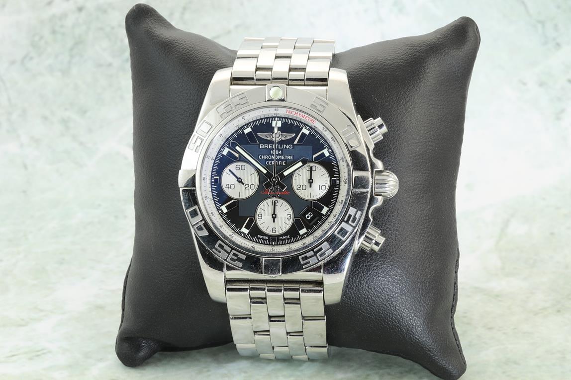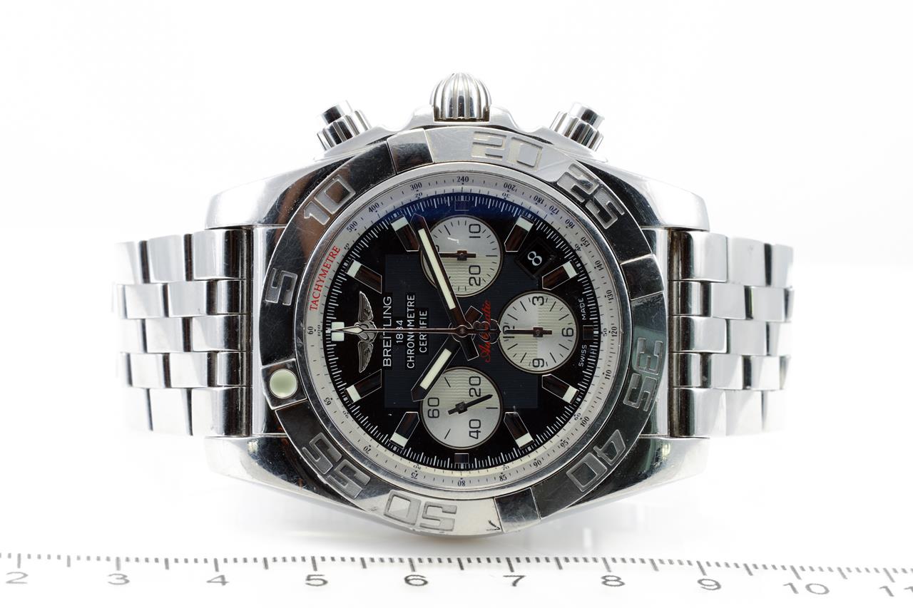 Breitling Chronomat 44 stainless steel automatic mens watch. Black chronograph dial, date, case diameter: 44mm, wrist size: 17cm, Swiss Made. Ref #AB0110. With Breitling stainless steel bracelet and clasp. (Note: This watch is not keeping time. Movement of this watch requires overhaul service and parts replacement.) With certificate of authenticity. (Pre-owned)
