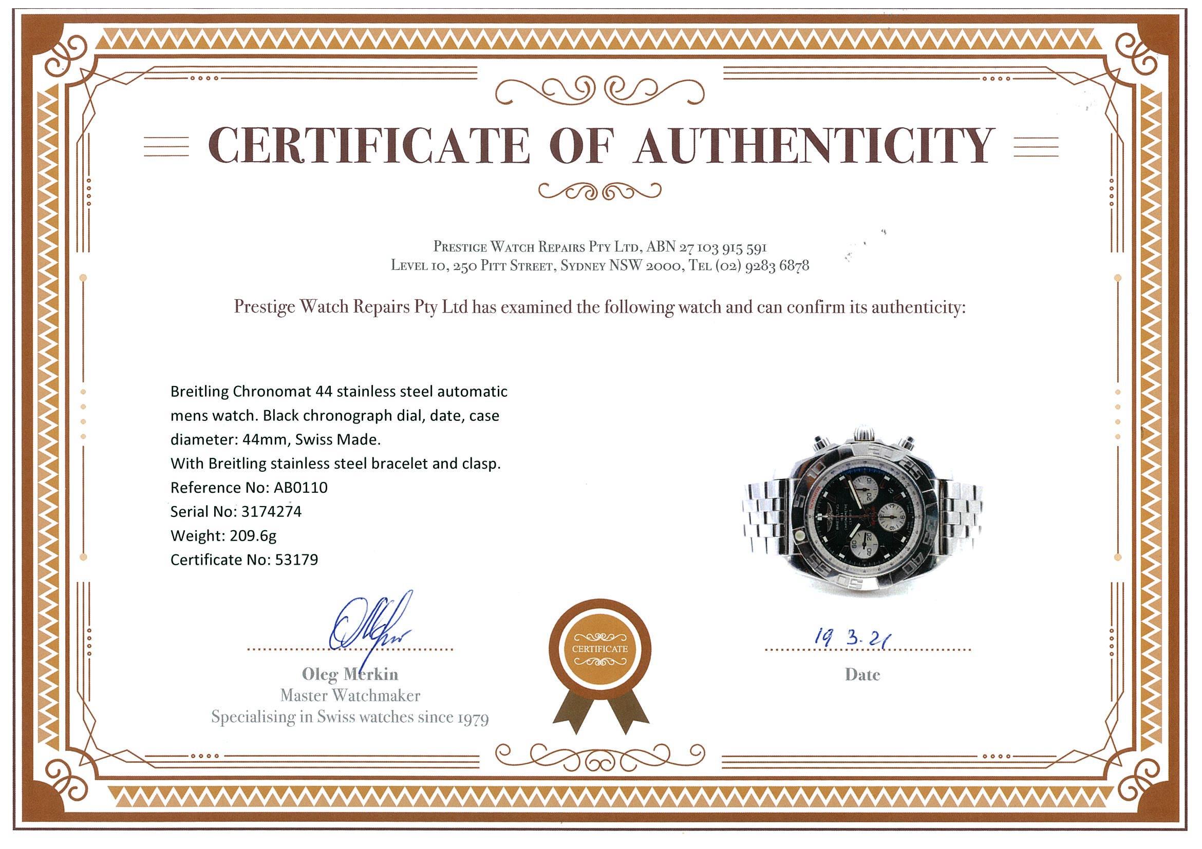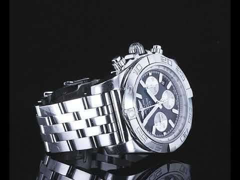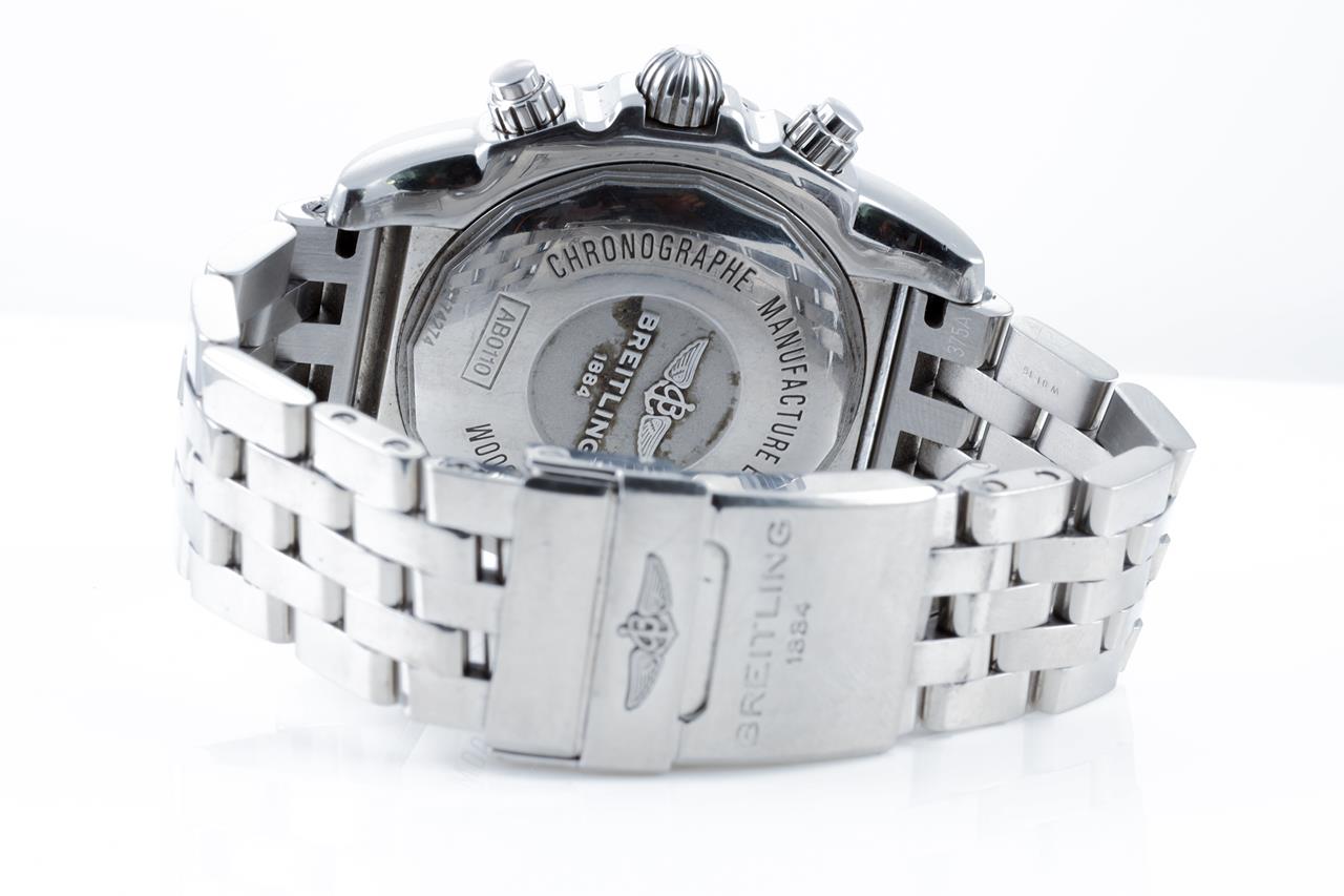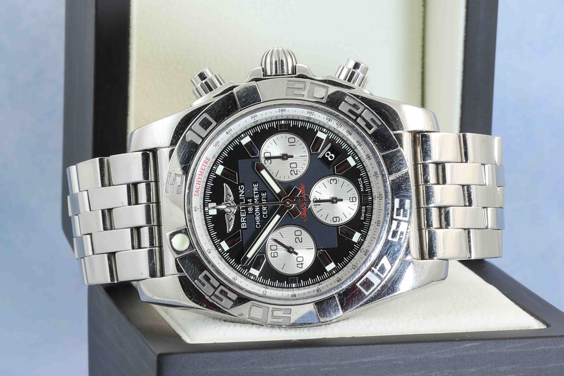 Breitling Chronomat 44 stainless steel automatic mens watch. Black chronograph dial, date, case diameter: 44mm, wrist size: 17cm, Swiss Made. Ref #AB0110. With Breitling stainless steel bracelet and clasp. (Note: This watch is not keeping time. Movement of this watch requires overhaul service and parts replacement.) With certificate of authenticity. (Pre-owned)