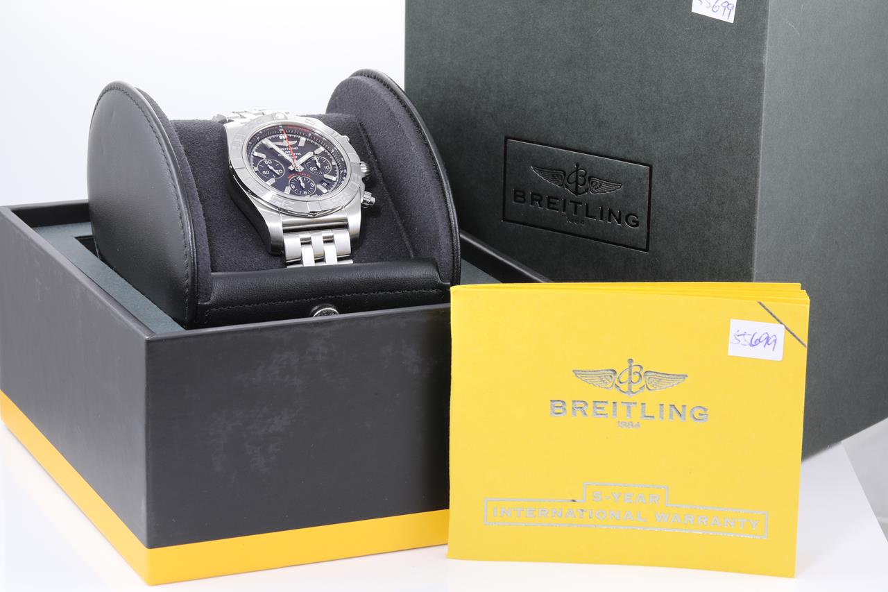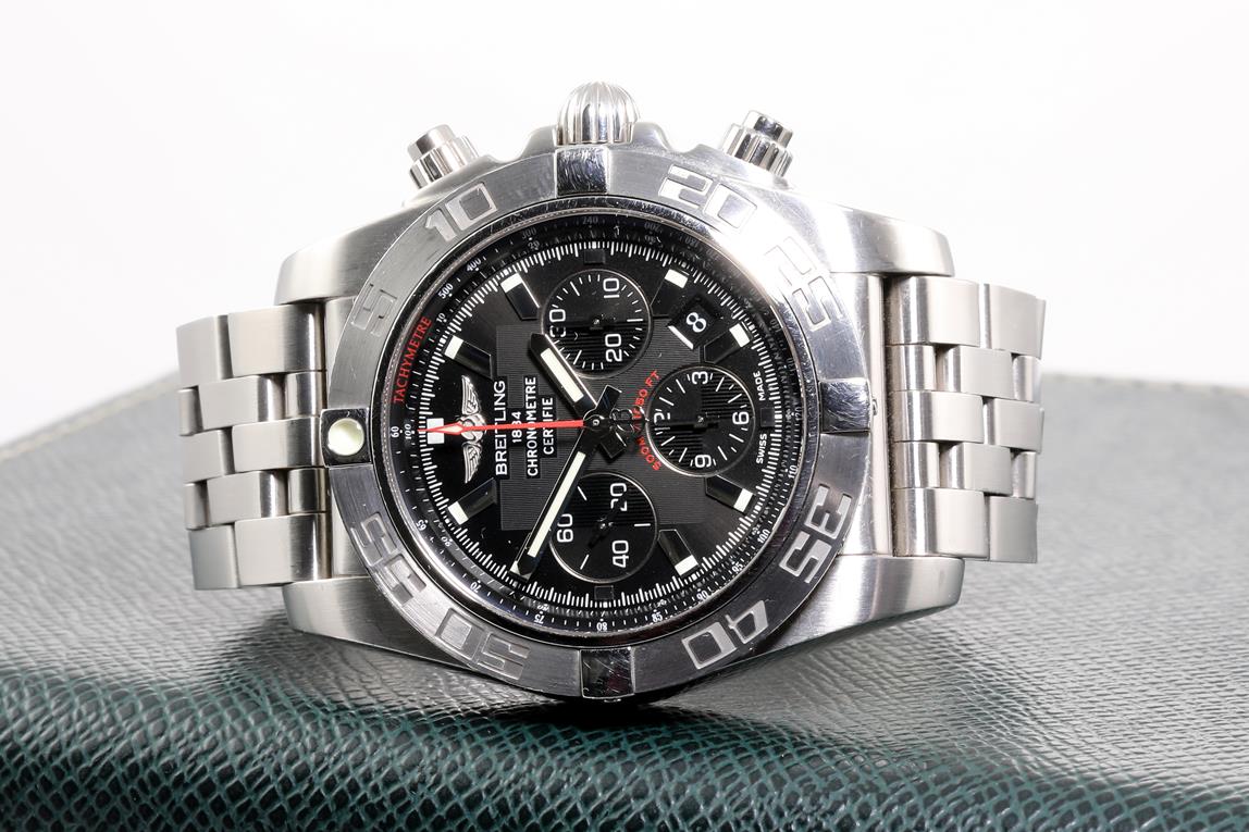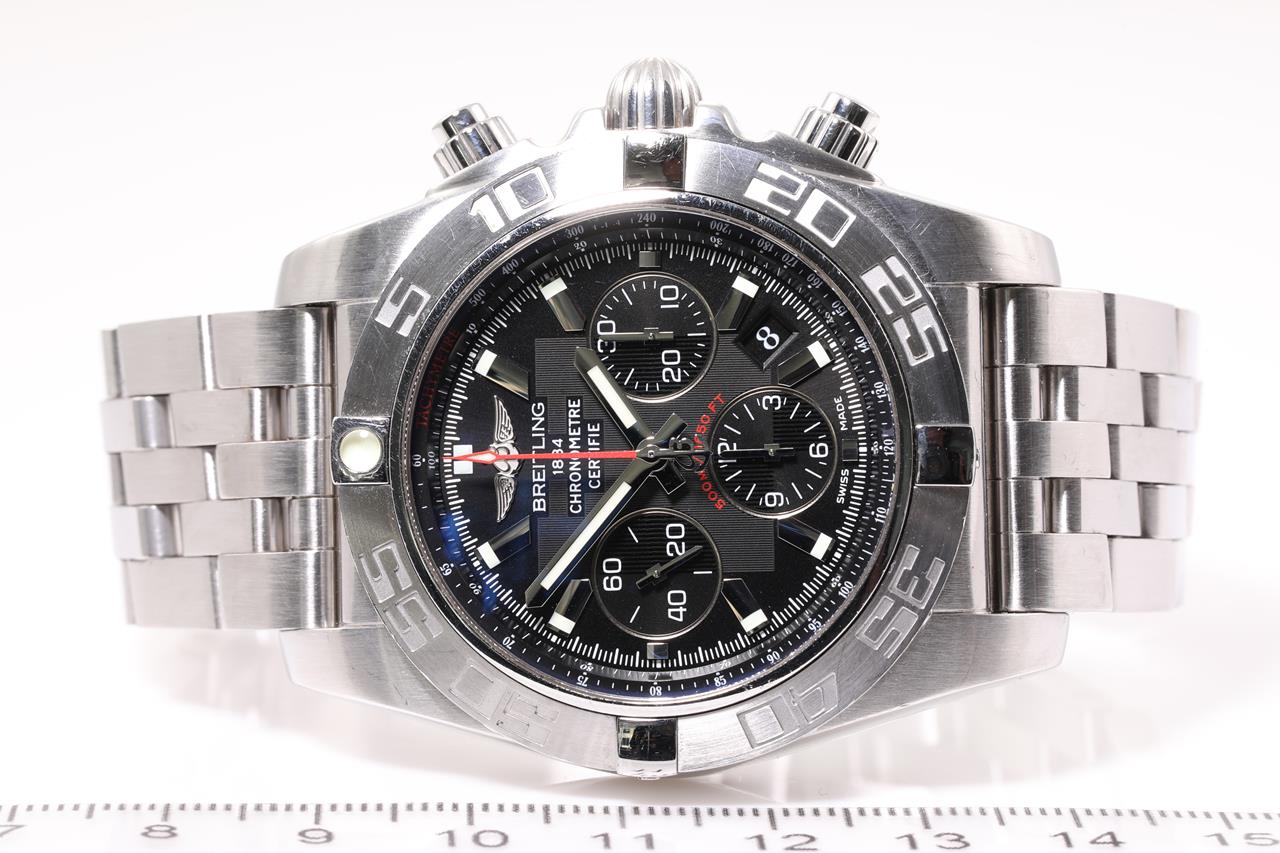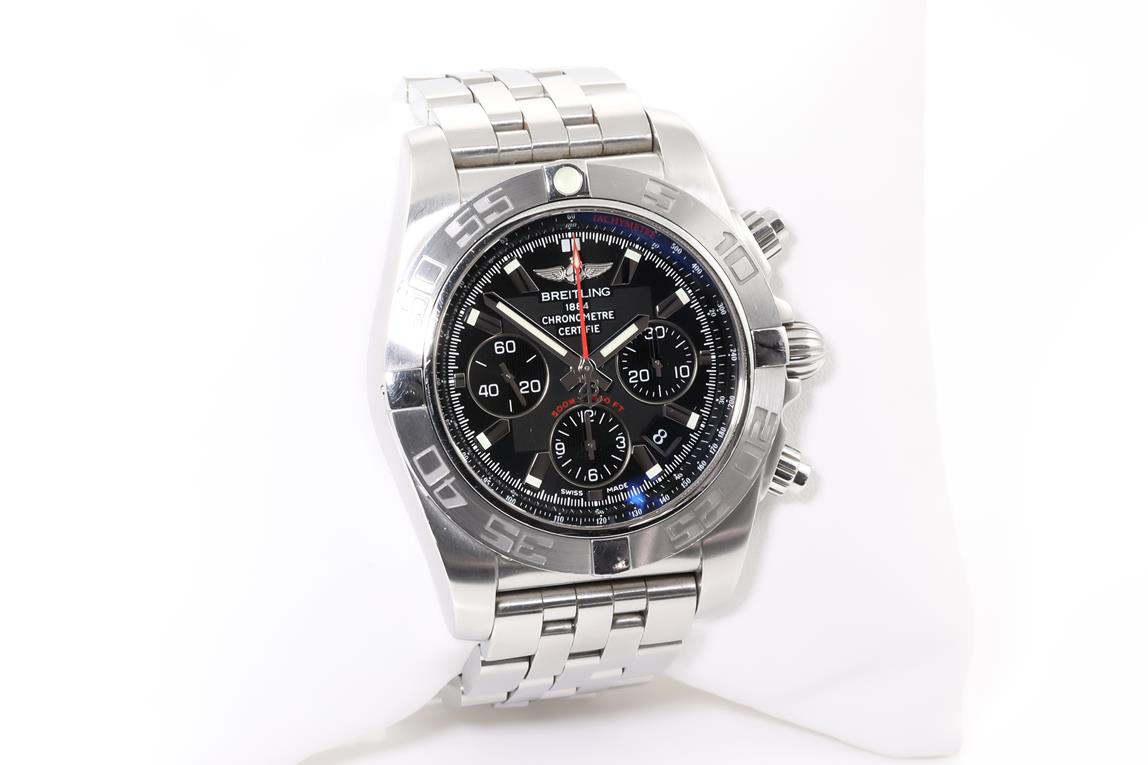 Breitling Chronomat 44 stainless steel automatic mens watch. Black chronograph dial, date, case diameter: 44mm, wrist size: 20cm, Swiss made. Ref #AB0110. With Breitling stainless steel bracelet and clasp. With certificate of authenticity, Breitling international warranty booklet 06/10/2012 and Breitling box. 3 month FSA warranty (Pre-owned)