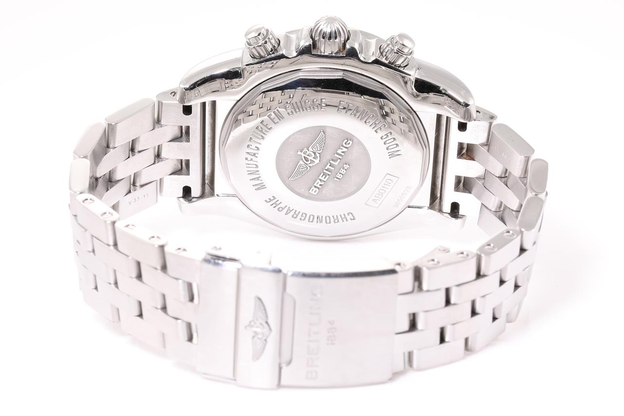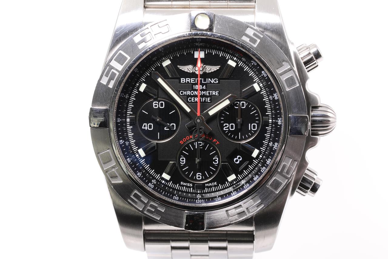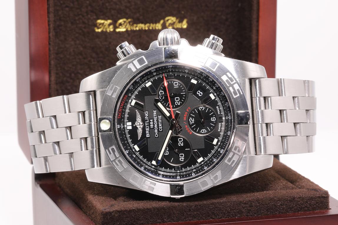 Breitling Chronomat 44 stainless steel automatic mens watch. Black chronograph dial, date, case diameter: 44mm, wrist size: 20cm, Swiss made. Ref #AB0110. With Breitling stainless steel bracelet and clasp. With certificate of authenticity, Breitling international warranty booklet 06/10/2012 and Breitling box. 3 month FSA warranty (Pre-owned)