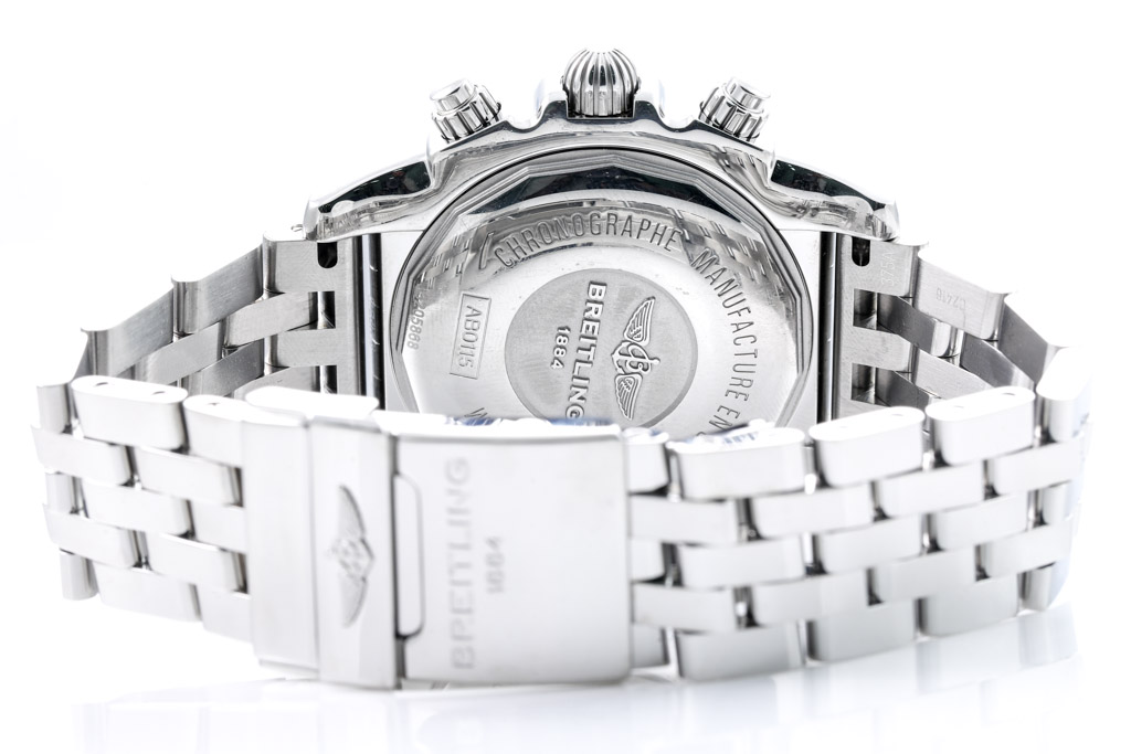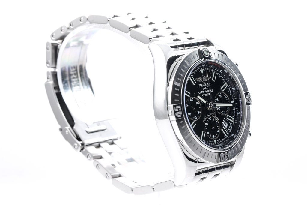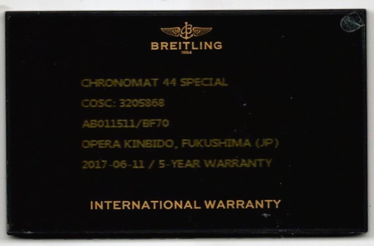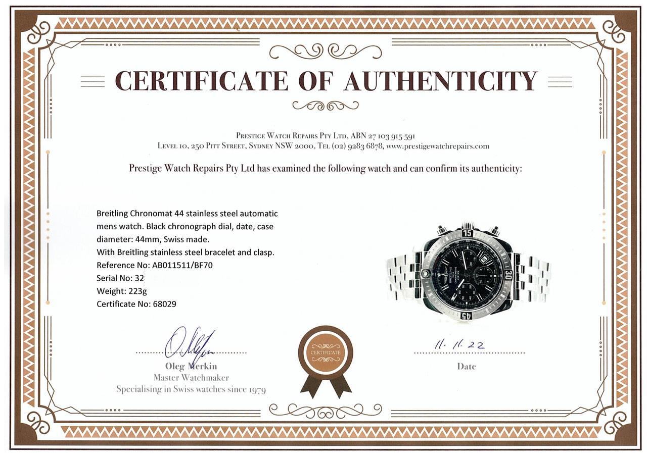 Breitling Chronomat 44 stainless steel automatic mens watch. Black chronograph dial, date, case diameter: 44mm, wrist size: 20cm, Swiss made. Ref# AB011511/BF70. With Breitling stainless steel bracelet and clasp. With Certificate of Authenticity, Breitling International Warranty Card dated 11/06/2017 and Breitling box. 3 month FSA warranty. (Pre-owned)