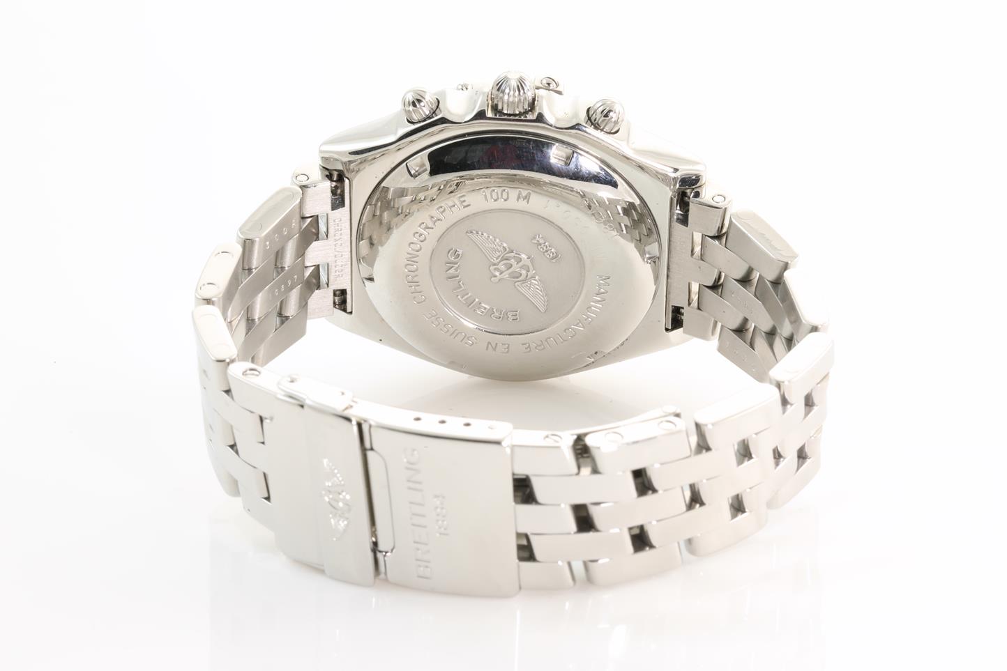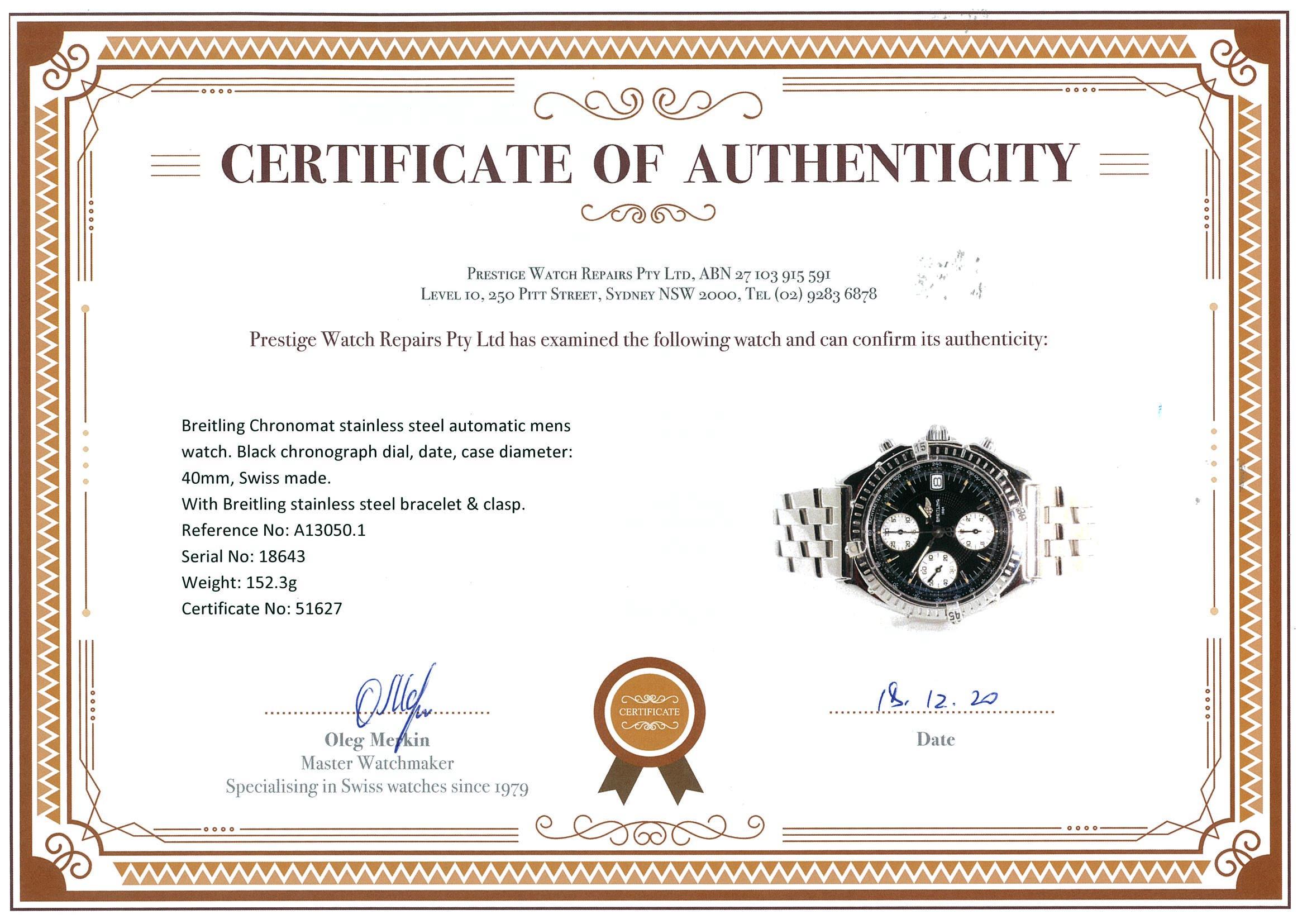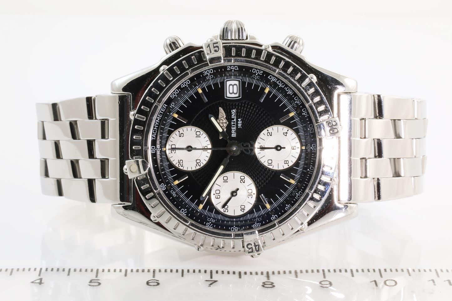 Breitling Chronomat stainless steel automatic mens watch. Black chronograph dial, date, case diameter: 40mm, length: 17cm, Swiss made. Ref# A13050.1. With Breitling stainless steel bracelet and clasp. With certificate of authenticity and Breitling box. 3 Months FSA warranty. (Pre-owned)