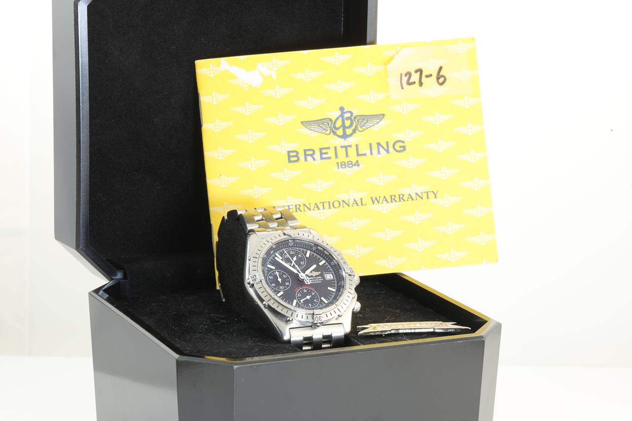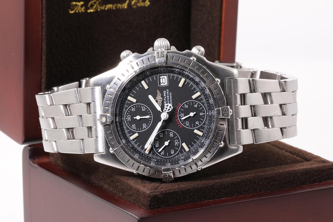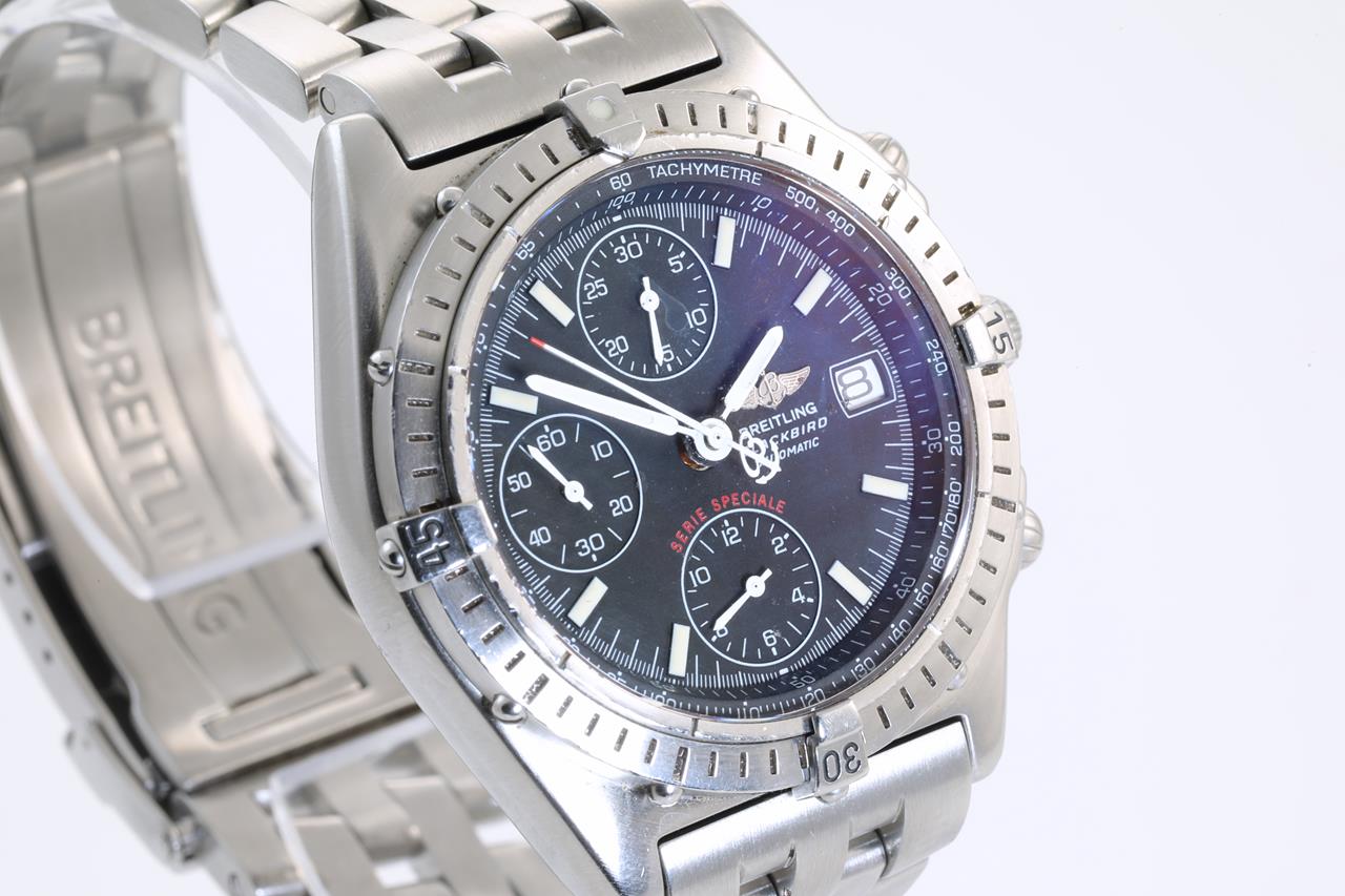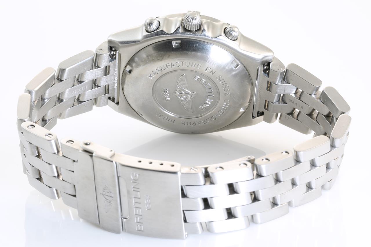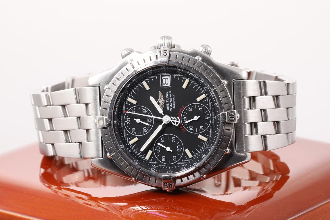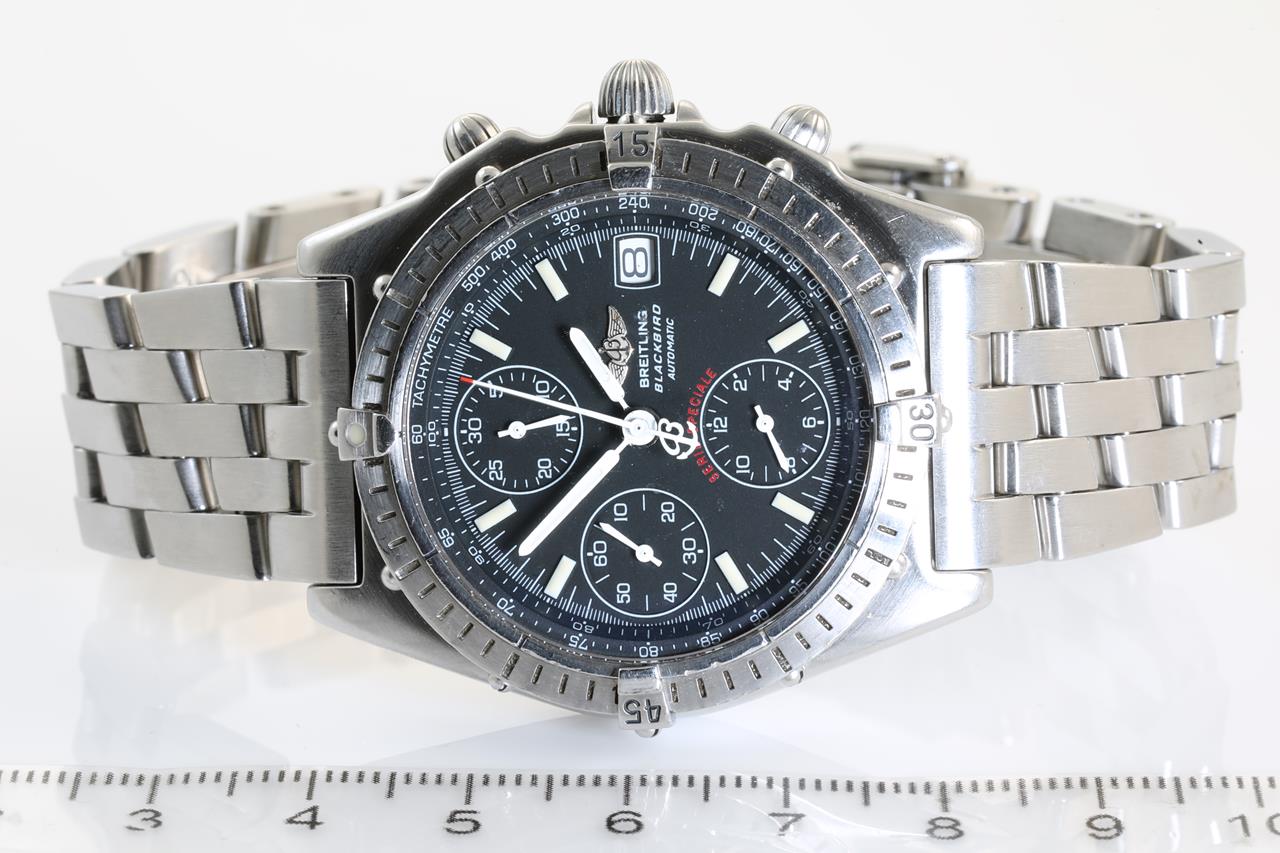 Breitling Chronomat Blackbird stainless steel automatic mens watch. Black chronograph dial, date, case diameter: 40mm, wrist size: 19cm, Swiss made. Ref# A130501. With Breitling bracelet and clasp and Breitling box. With certificate of authenticity. 6 Months Watchmaker Warranty from the date of full service. (Pre-owned)
