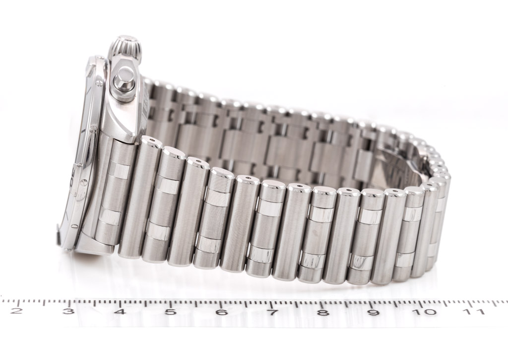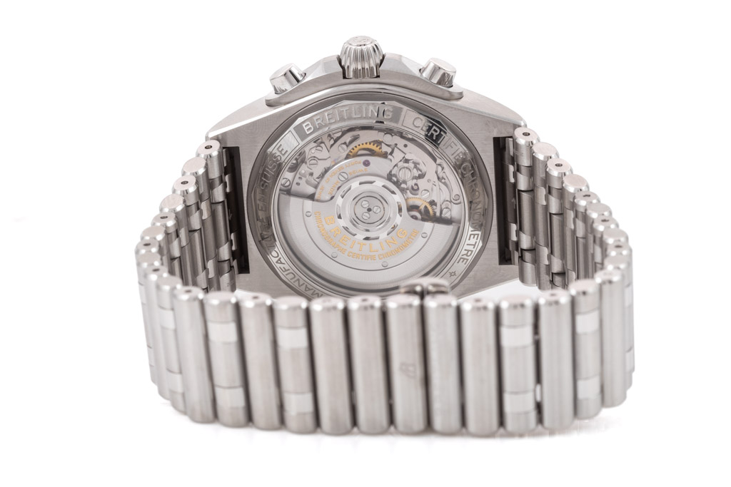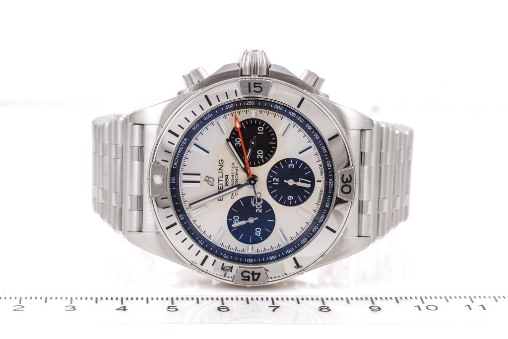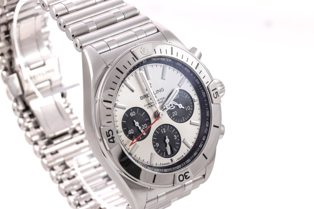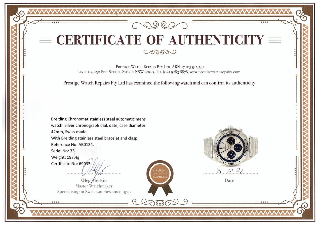 Breitling Chronomat stainless steel automatic mens watch. Silver chronograph dial, date, case diameter: 42mm, wrist size: 20cm, Swiss made. Ref# AB0134. With Breitling stainless steel bracelet and clasp. With Certificate of Authenticity, Breitling International Warranty Card and Breitling box. 3 month FSA warranty. (Pre-owned)