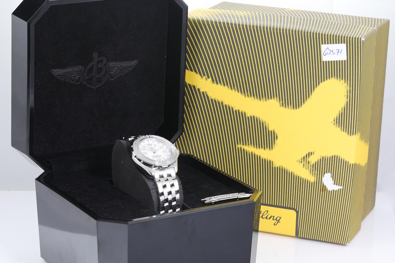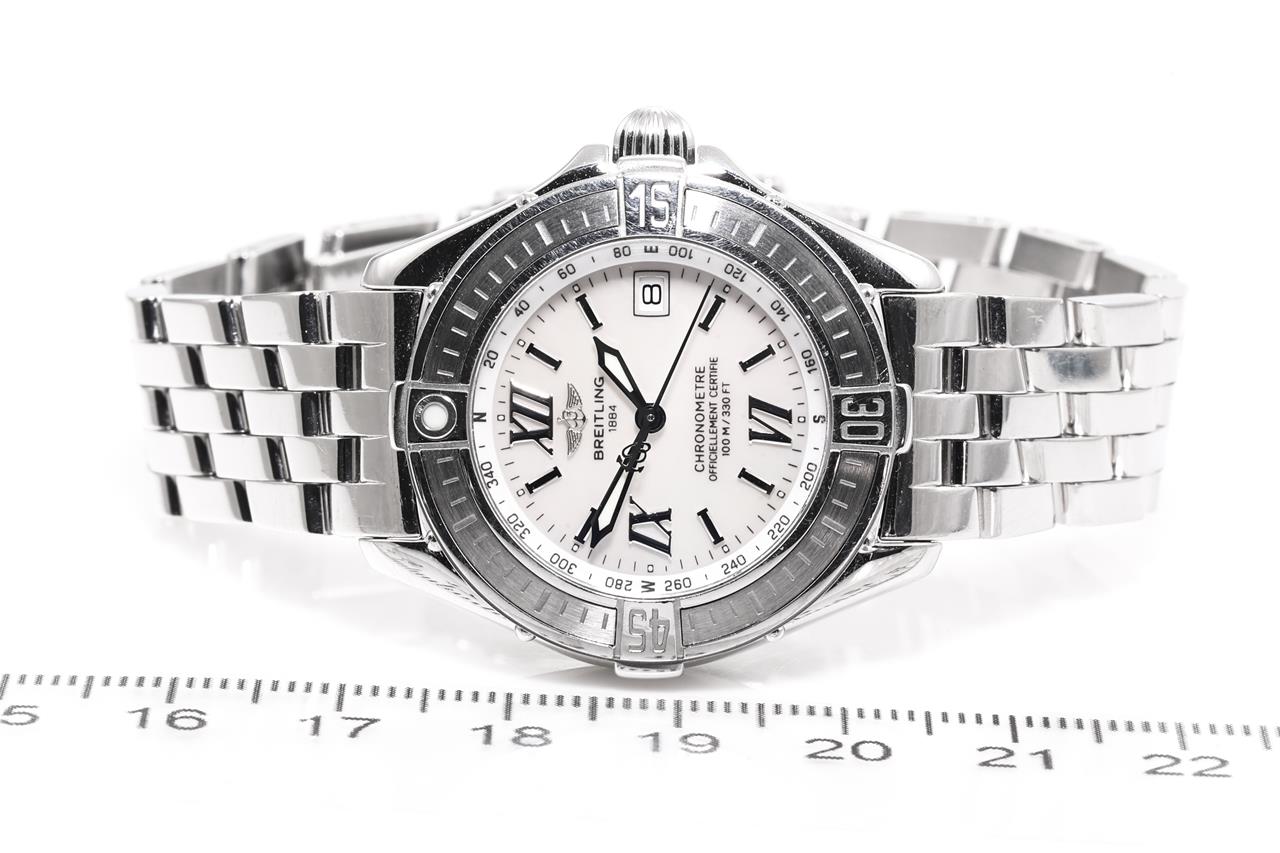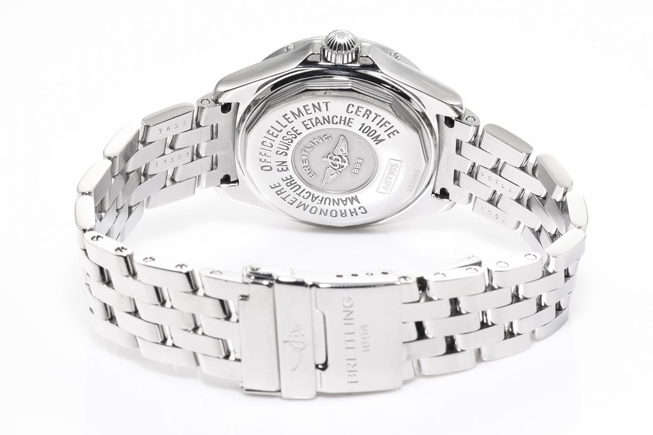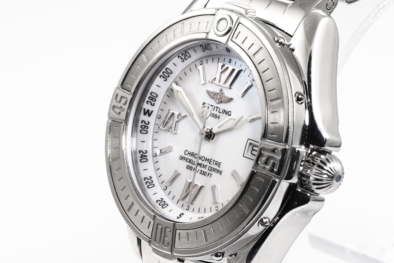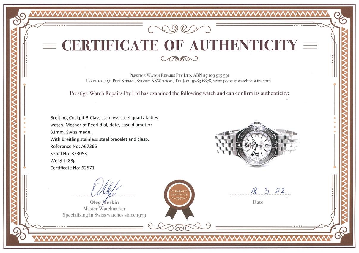 Breitling Cockpit B-Class stainless steel quartz ladies watch. Mother of Pearl dial, date, case diameter: 31mm, wrist size: 17cm, Swiss made. Ref# A67365. With Breitling stainless steel bracelet and clasp. With Certificate of Authenticity, Breitling International Warranty Booklet and Breitling box. 3 month FSA warranty. (Pre-owned)
