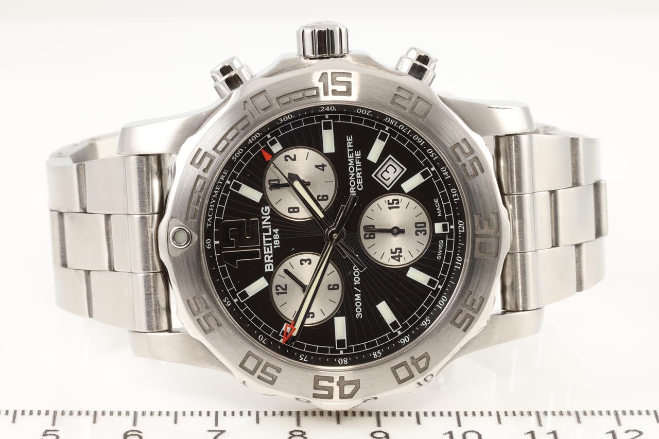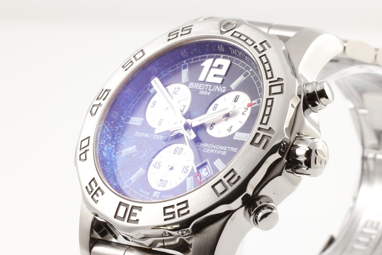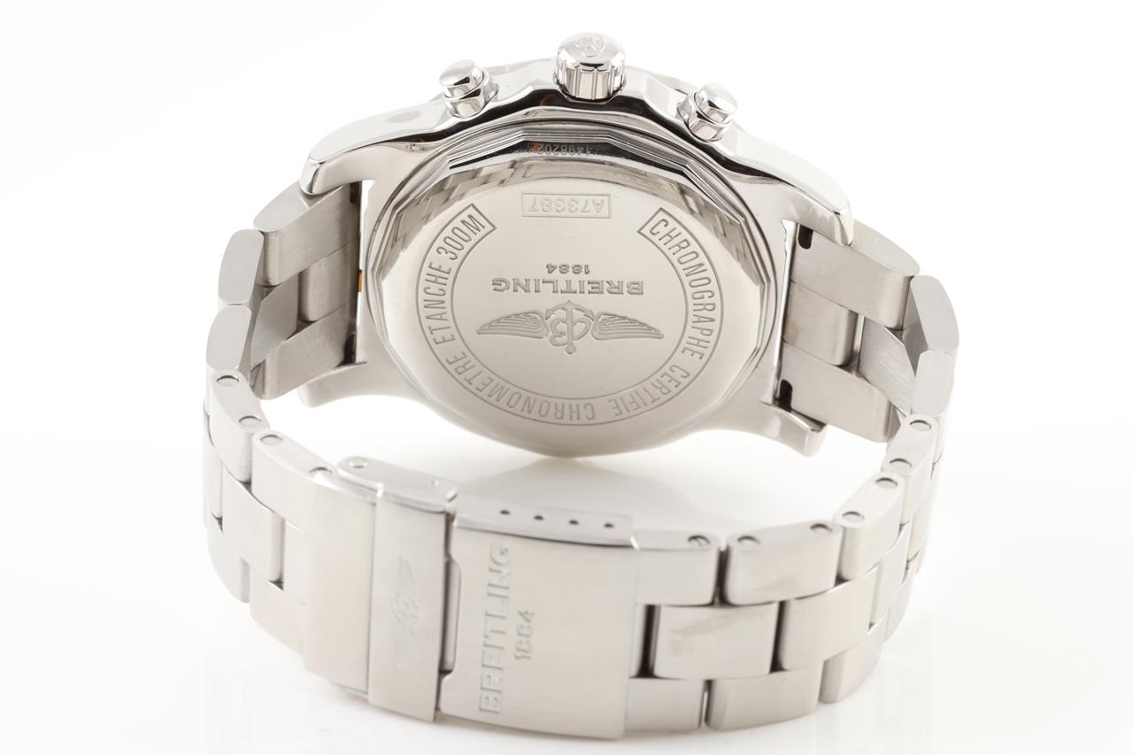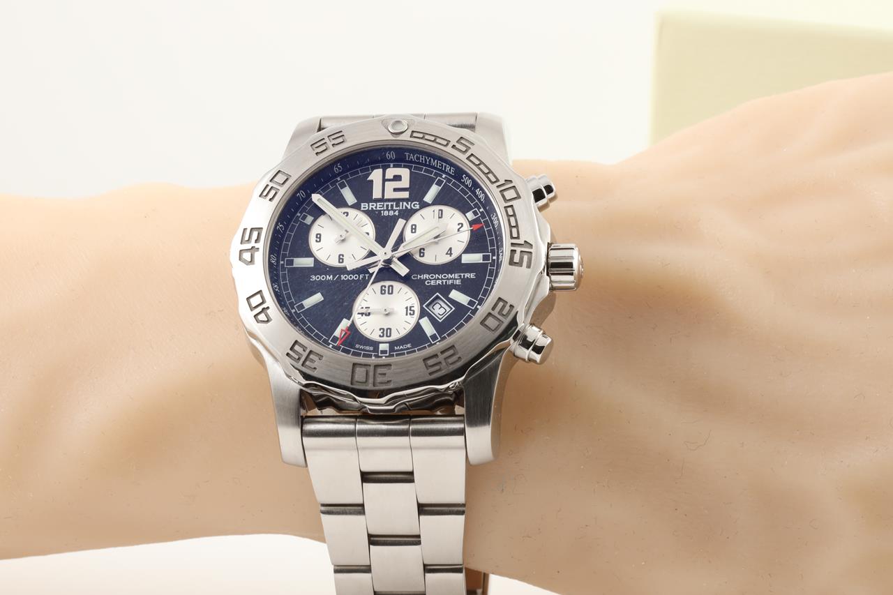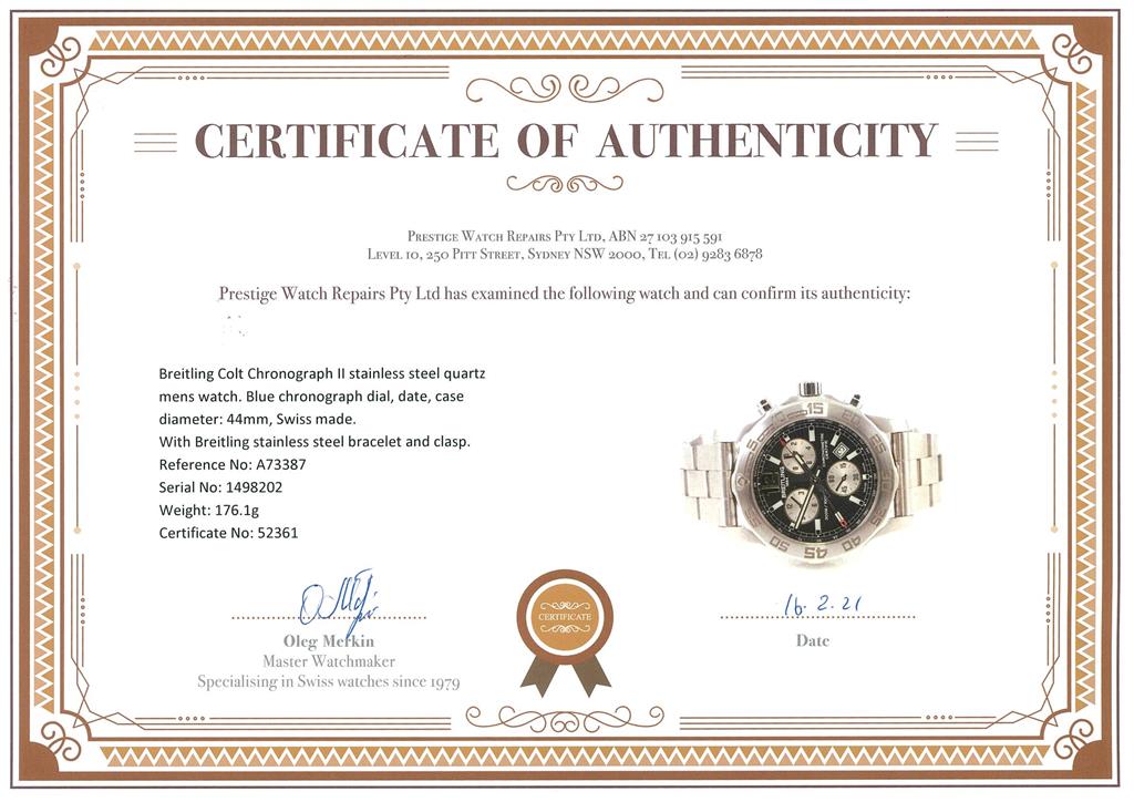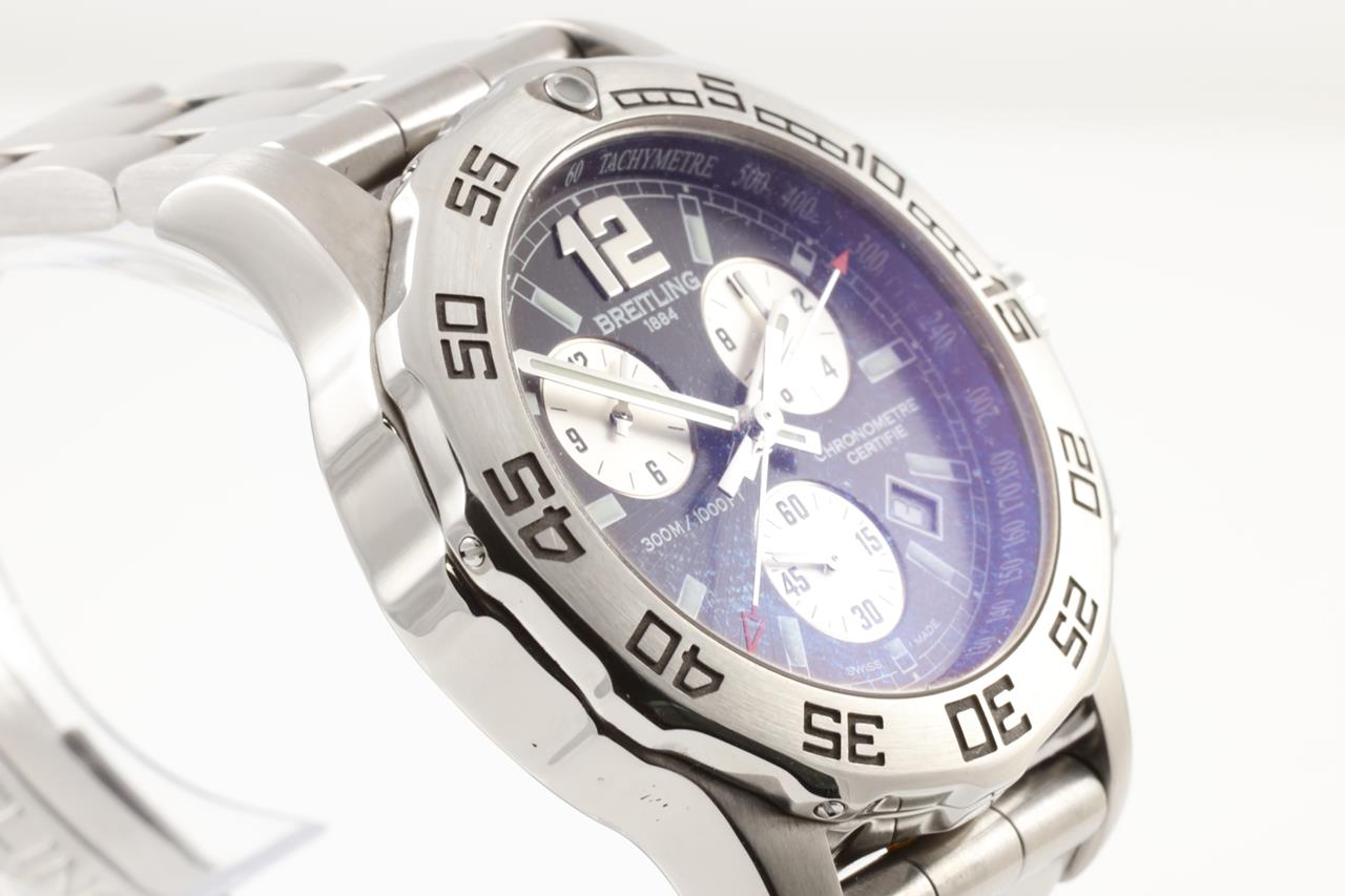 Breitling Colt Chronograph II stainless steel quartz mens watch. Blue chronograph dial, date, case diameter: 44mm, wrist size: 18cm, Swiss made. Ref # A73387. With Breitling stainless steel bracelet and clasp. With Certificate of authenticity and Breitling box. 3 month FSA warranty. (New)