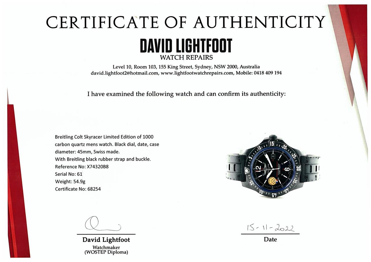 Breitling Colt Skyracer Limited Edition of 1000 carbon quartz mens watch. Black dial, date, case diameter: 45mm, strap length: 23.5cm, Swiss made. Ref# X74320B8. With Breitling black rubber strap and buckle. With Certificate of Authenticity, Breitling International E-warranty Card dated: 24/07/2018 and Breitling box. 3 month FSA warranty. (Pre-owned)