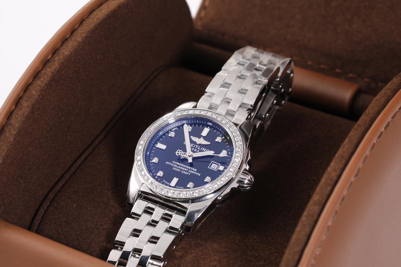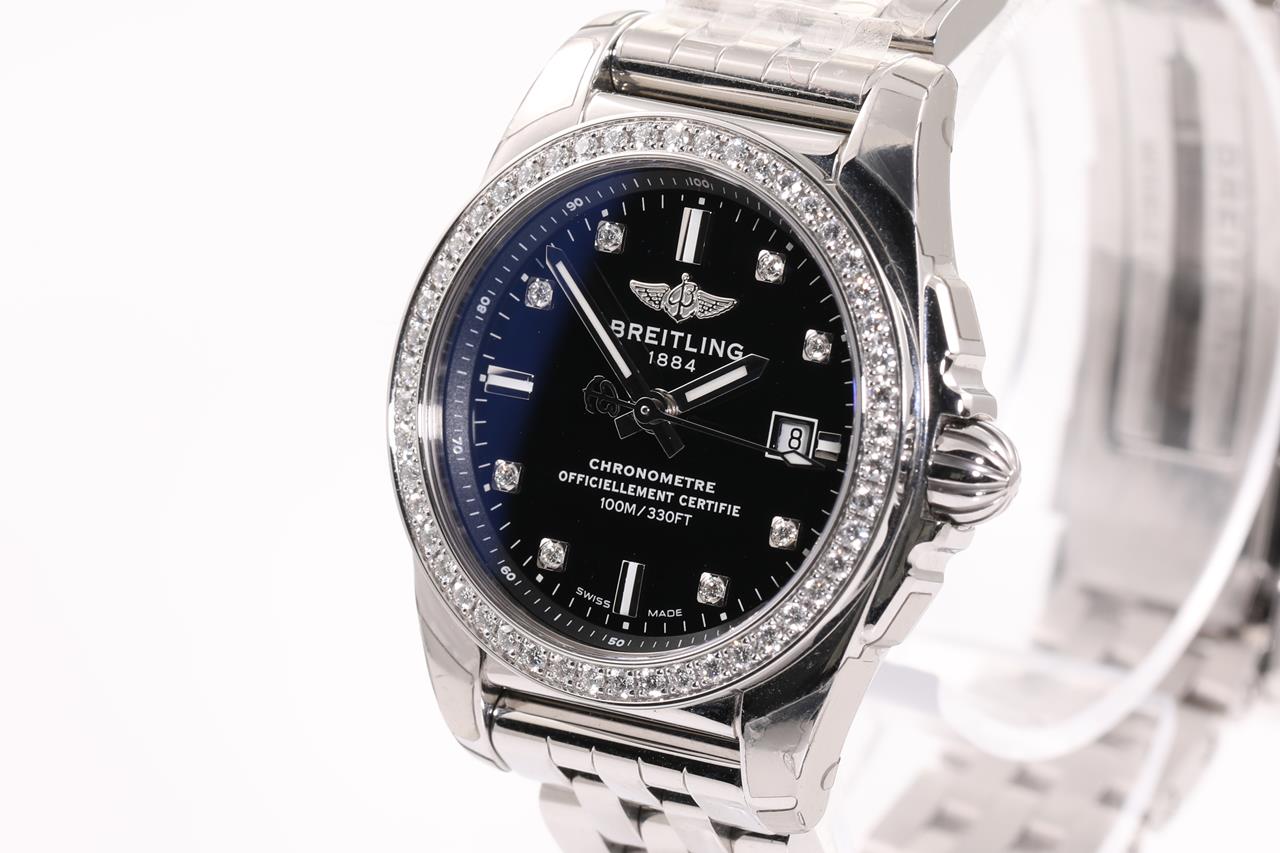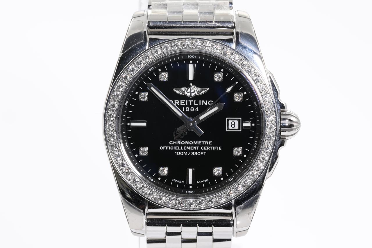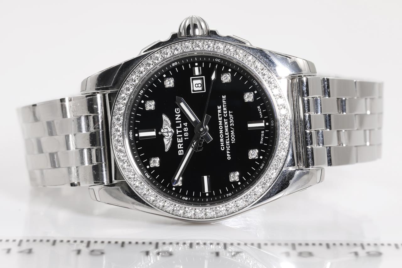 Breitling Galactic stainless steel quartz ladies watch, Black dial, Diamond indicators, Diamond set bezel, date, case diameter: 29mm, wrist size: 16cm, Swiss made. Note: minor scratches due to being display stock. Ref# A7234853/BE50/791A. With Breitling stainless steel bracelet and clasp. With Breitling box. 3 month FSA warranty. (As New)