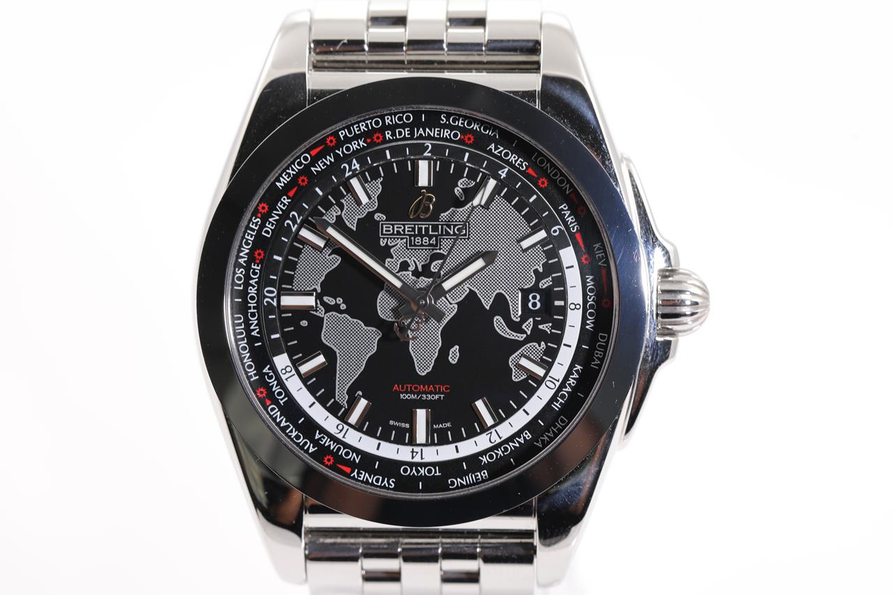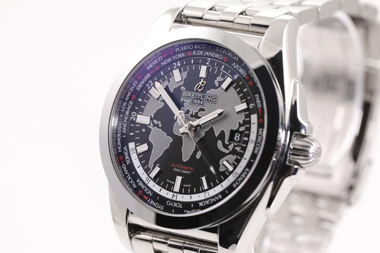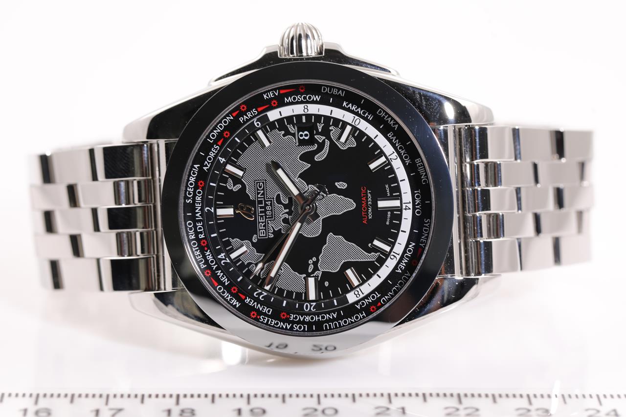 Breitling Galactic Unitime World Time stainless steel automatic mens watch. Black dial, date, case diameter: 44mm, wrist size: 20cm, Swiss made. Note: minor scratches on case and bracelet due to being display stock. Ref# WB3510U4/BD94/375A. With Breitling stainless steel bracelet and clasp. With Breitling box. 3 month FSA warranty. (As New)