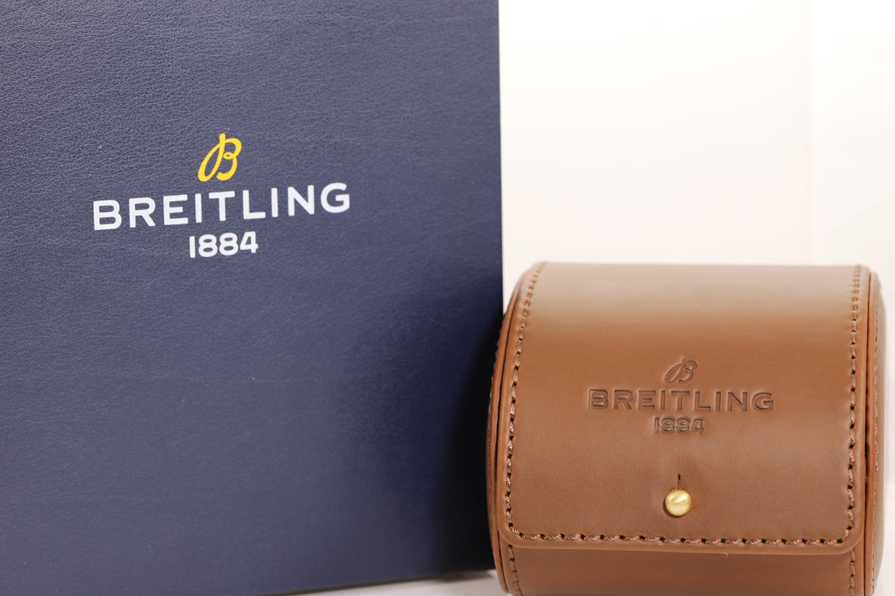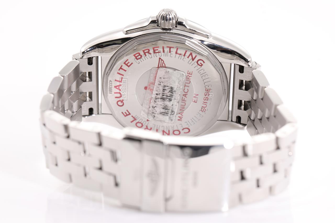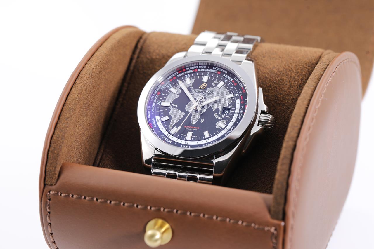 Breitling Galactic Unitime World Time stainless steel automatic mens watch. Black dial, date, case diameter: 44mm, wrist size: 20cm, Swiss made. Note: minor scratches on case and bracelet due to being display stock. Ref# WB3510U4/BD94/375A. With Breitling stainless steel bracelet and clasp. With Breitling box. 3 month FSA warranty. (As New)