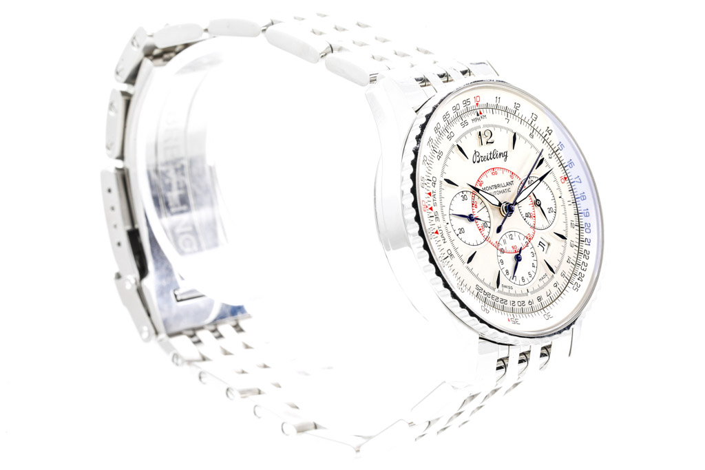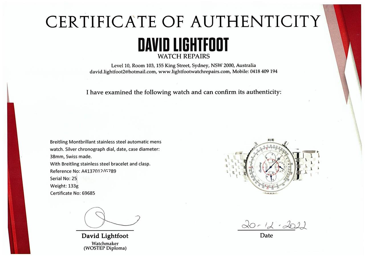 Breitling Montbrillant stainless steel automatic mens watch. Silver chronograph dial, date, case diameter: 38mm, wrist size: 19cm, Swiss made. Ref# A4137012/G789. With Breitling stainless steel bracelet and clasp. With Certificate of Authenticity, Breitling International E-warranty card dated 09/04/2018 and Breitling case. 3 month FSA warranty. (Pre-owned)