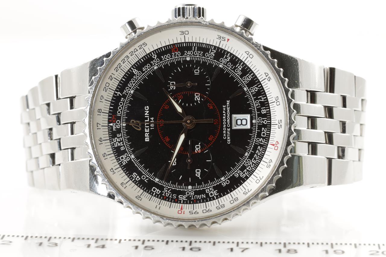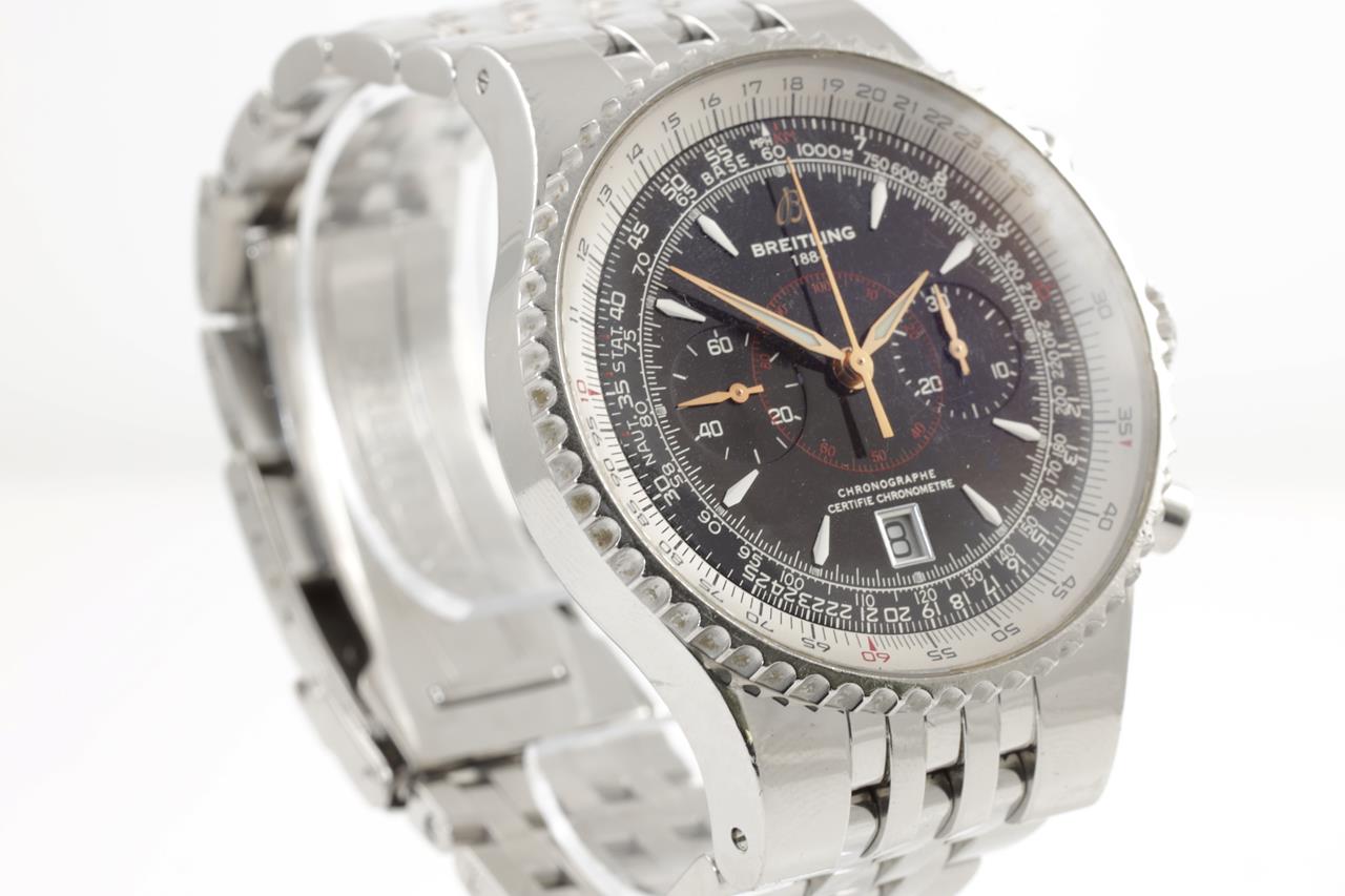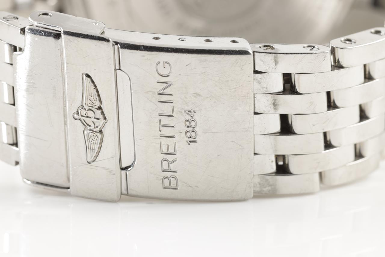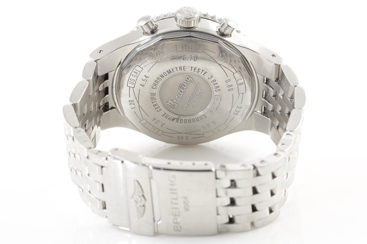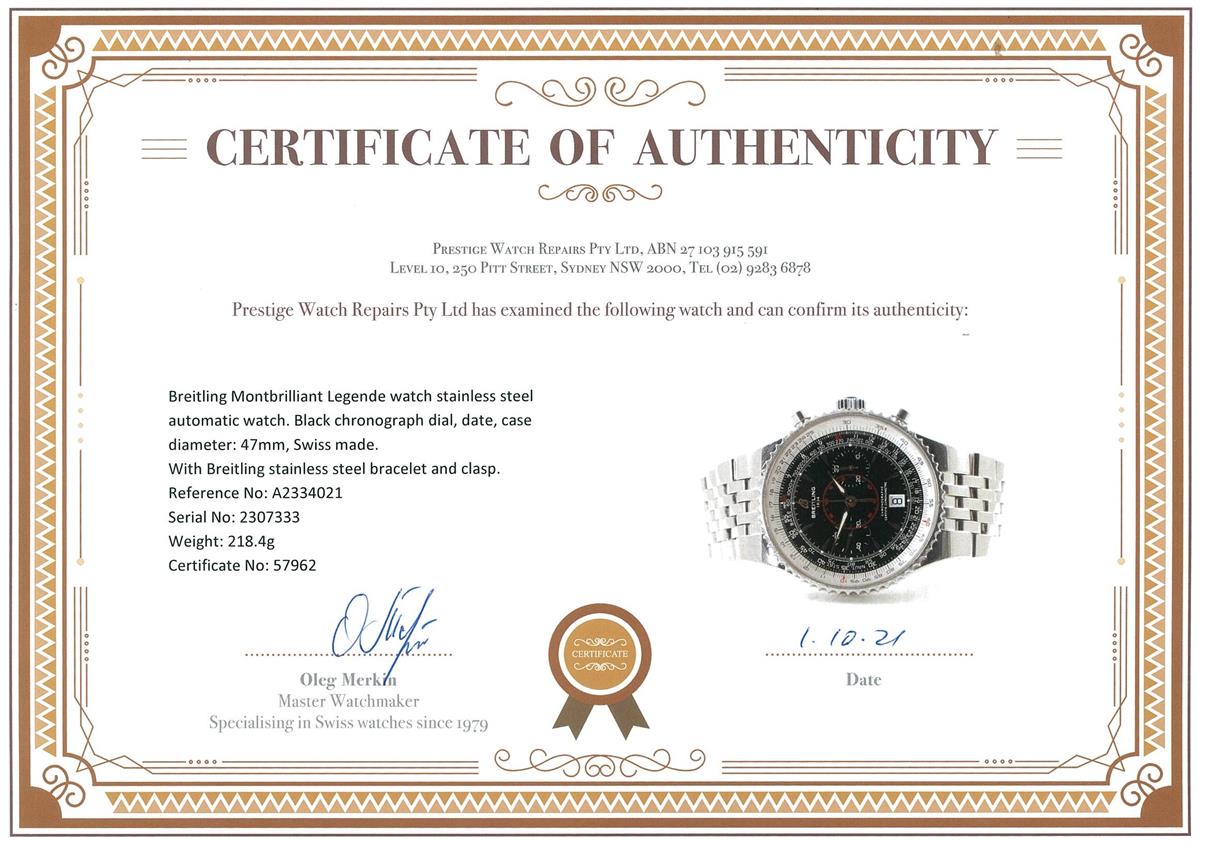 Breitling Montbrilliant Legende watch stainless steel automatic watch. Black chronograph dial, date, case diameter: 47mm, wrist size: 18.5cm, Swiss made. Ref# A2334021. With Breitling stainless steel bracelet and clasp. With certificate of authenticity and Breitling international warranty booklet dated 27/7/2008. 3 month FSA warranty. (Pre-owned)