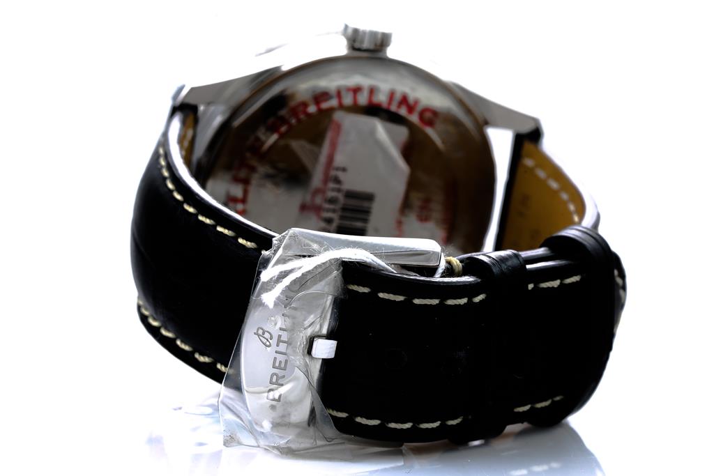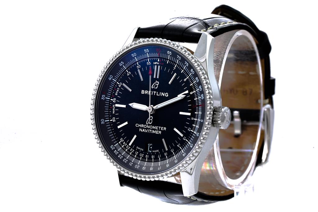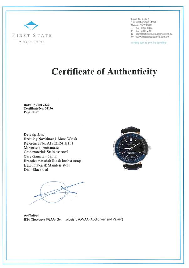 Breitling Navitimer 1 stainless steel automatic mens watch. Black dial, date, case diameter: 38mm, strap length: 18cm, Swiss made. Ref# A17325241B1P1. With Breitling black leather strap and clasp. With Certificate of Authenticity. No box provided. 3 month FSA warranty. (As New, Note: light wear on strap and minor scratches on case due to being display stock)
