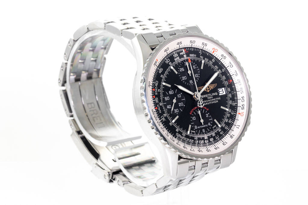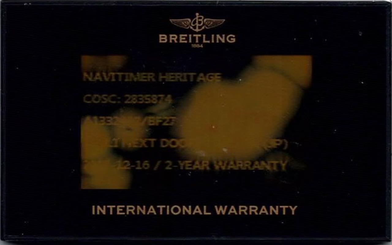 Breitling Navitimer Heritage Special Edition stainless steel automatic mens watch. Blue chronograph dial, date, case diameter: 41mm, wrist size: 18.5cm, Swiss made. Ref# A13324. With Breitling stainless steel bracelet and clasp. With Certificate of Authenticity, Breitling International E-warranty card dated 16/12/2017 and Breitling box. 3 month FSA warranty (Pre-owned)