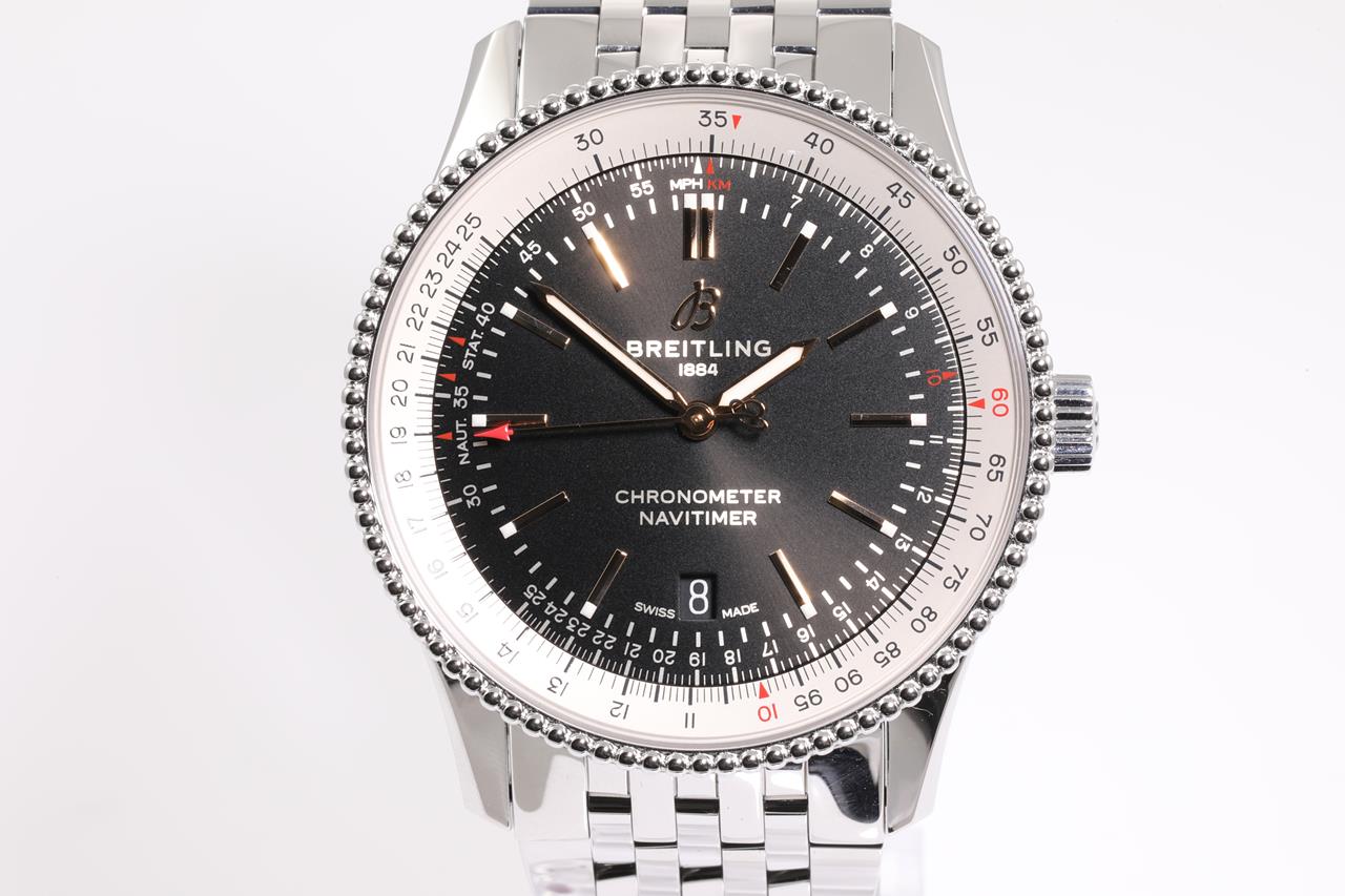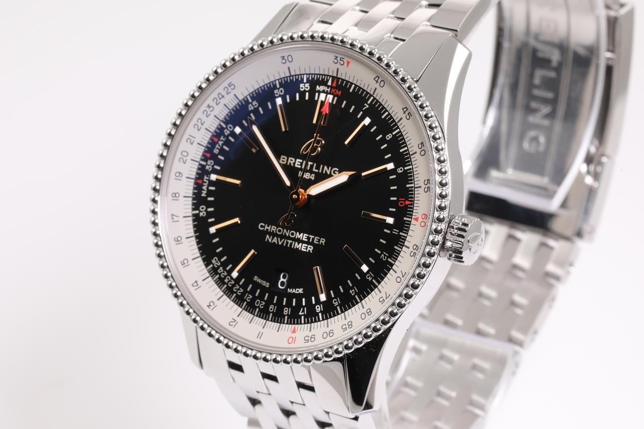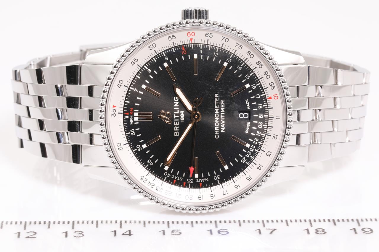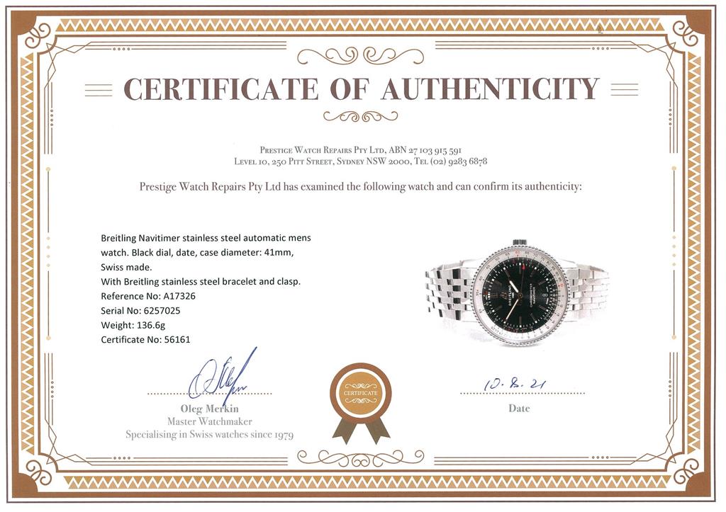 Breitling Navitimer stainless steel automatic mens watch. Black dial, date, case diameter: 41mm, wrist size: 19.5cm, Swiss made. Ref# A17326. With Breitling stainless steel bracelet and clasp. With Certificate of authenticity, Breitling international e-warranty card dated 17/05/2020 and Breitling box. 3 month FSA warranty. (Pre-owned)