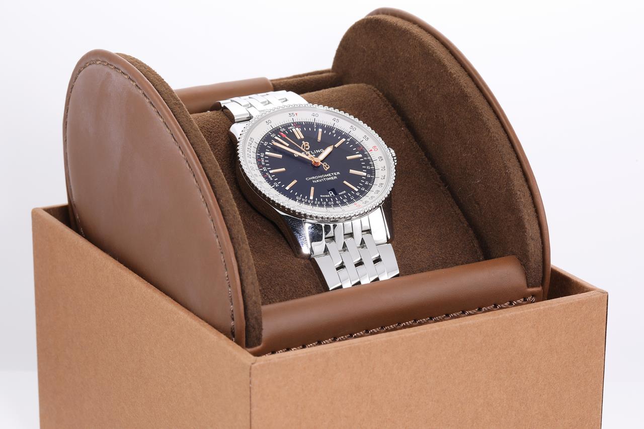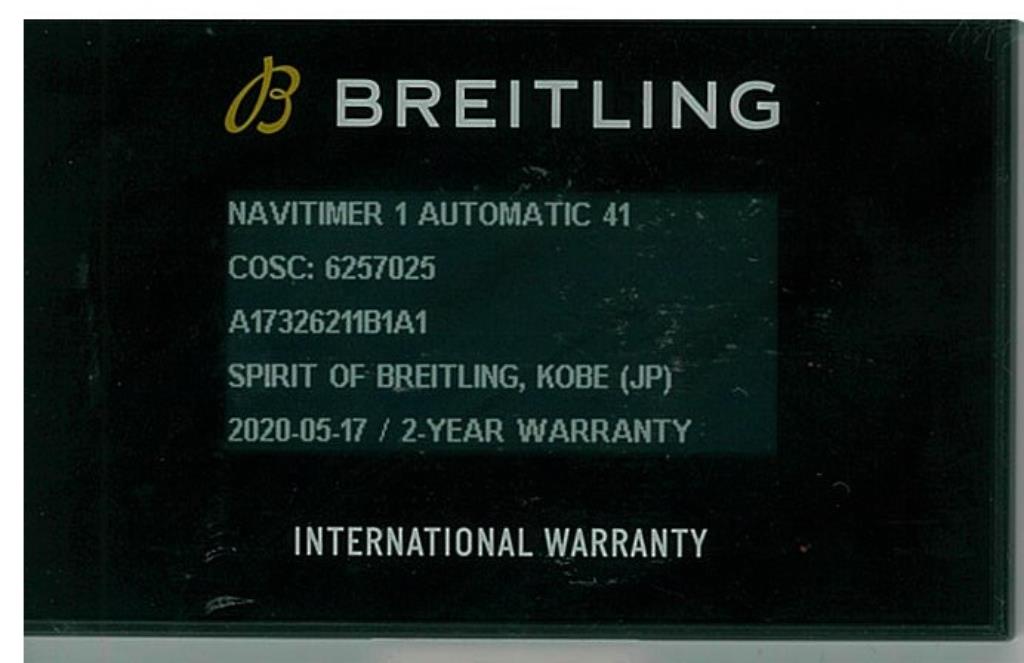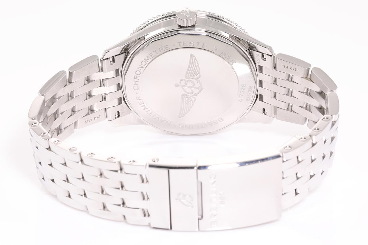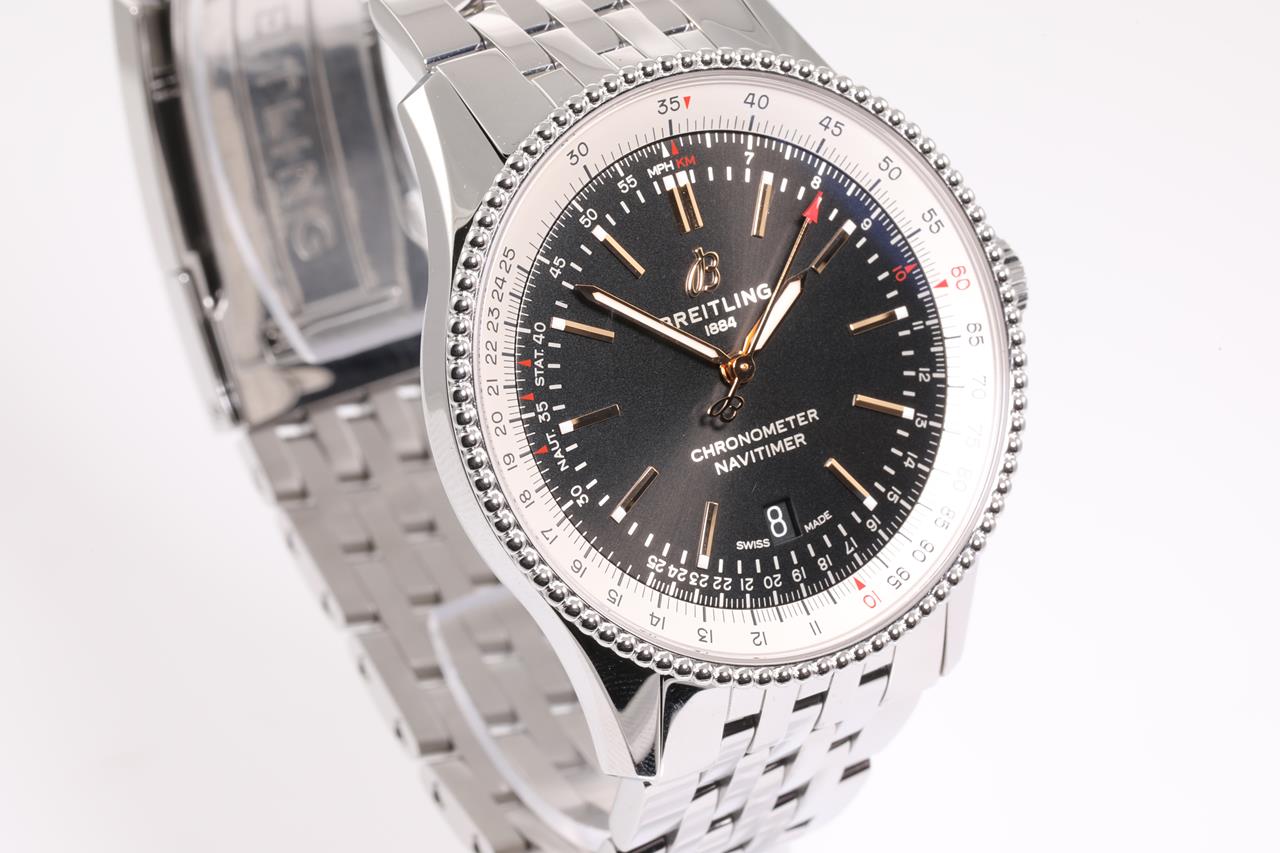 Breitling Navitimer stainless steel automatic mens watch. Black dial, date, case diameter: 41mm, wrist size: 19.5cm, Swiss made. Ref# A17326. With Breitling stainless steel bracelet and clasp. With Certificate of authenticity, Breitling international e-warranty card dated 17/05/2020 and Breitling box. 3 month FSA warranty. (Pre-owned)