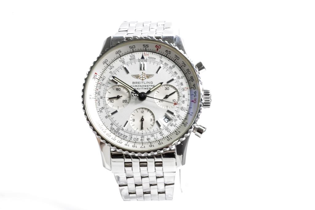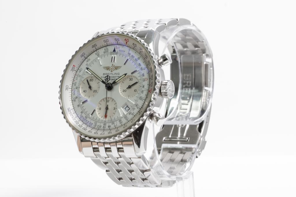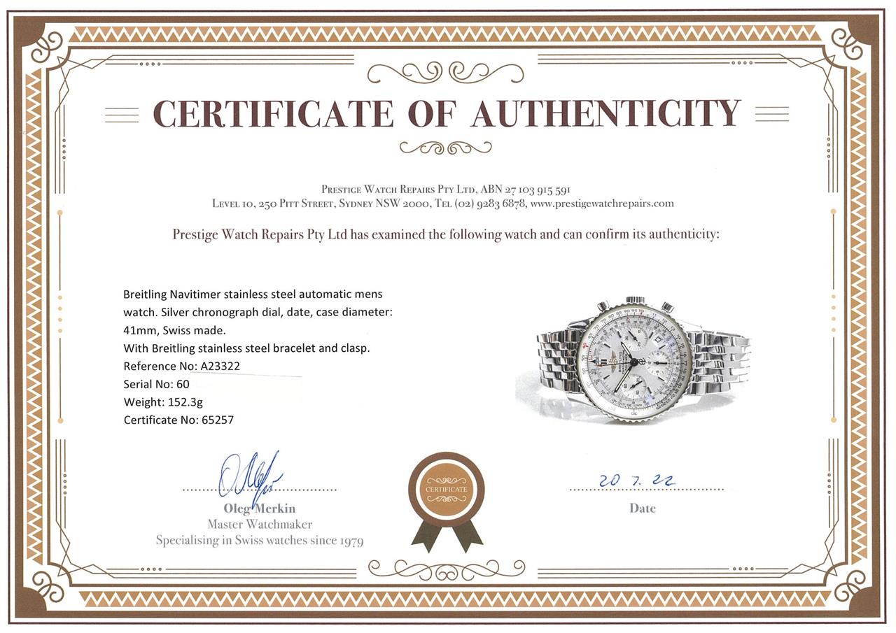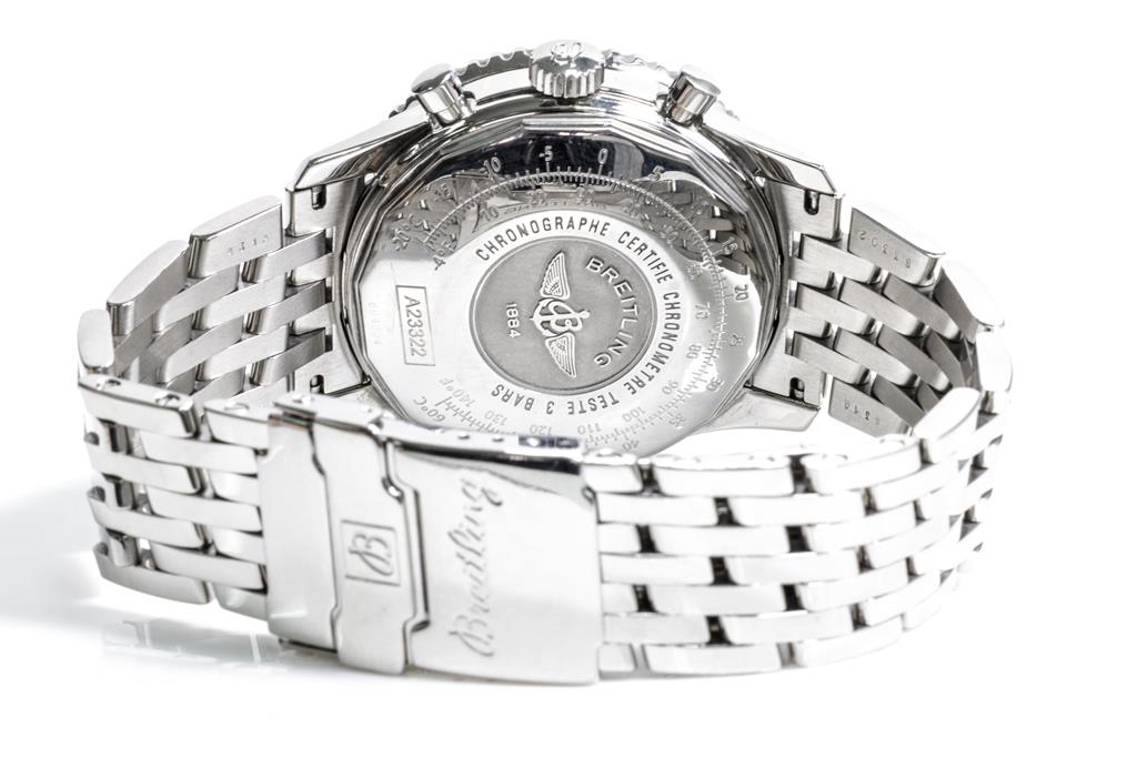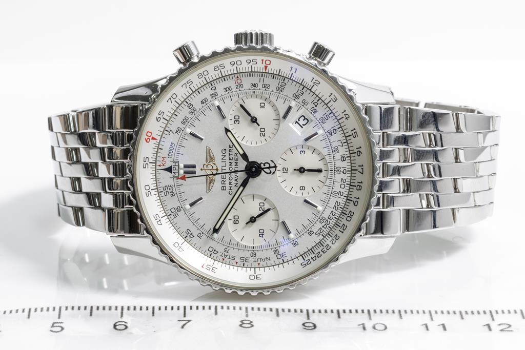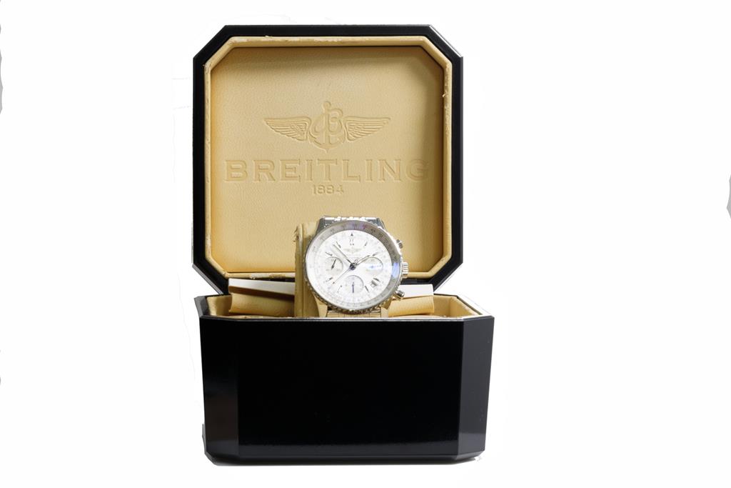 Breitling Navitimer stainless steel automatic mens watch. Silver chronograph dial, date, case diameter: 41mm, wrist size: 19cm, Swiss made. Ref# A23322. With Breitling stainless steel bracelet and clasp. With Certificate of Authenticity, Breitling International Warranty booklet dated 20/06/2006 and Breitling box. 3 month FSA warranty. (Pre-owned)
