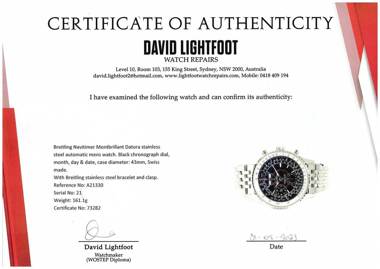 Breitling Navitimer Montbrillant Datora stainless steel automatic mens watch. Black chronograph dial, month, day & date, case diameter: 43mm, wrist size: 19.5cm, Swiss made. Ref# A21330. With Breitling stainless steel bracelet and clasp. With Certificate of Authenticity and Breitling box. 3 month FSA warranty. (Pre-owned)