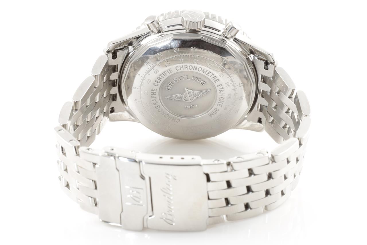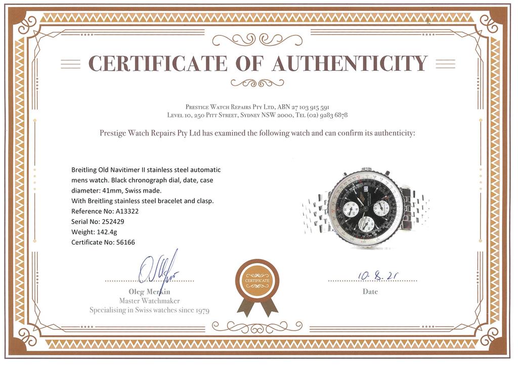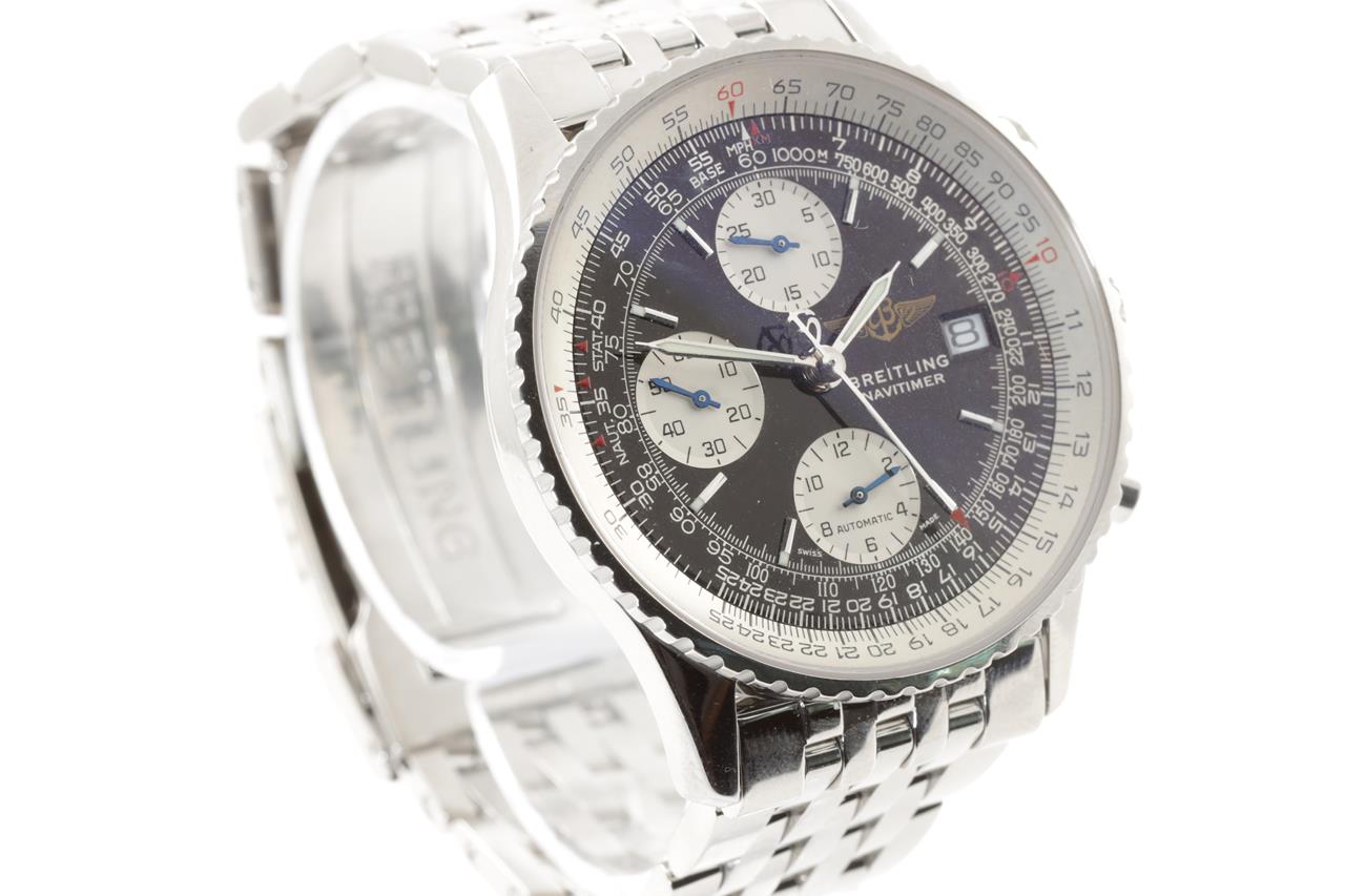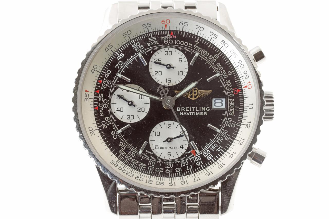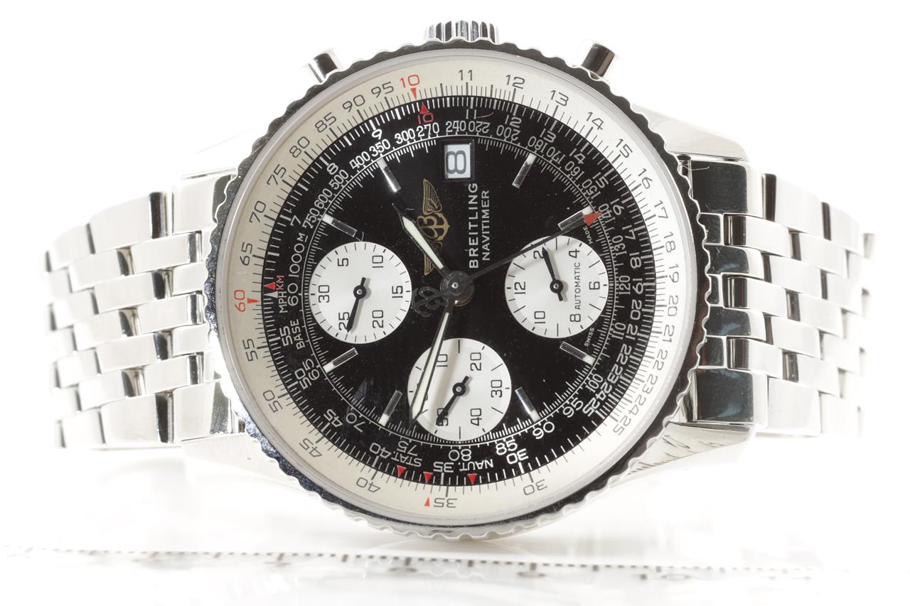 Breitling Old Navitimer II stainless steel automatic mens watch. Black chronograph dial, date, case diameter: 41mm, wrist size: 18cm, Swiss made. Ref# A13322. With Breitling stainless steel bracelet and clasp. With certificate of authenticity, Breitling international warranty certificate booklet dated 23/07/2000 and Breitling box. 3 month FSA warranty. (Pre-owned)