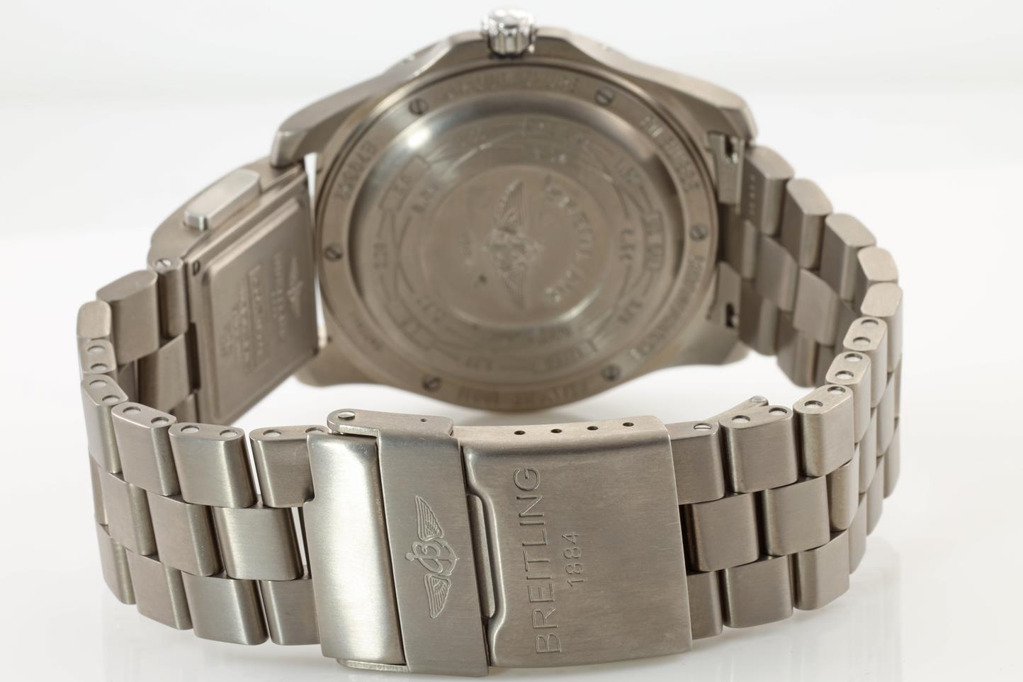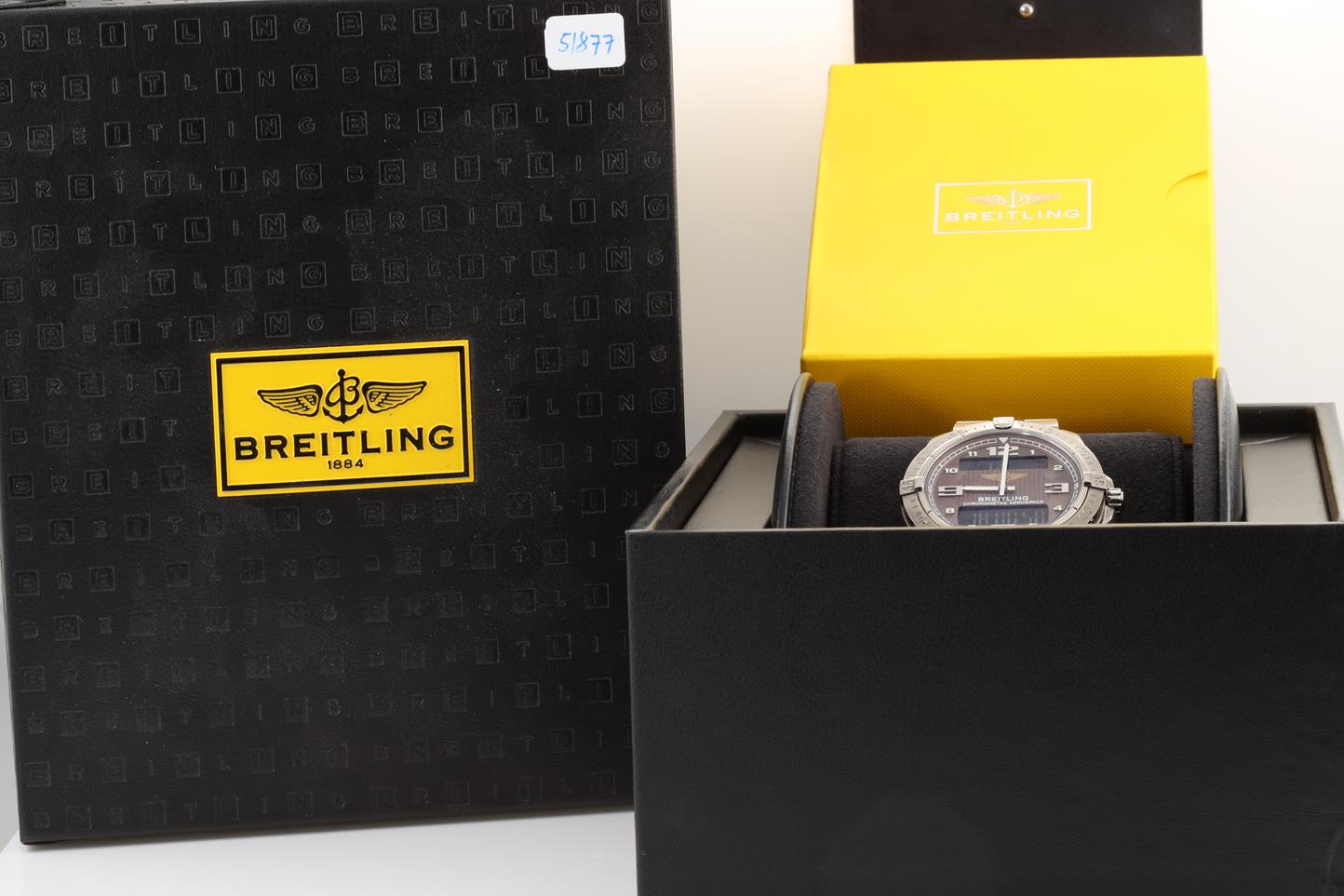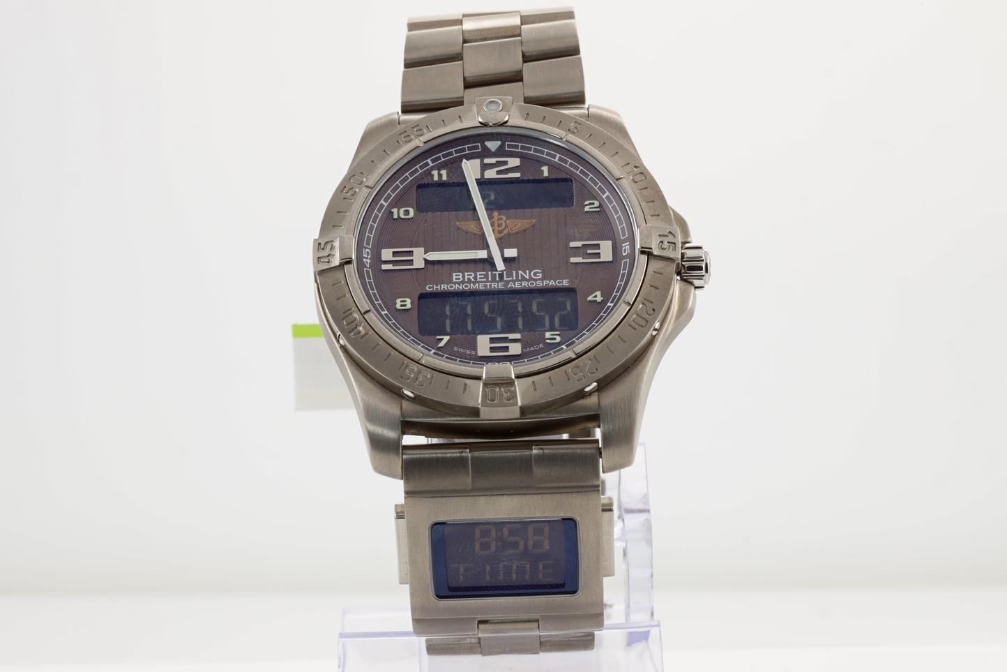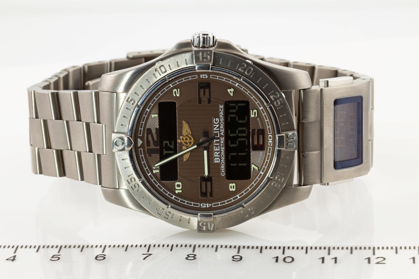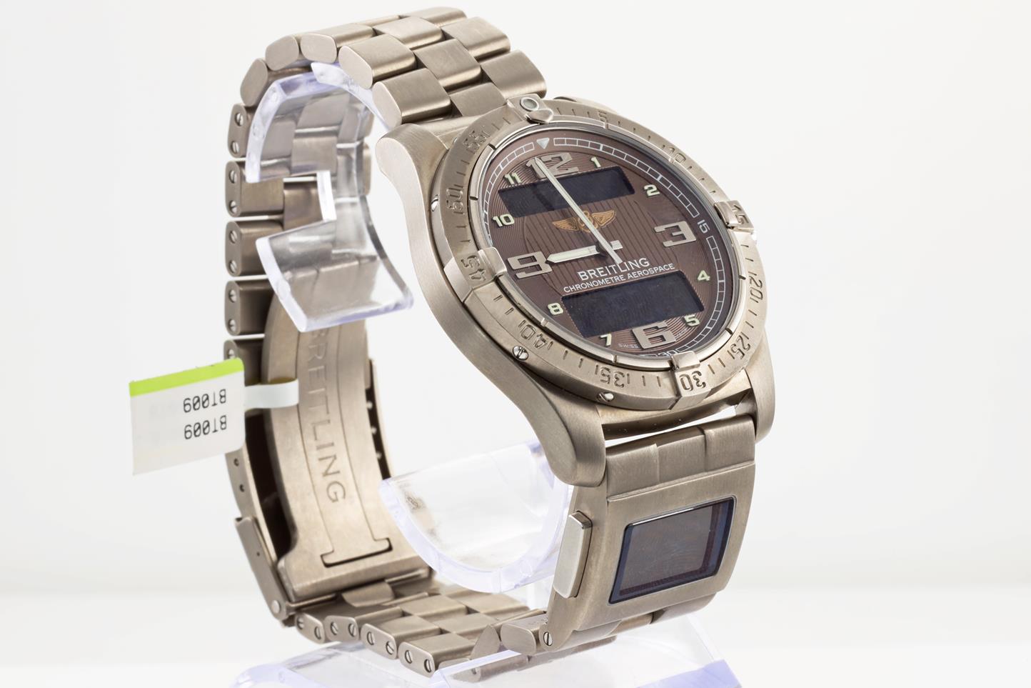 Breitling Professional Aerospace Avantage titanium quartz mens watch. Guilloche bronze dial, electronic & analog LCD digital display, GMT second time zone & alarm feature, case diameter: 42mm, Swiss made. Ref #E7936210/Q572/139E. With Breitling titanium bracelet and clasp. With Breitling instruction manual inside Breitling box. 3 month FSA warranty. (New)