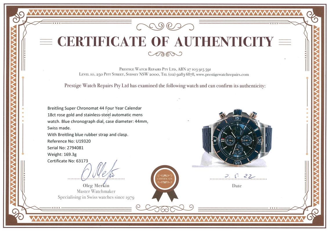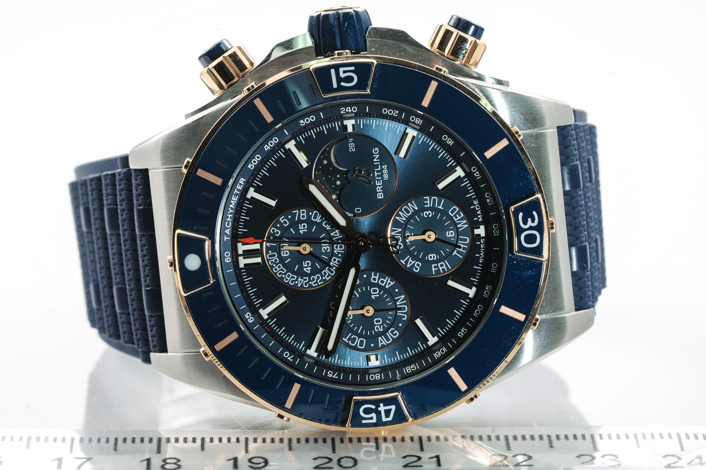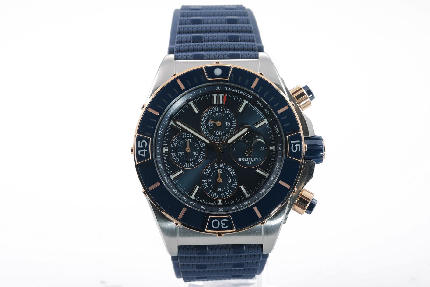 Breitling Super Chronomat 44 Four Year Calendar 18ct rose gold and stainless steel automatic mens watch. Blue chronograph dial, case diameter: 44mm, wrist size: 21cm, Swiss made. Ref# U19320. With Breitling blue rubber strap and clasp. With Certificate of Authenticity and Breitling case. 3 month FSA warranty. (Pre-owned)