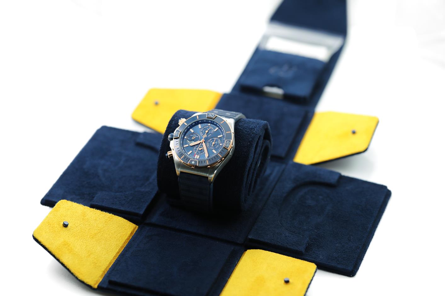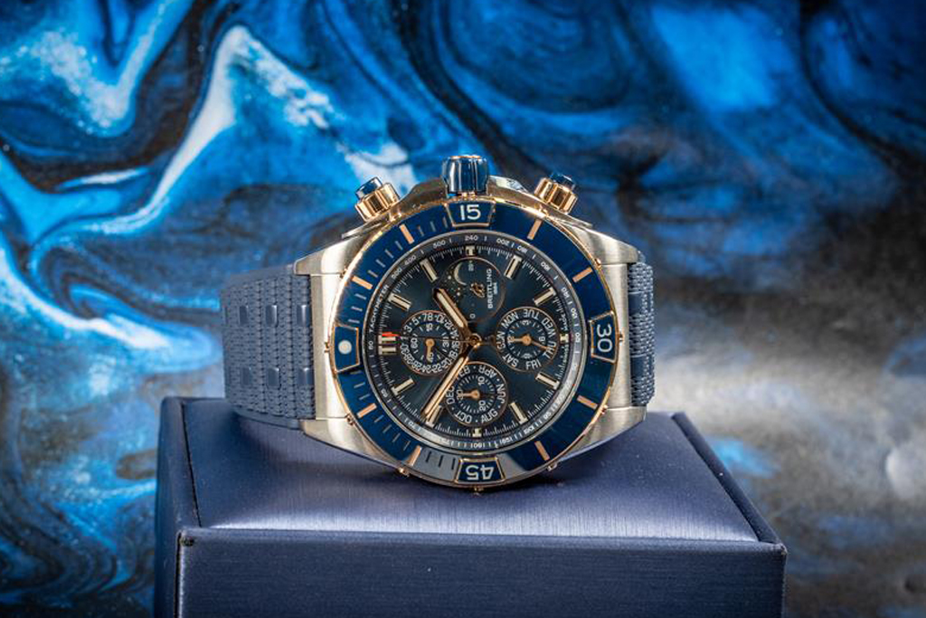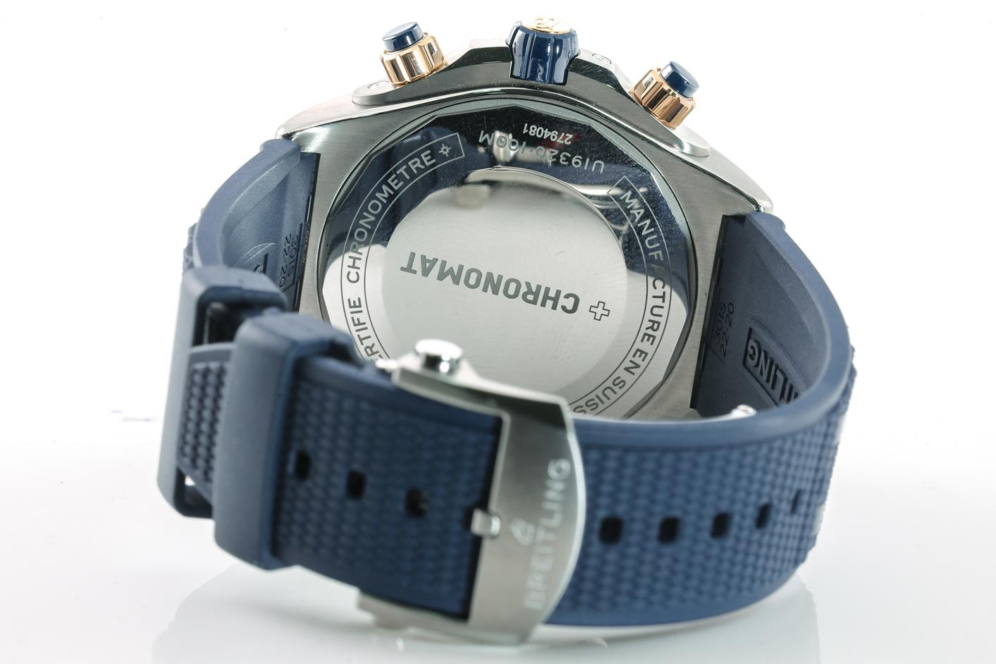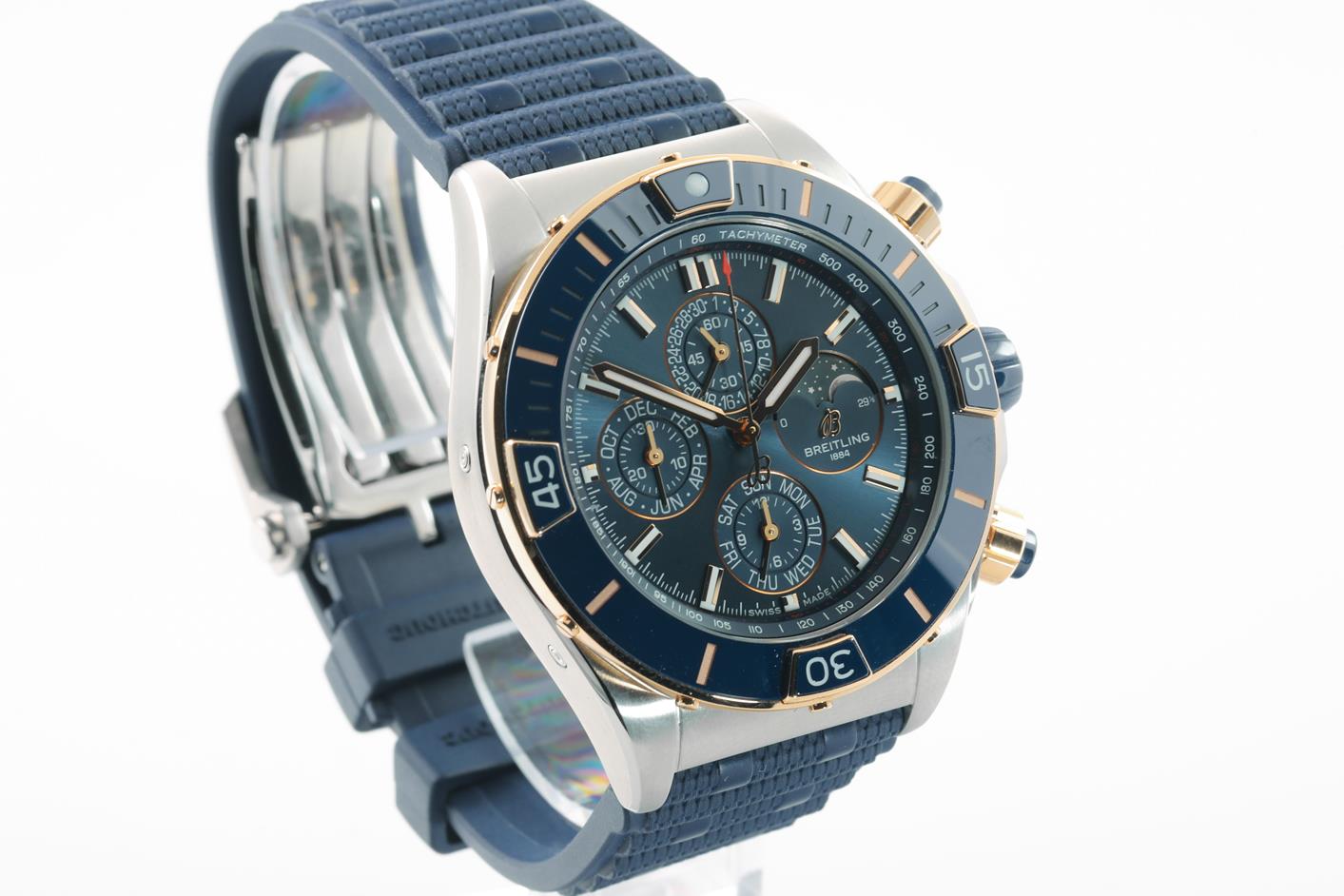 Breitling Super Chronomat 44 Four Year Calendar 18ct rose gold and stainless steel automatic mens watch. Blue chronograph dial, case diameter: 44mm, wrist size: 21cm, Swiss made. Ref# U19320. With Breitling blue rubber strap and clasp. With Certificate of Authenticity and Breitling case. 3 month FSA warranty. (Pre-owned)