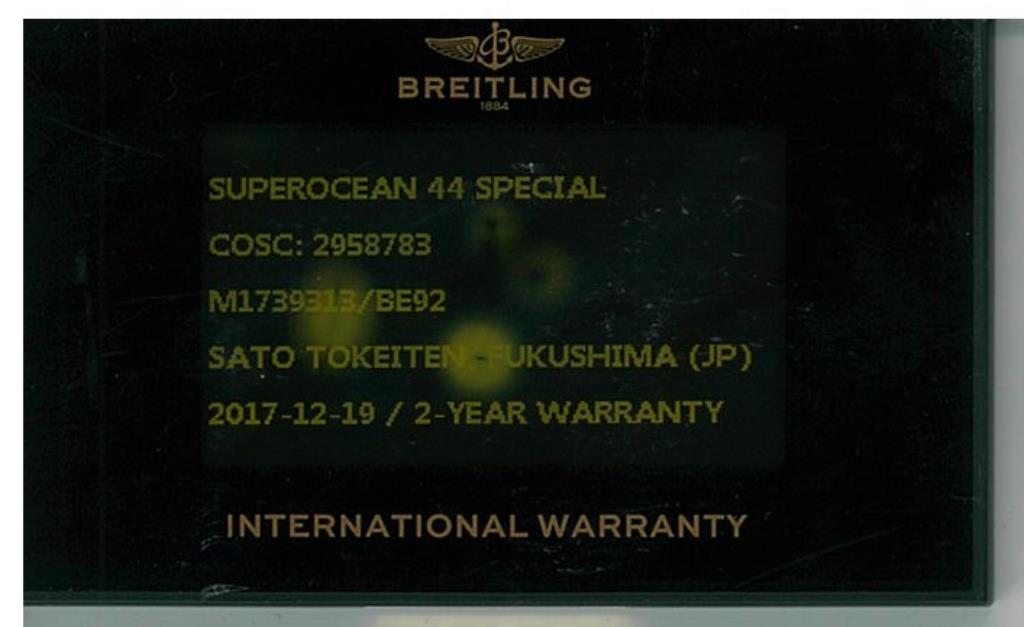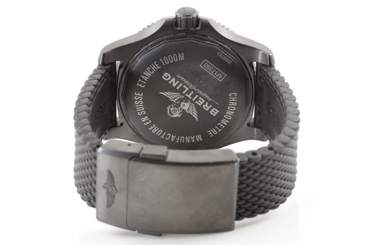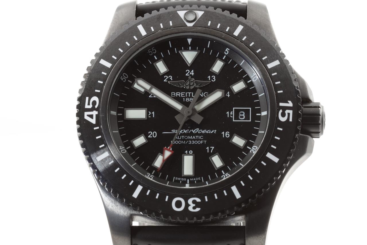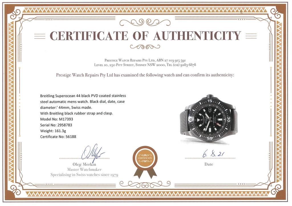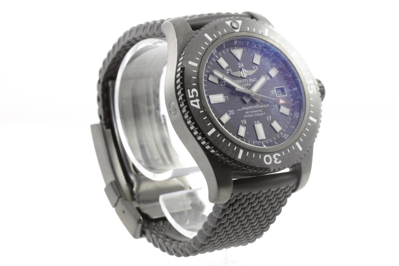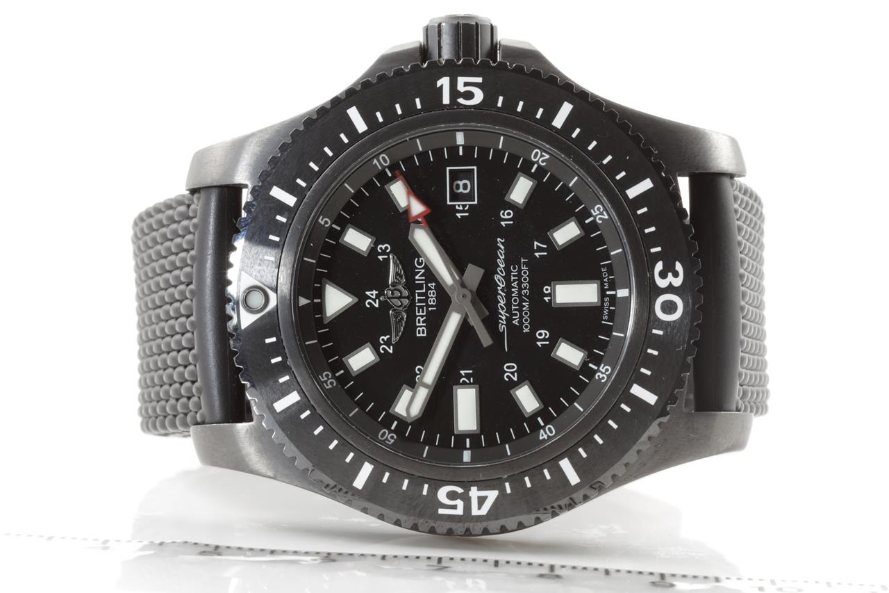 Breitling Superocean 44 black PVD coated stainless steel automatic mens watch. Black dial, date, case diameter:' 44mm, wrist size: 17cm, Swiss made. Ref# M17393. With Breitling black rubber strap and clasp. With Certificate of authenticity, Breitling e-warranty card dated 19/12/2017 and Breitling box. 3 month FSA warranty. (Pre-owned)