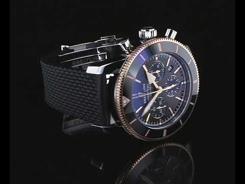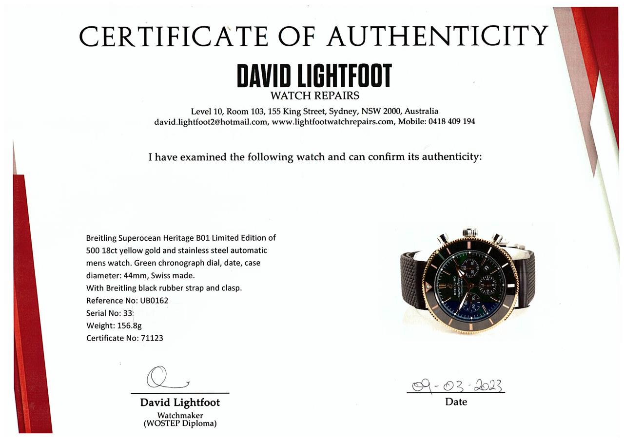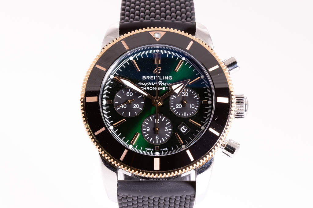 Breitling Superocean Heritage B01 Limited Edition of 500 18ct rose gold and stainless steel automatic men's watch. Green chronograph dial, date, case diameter: 44mm, wrist size: 19.5cm, Swiss made. Ref# UB0162. With Breitling black rubber strap and clasp. With Certificate of Authenticity, Breitling Quick start Guide Warranty Card Holder and Breitling case. 3 month FSA warranty. (Pre-owned)