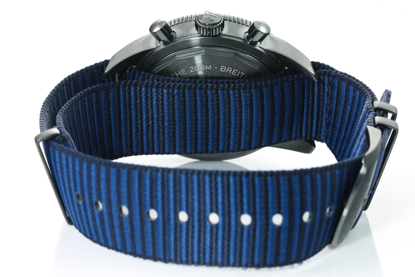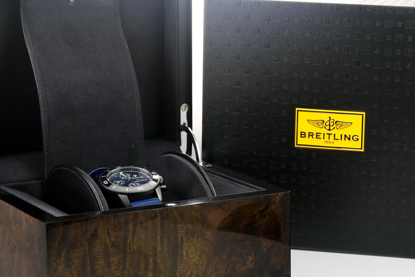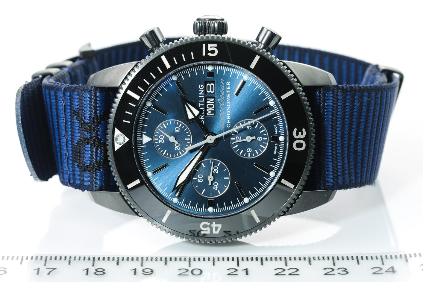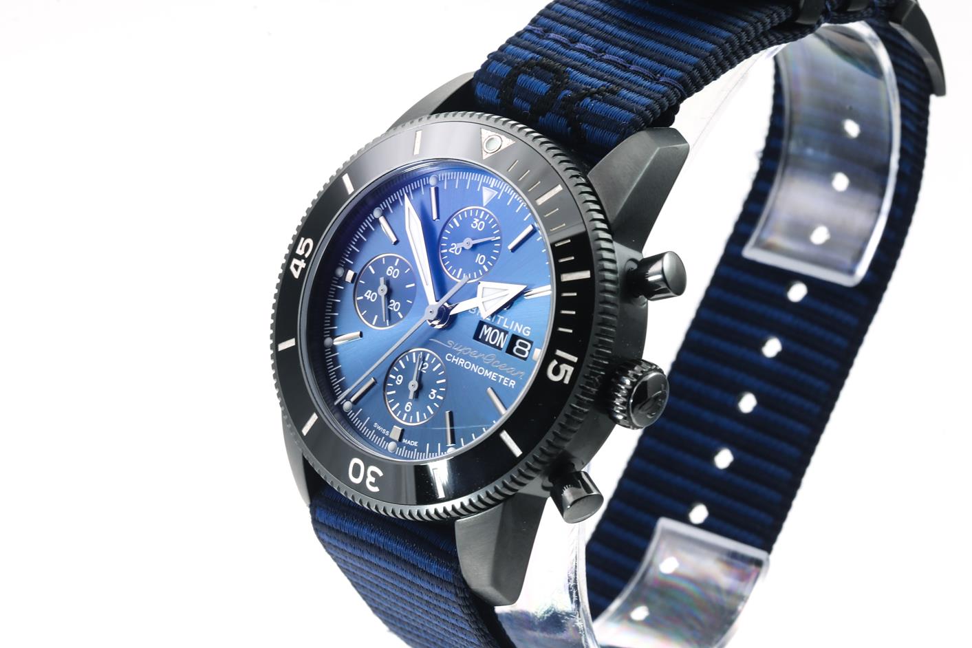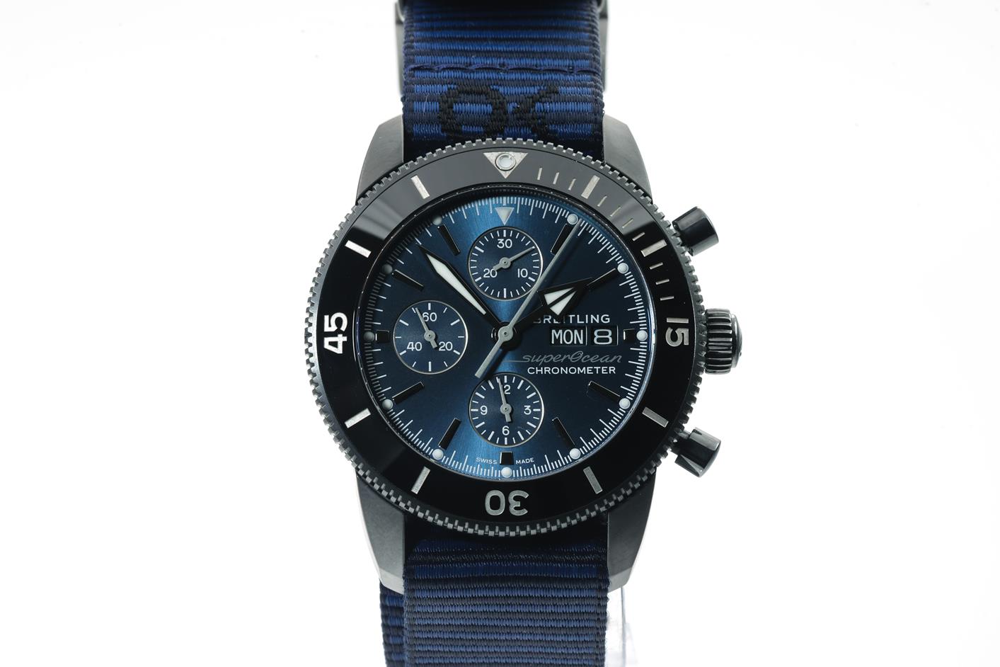Breitling Superocean Heritage DLC-coated stainless steel automatic mens watch. Blue chronograph dial, day & date. Case diameter: 44mm, length: 24.5cm, Swiss made. Ref# M133132A1C1W1. With Breitling blue textile strap and tang buckle. With Breitling International Warranty booklet (not stamped) and Breitling box. 3 month FSA warranty. (New)