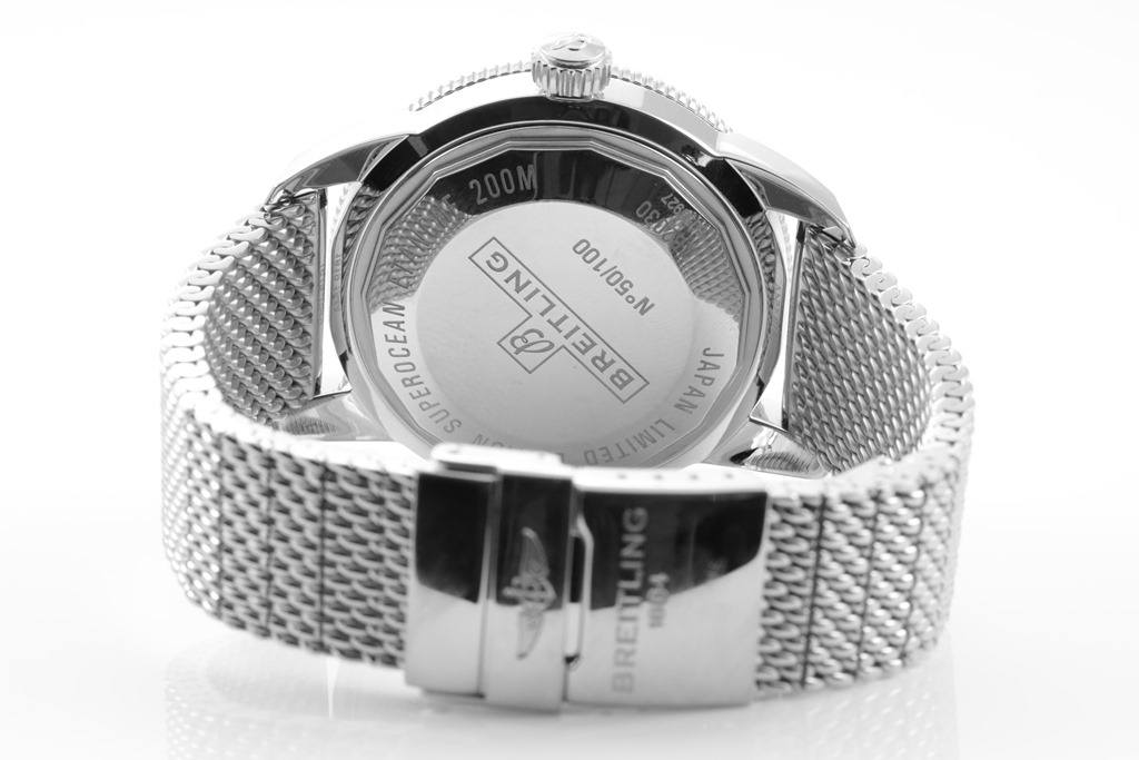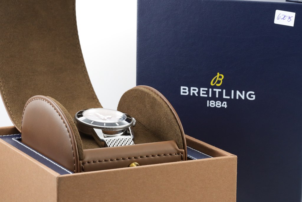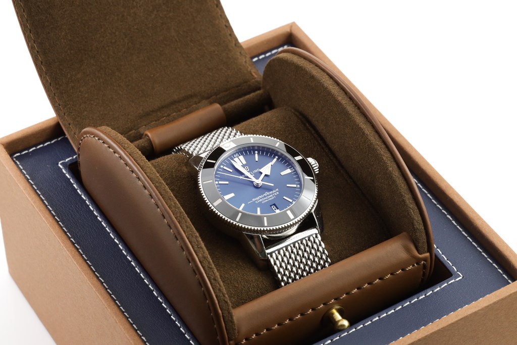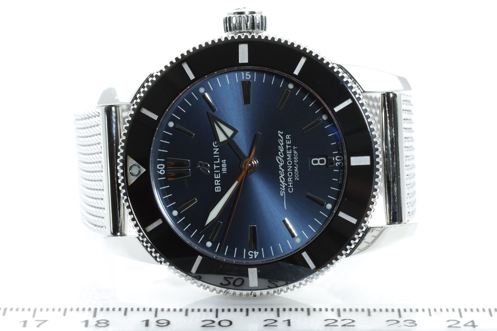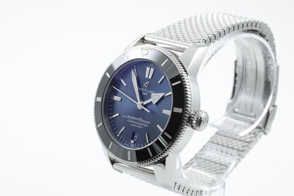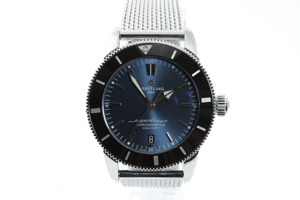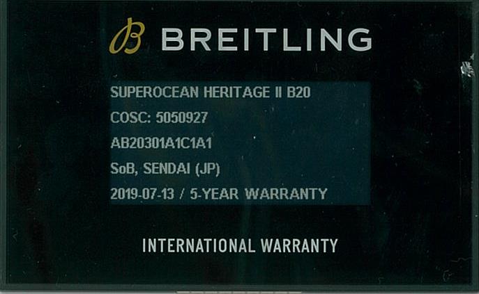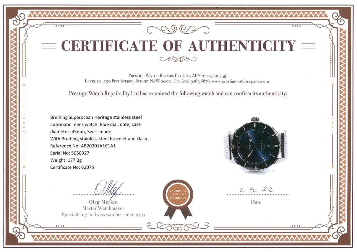 Breitling Superocean Heritage stainless steel automatic mens watch. Blue dial, date, case diameter: 45mm, wrist size: 19cm, Swiss made. Ref# AB20301A1C1A1. With Breitling stainless steel bracelet and clasp. With Certificate of Authenticity, Breitling International E-warranty Card dated 13/7/2019 and Breitling box. With and 3 month FSA warranty. (Pre-owned)