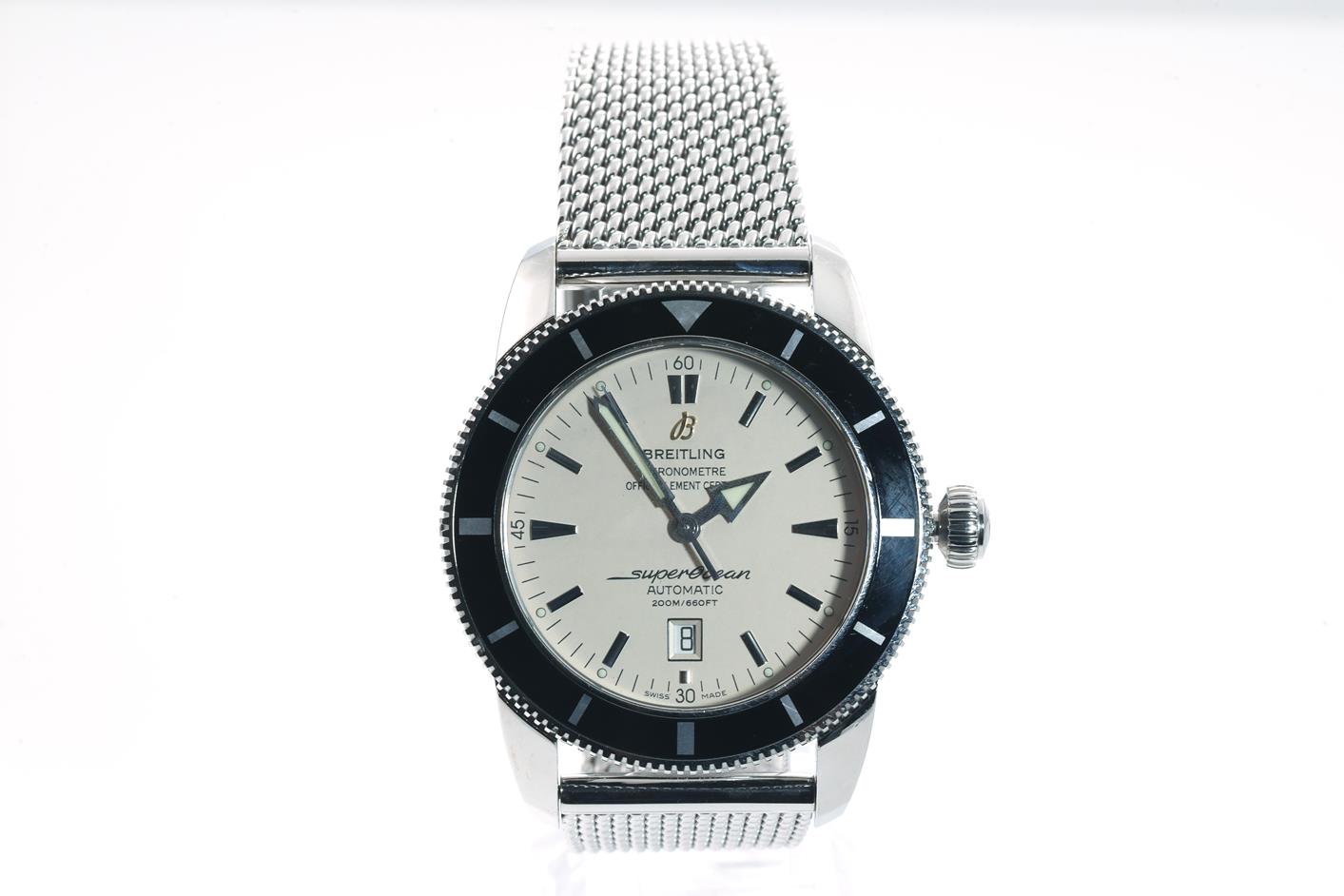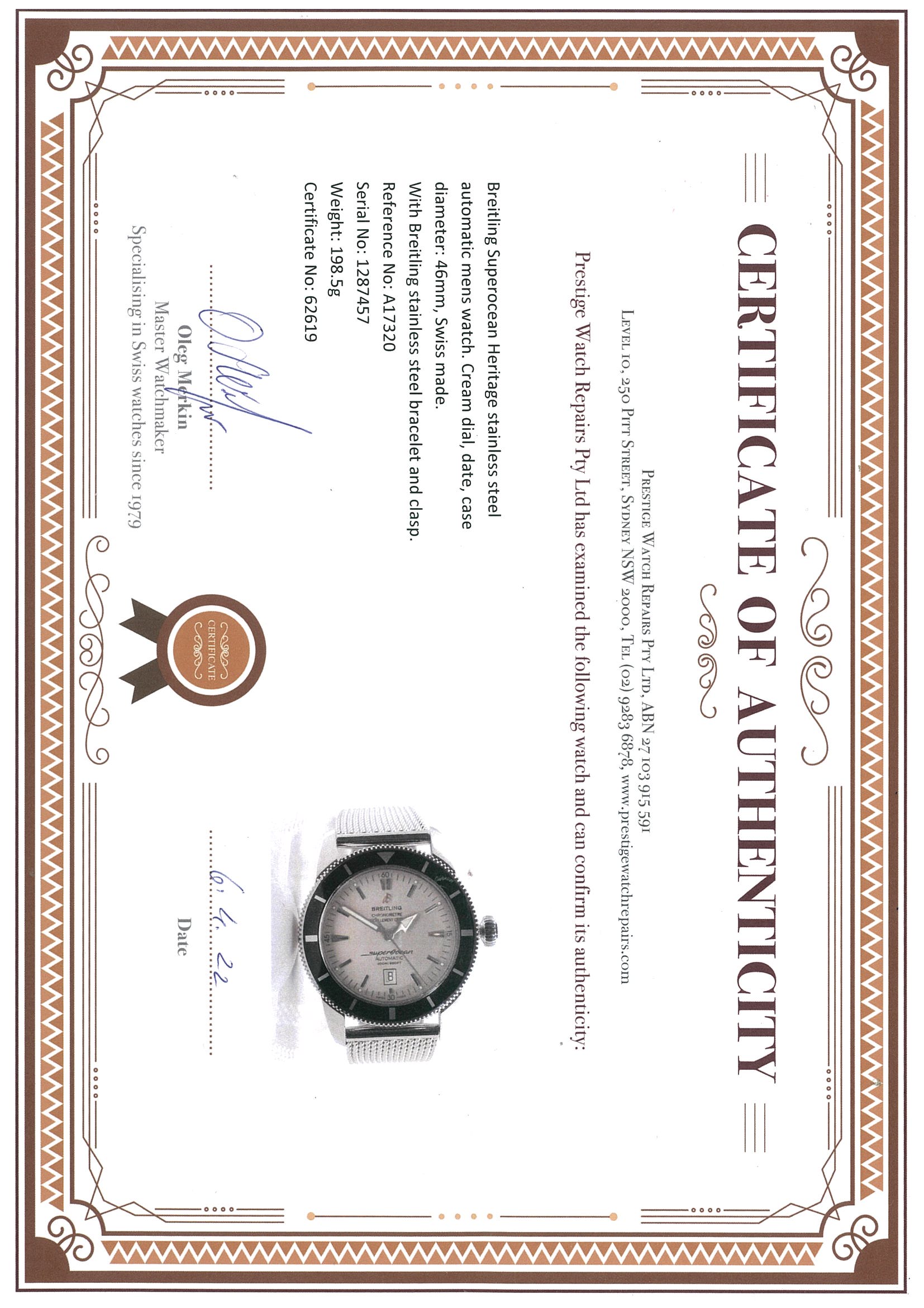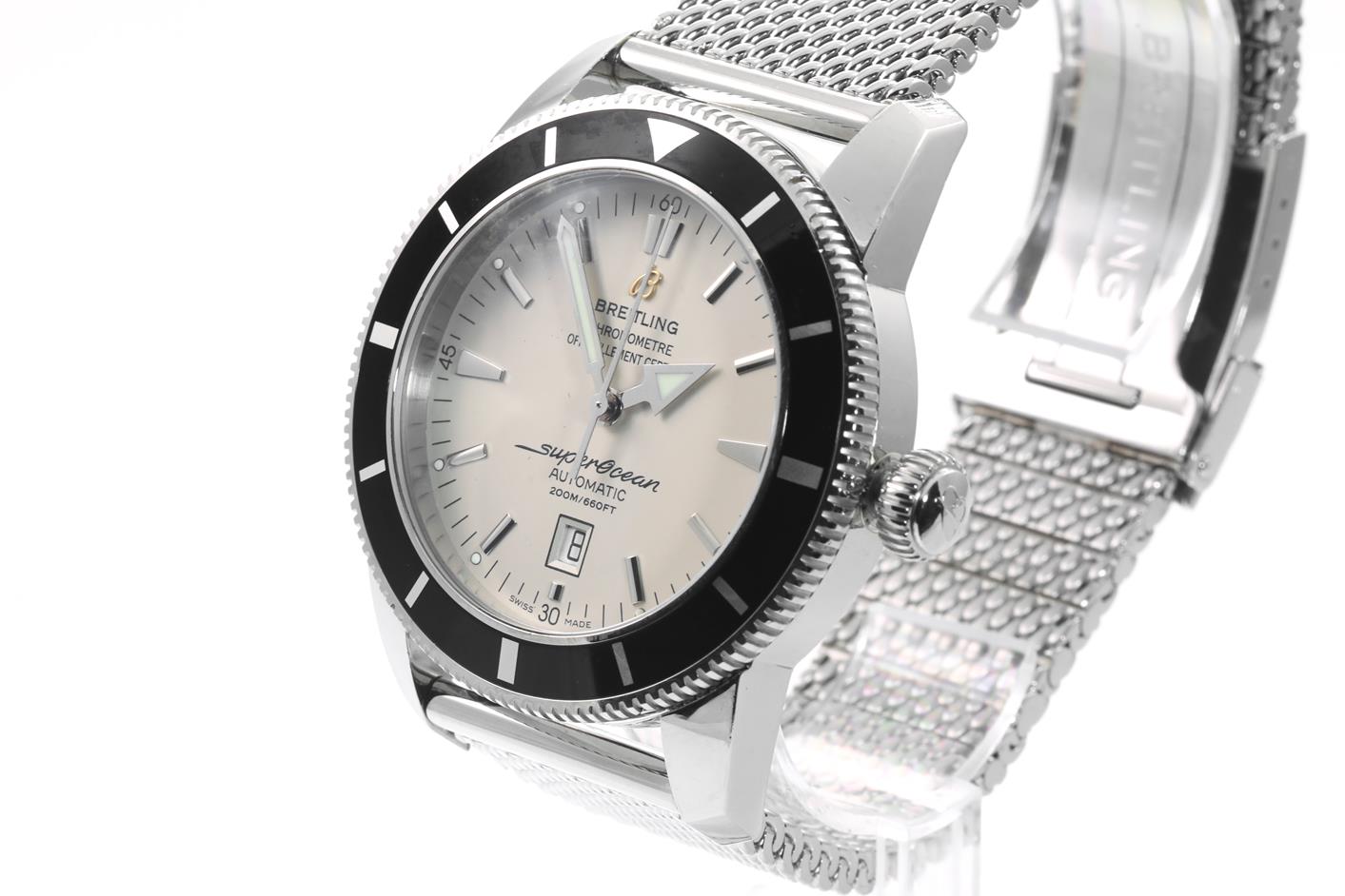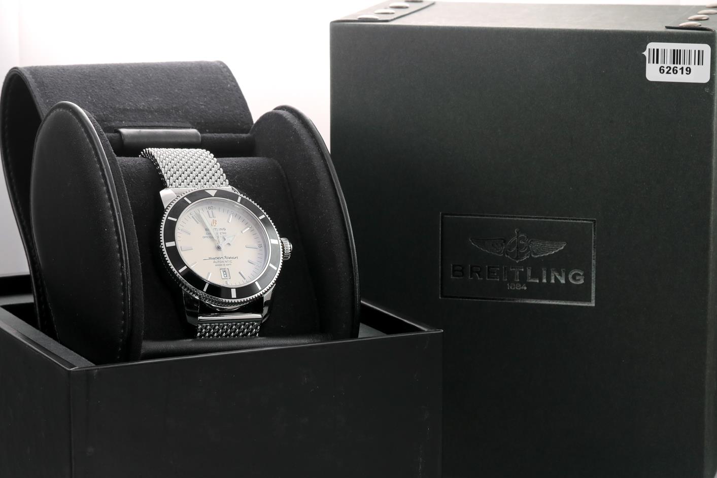 Breitling Superocean Heritage stainless steel automatic mens watch. Cream dial, date, case diameter: 46mm, wrist size: 20.5cm, Swiss made. Ref# A17320. With Breitling stainless steel bracelet and clasp. With Certificate of Authenticity, Breitling International E-warranty Card dated 14/09/2013, Breitling Complete Service invoice dated 10/07/2022, spare black rubber strap and Breitling box. 12 month Breitling warranty from the date of complete service. (Pre-owned)