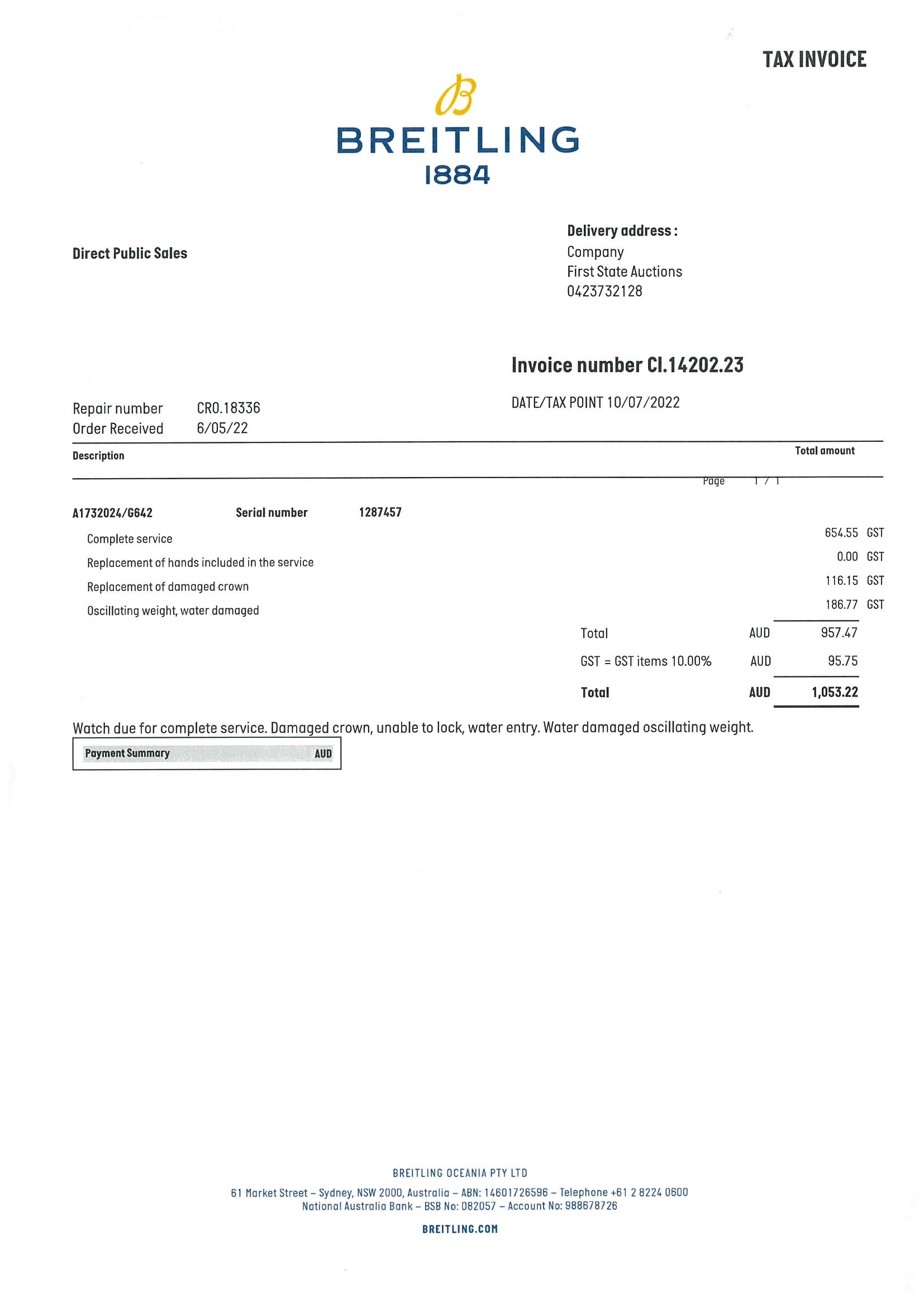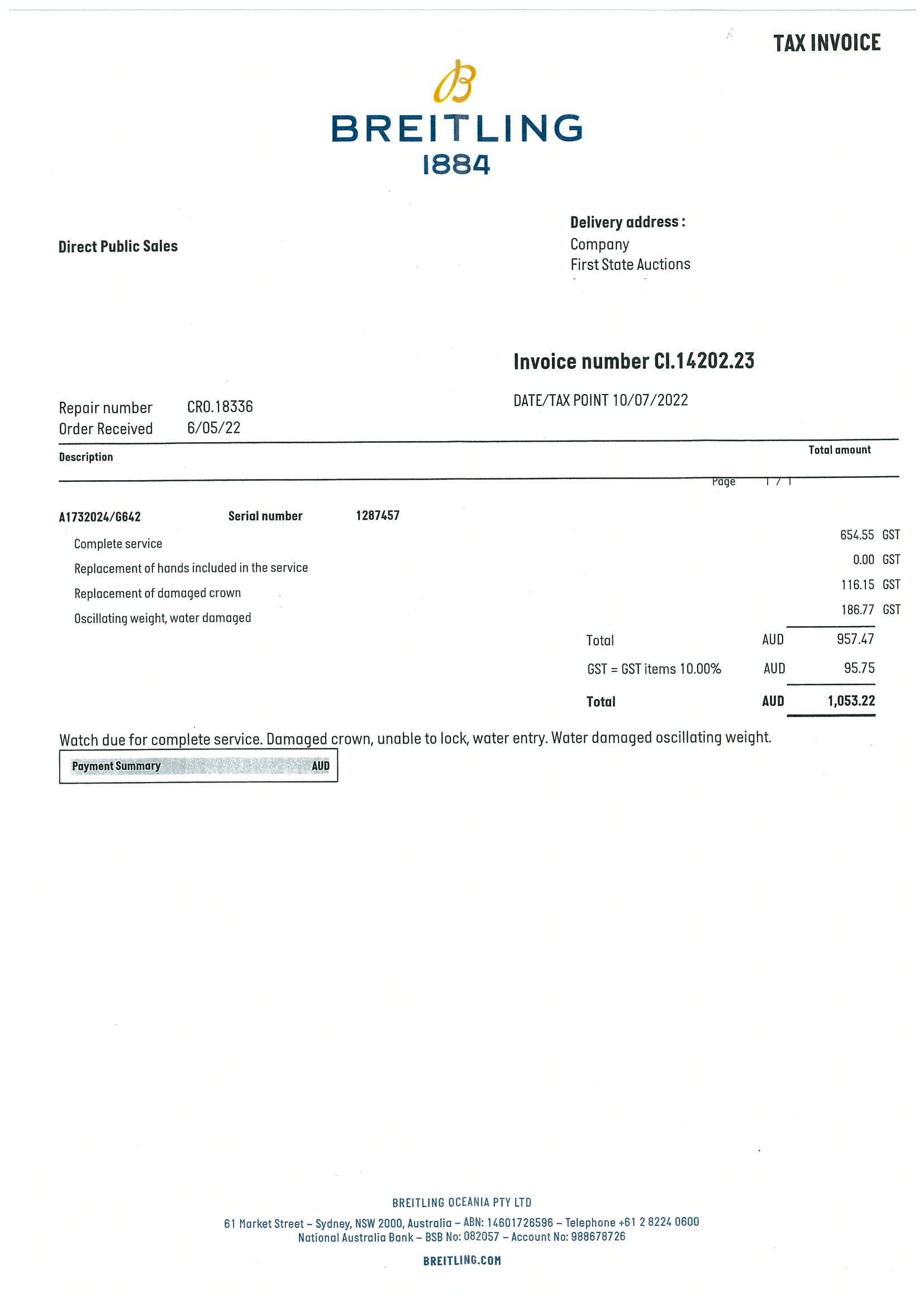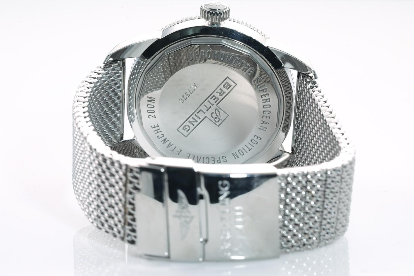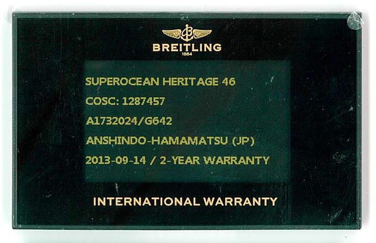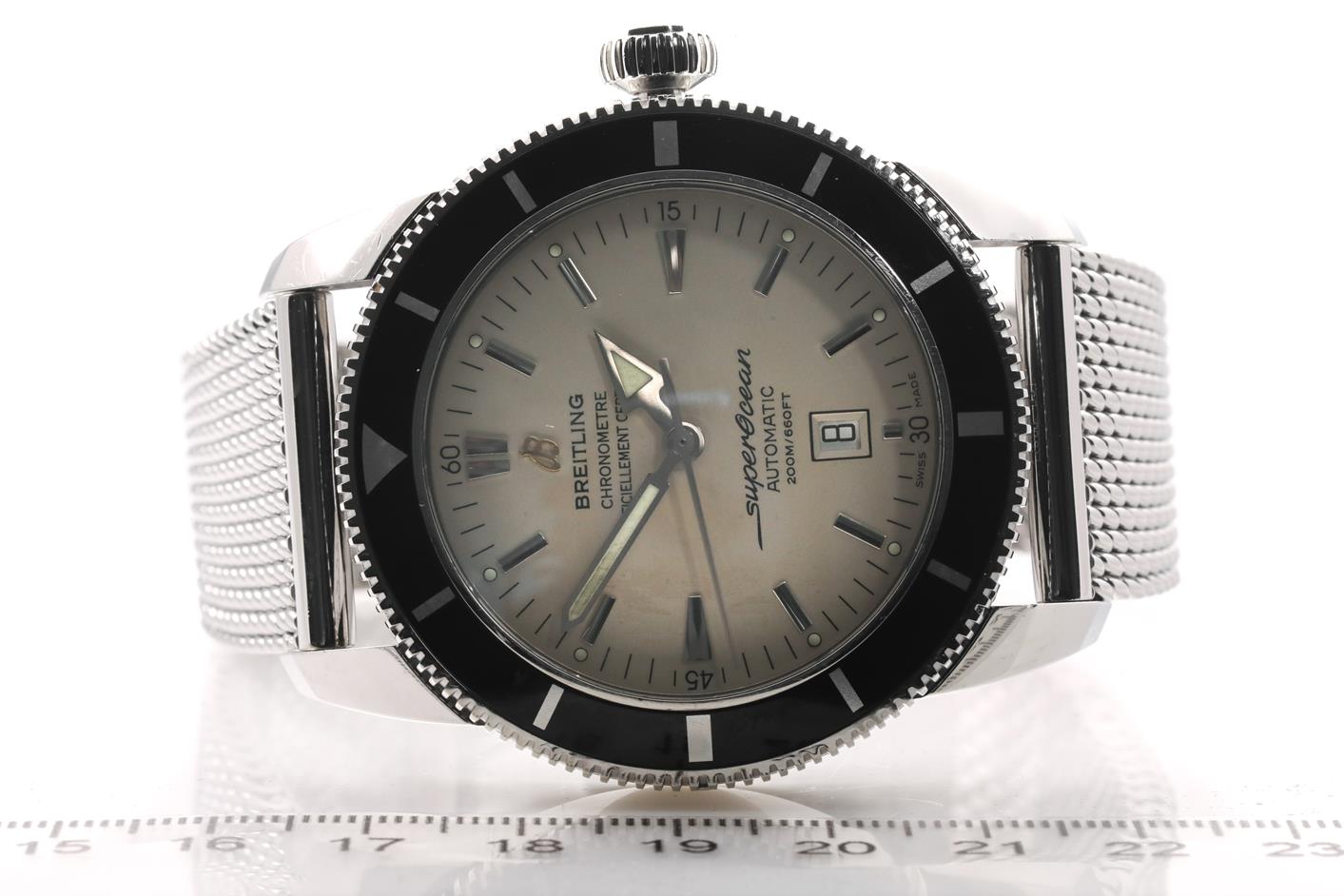 Breitling Superocean Heritage stainless steel automatic mens watch. Cream dial, date, case diameter: 46mm, wrist size: 20.5cm, Swiss made. Ref# A17320. With Breitling stainless steel bracelet and clasp. With Certificate of Authenticity, Breitling International E-warranty Card dated 14/09/2013, Breitling Complete Service invoice dated 10/07/2022, spare black rubber strap and Breitling box. 12 month Breitling warranty from the date of complete service. (Pre-owned)