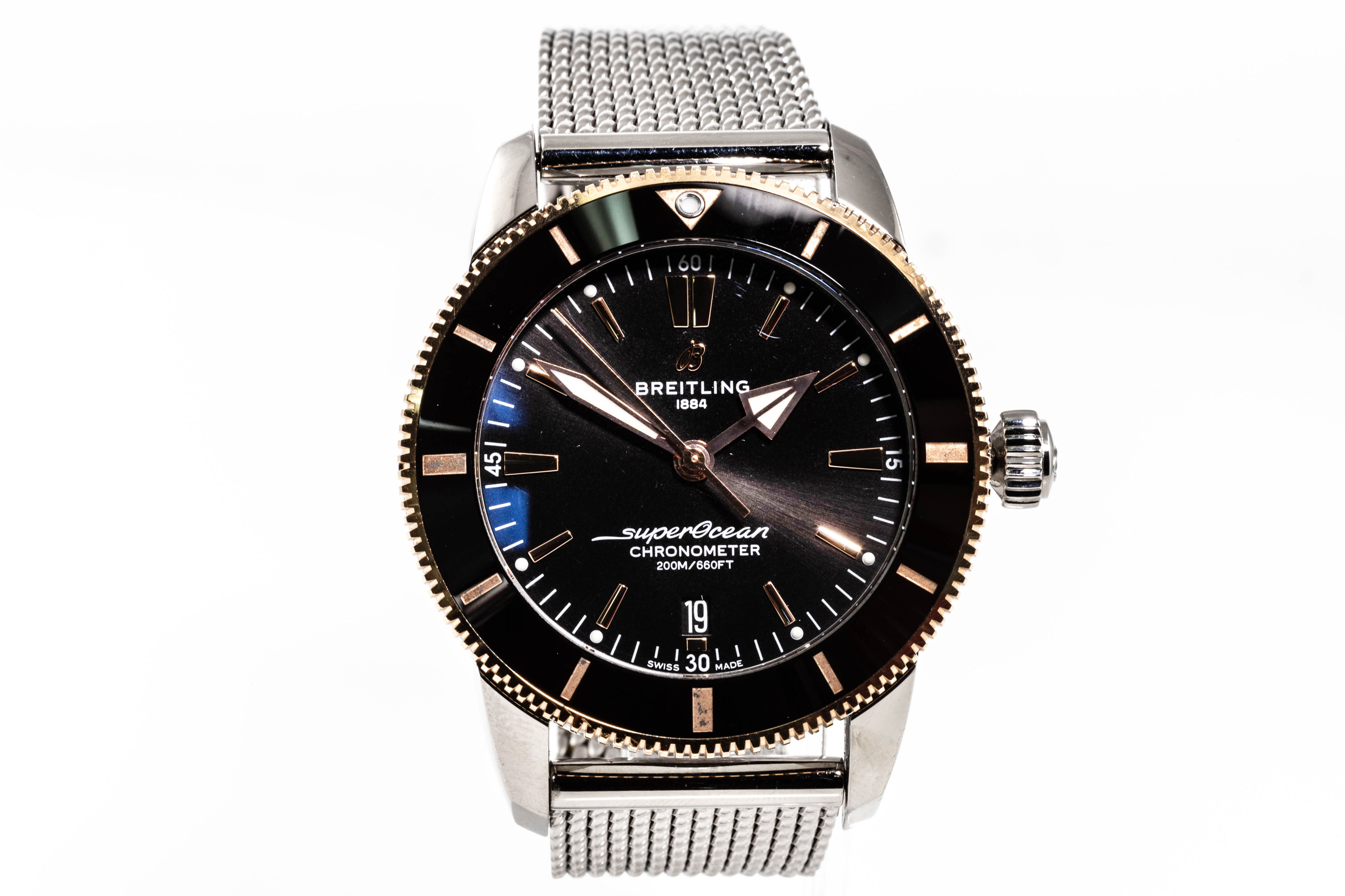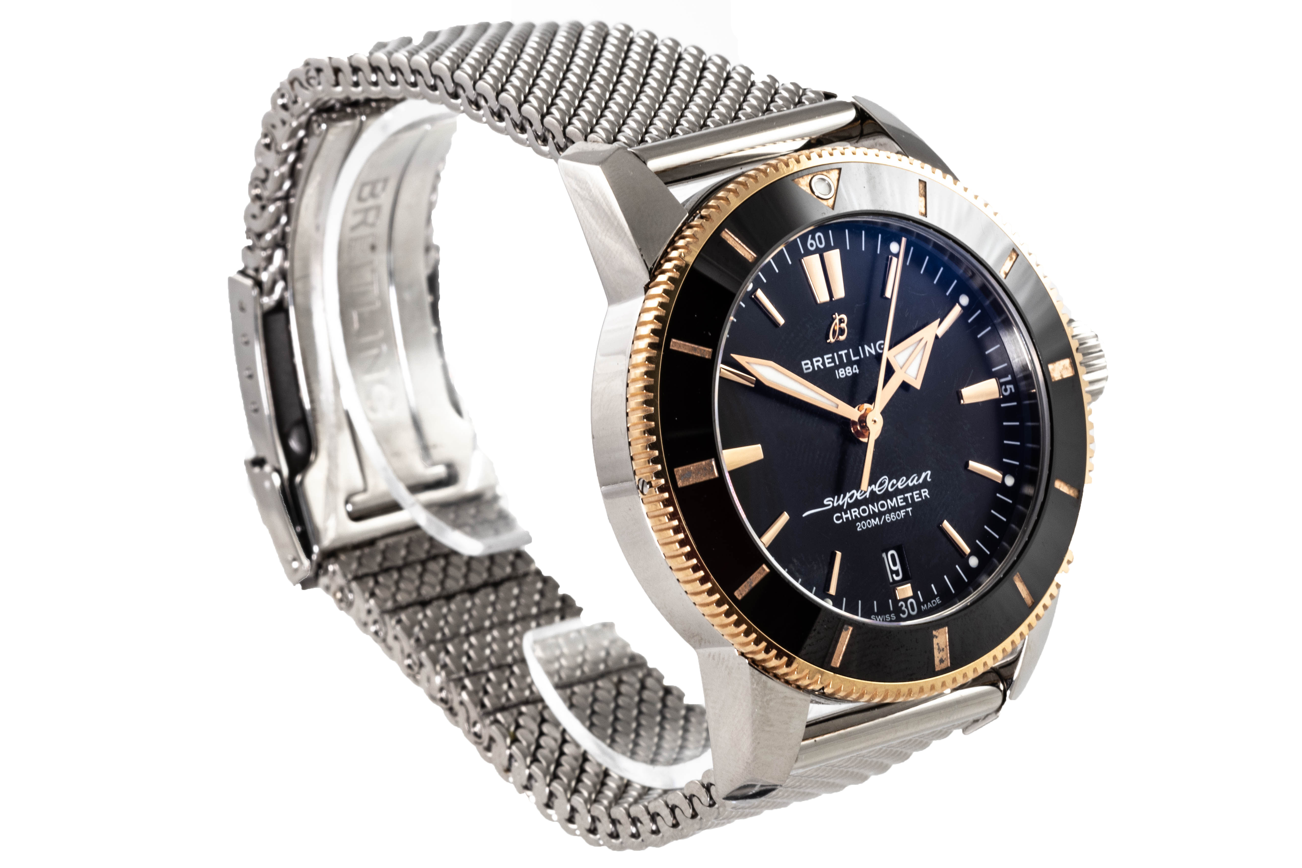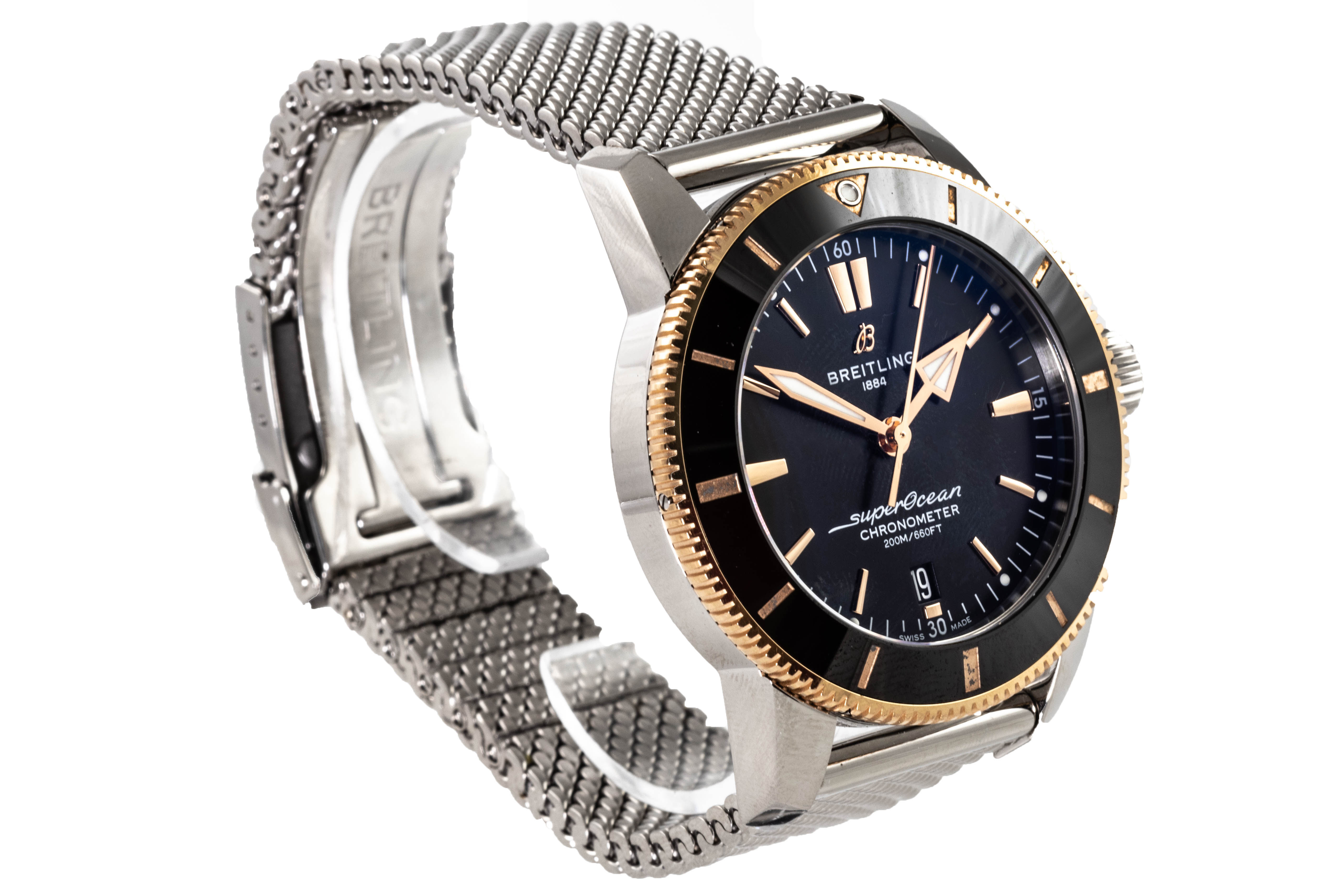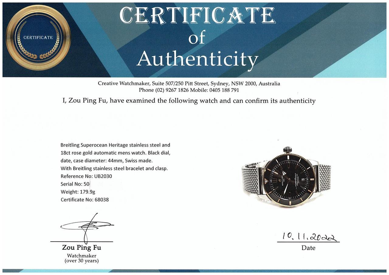 Breitiling Superocean Heritage stainless steel and 18ct rose gold automatic mens watch. Black dial, date, case diameter: 44mm, wrist size: 19cm, swiss made. Ref# UB2030. With Breitling stainless steel bracelet and clasp. With Certificate of Authenticity, Breitling International Warranty Card and Breitling case. 3 month FSA warranty. (Pre-owned)