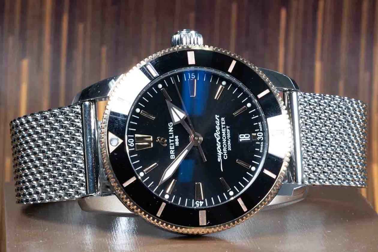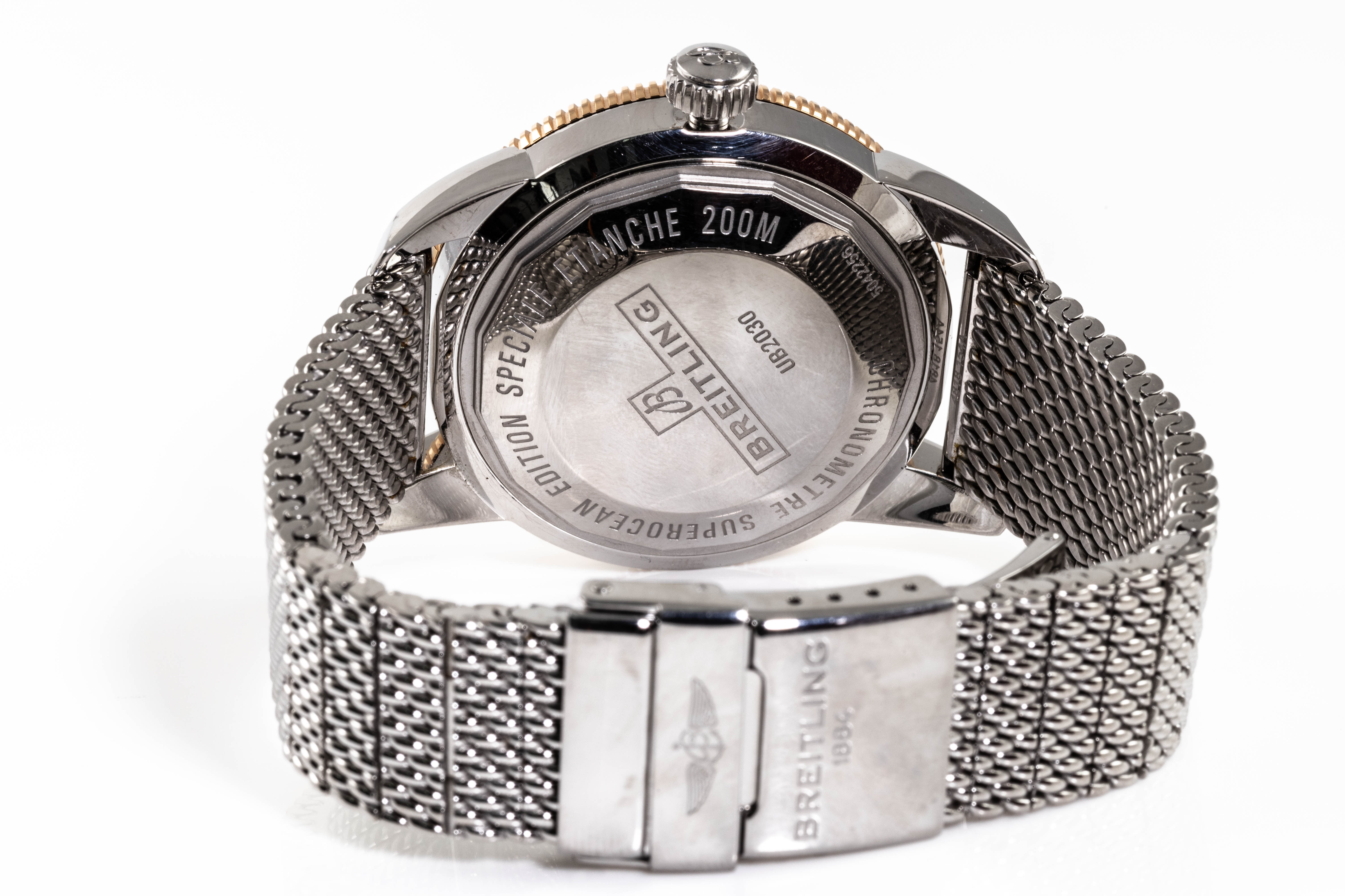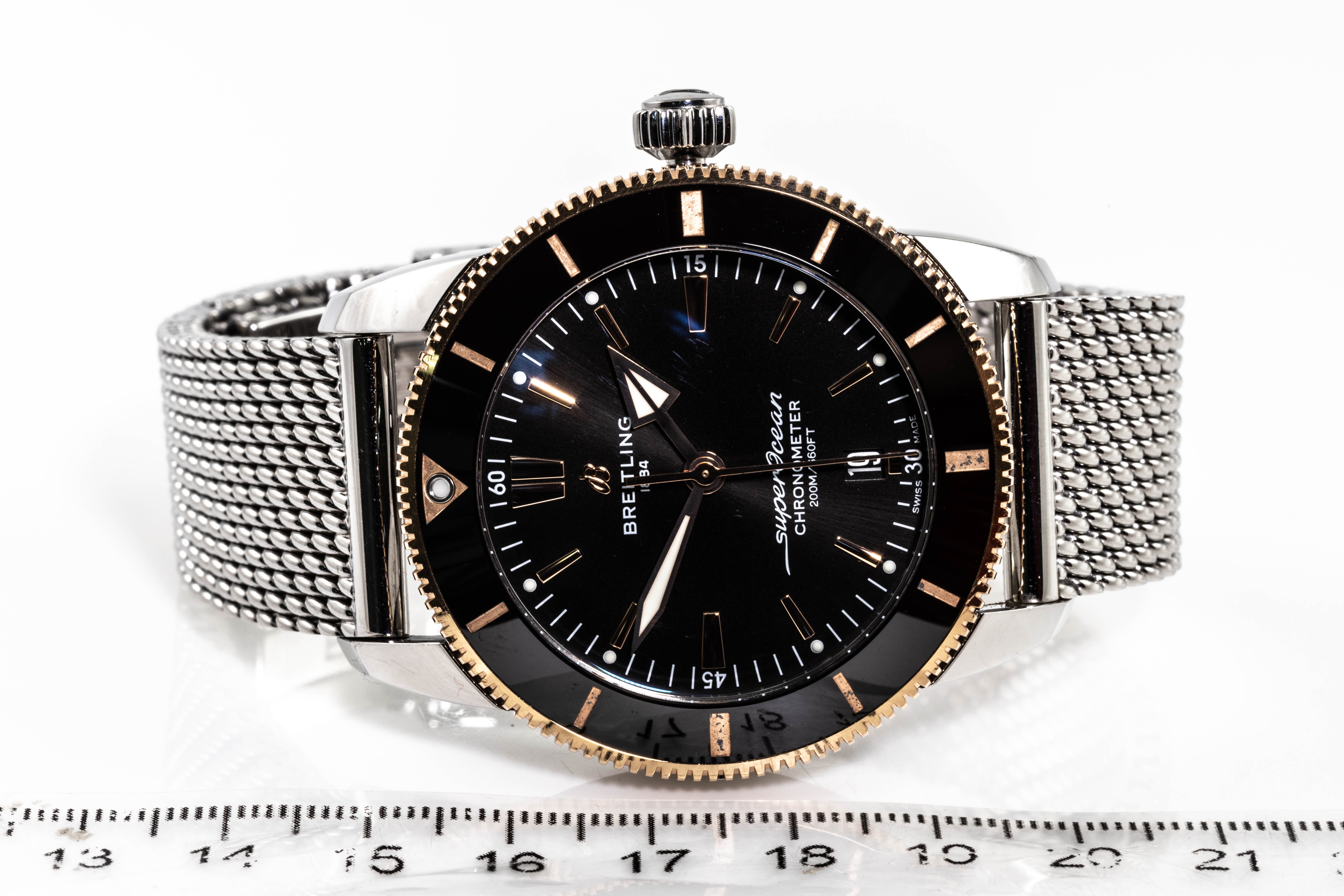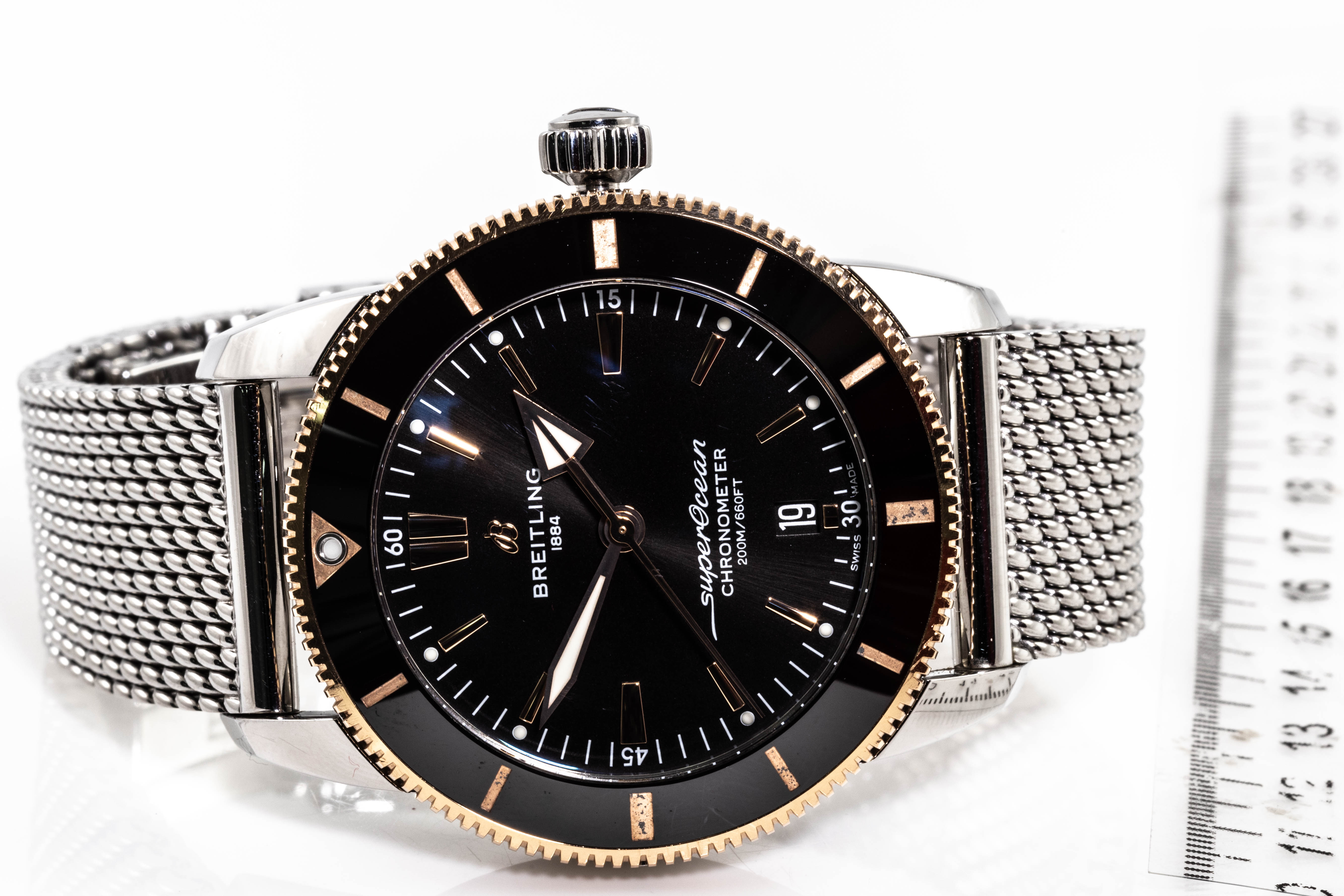 Breitiling Superocean Heritage stainless steel and 18ct rose gold automatic mens watch. Black dial, date, case diameter: 44mm, wrist size: 19cm, swiss made. Ref# UB2030. With Breitling stainless steel bracelet and clasp. With Certificate of Authenticity, Breitling International Warranty Card and Breitling case. 3 month FSA warranty. (Pre-owned)