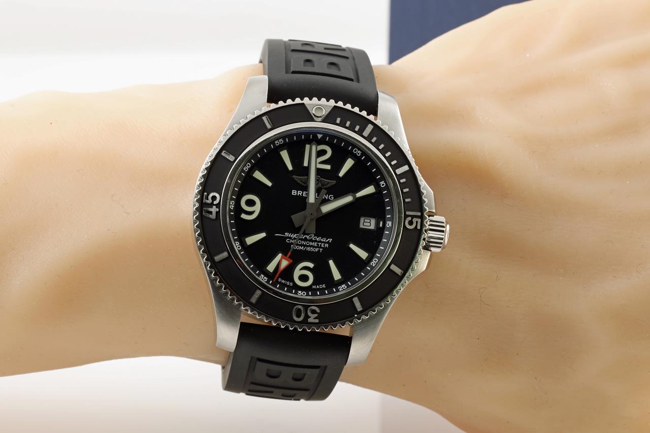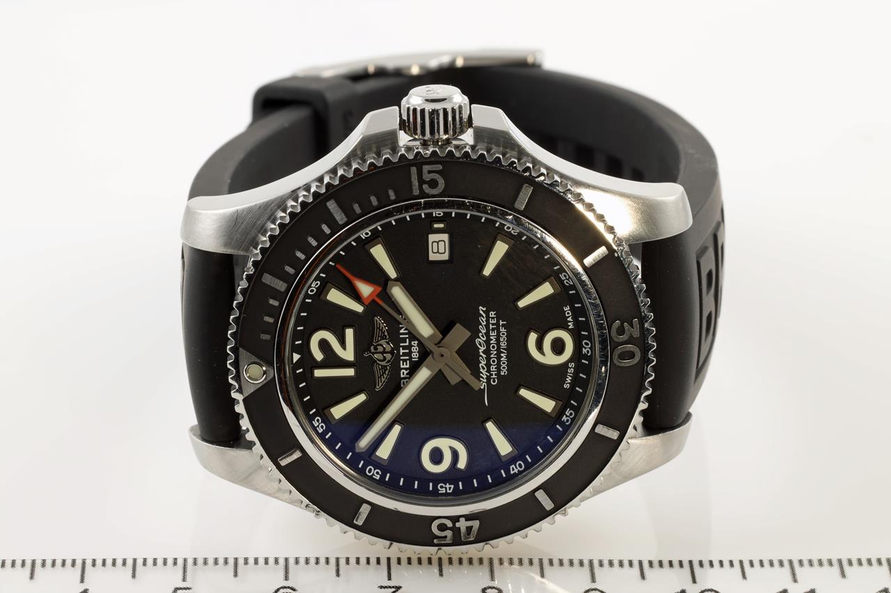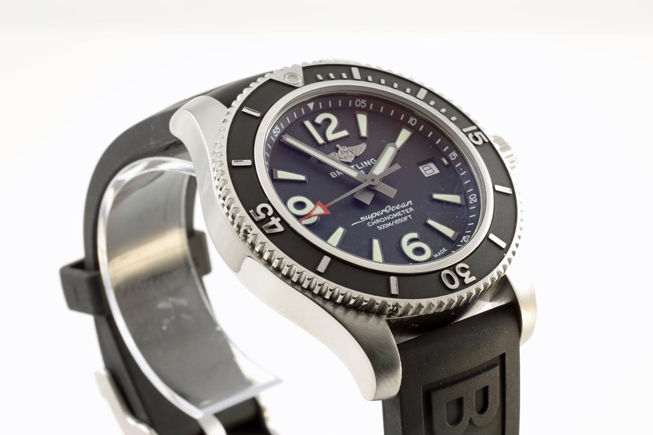 Breitling Superocean II stainless steel automatic mens watch. Black dial, date, case diameter: 42mm. Length: 23cm, Swiss made. Ref #A17366021B1S1. With Breitling black rubber strap and clasp. With Breitling international e-warranty card dated 10/12/2019 and instruction manual inside Breitling box. With certificate of authenticity. 3 month FSA warranty. (Pre-owned)