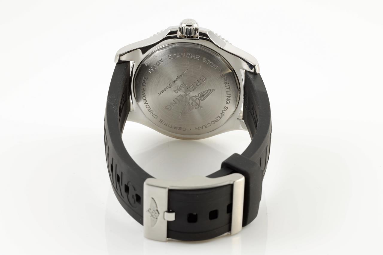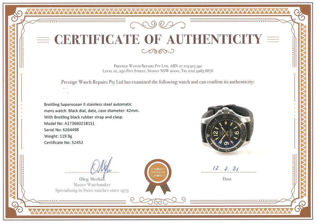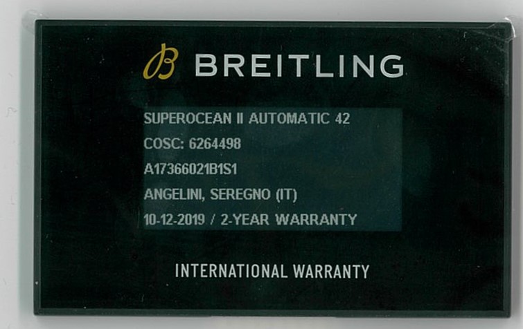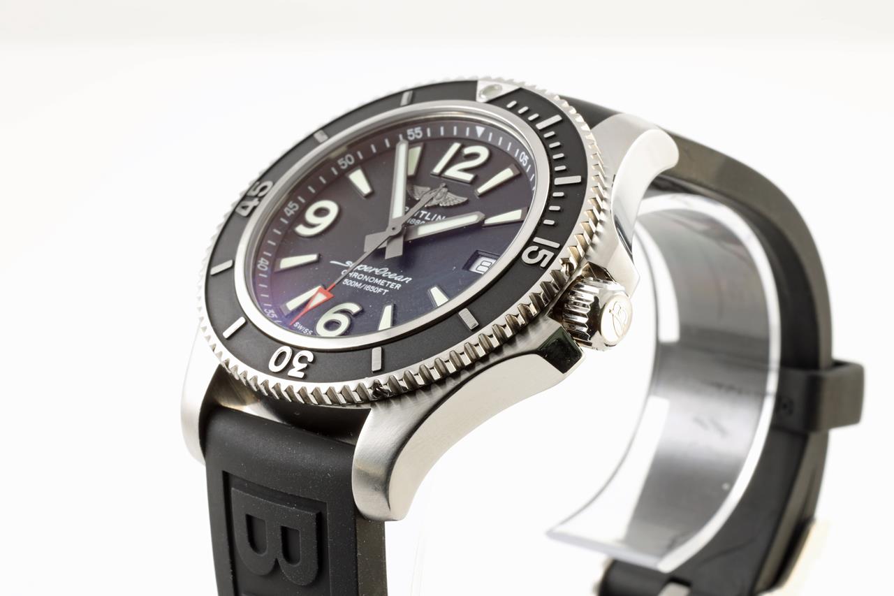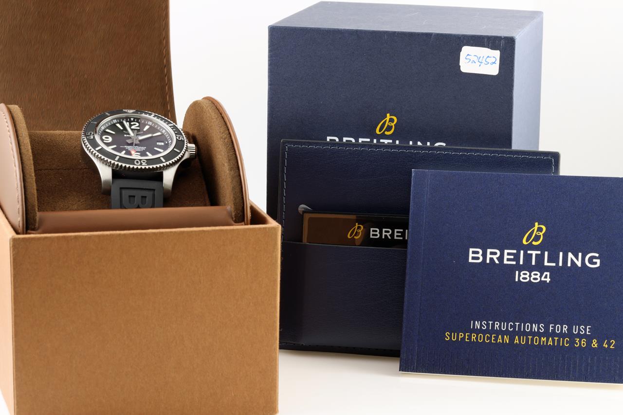 Breitling Superocean II stainless steel automatic mens watch. Black dial, date, case diameter: 42mm. Length: 23cm, Swiss made. Ref #A17366021B1S1. With Breitling black rubber strap and clasp. With Breitling international e-warranty card dated 10/12/2019 and instruction manual inside Breitling box. With certificate of authenticity. 3 month FSA warranty. (Pre-owned)