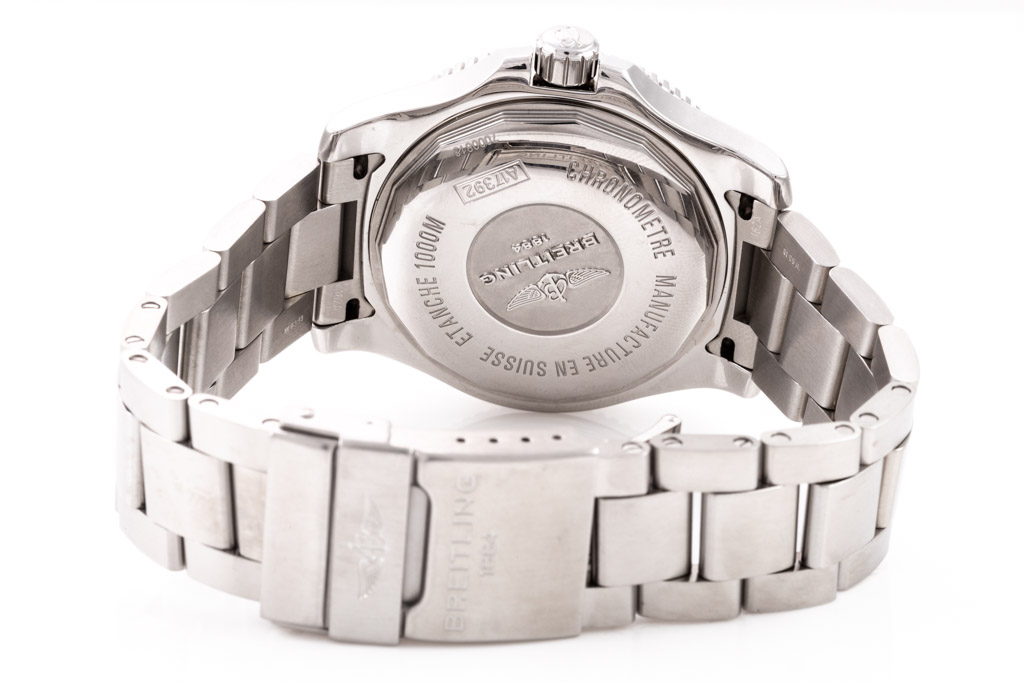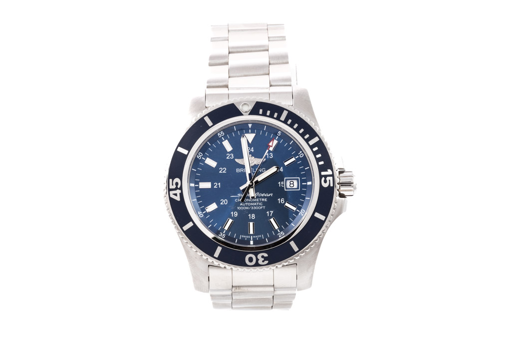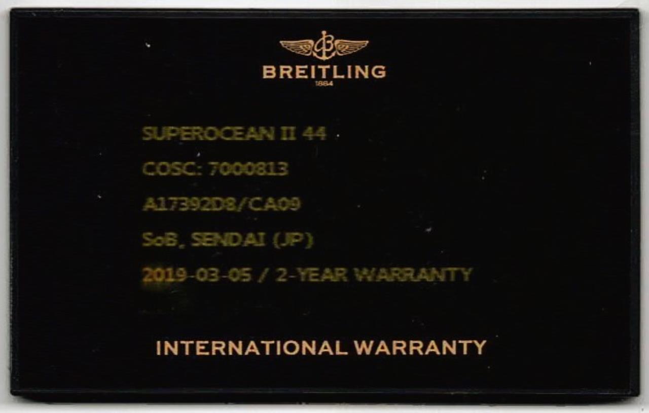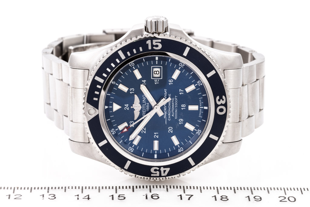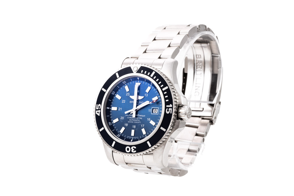 Breitling Superocean II stainless steel automatic mens watch. Gun blue dial, date, case diameter: 44mm, wrist size: 20.5cm, Swiss made. Ref# A17392. With Breitling stainless steel bracelet and clasp. With Certificate of Authenticity, Breitling International Warrenty Card dated 05/03/2019 and Breitling box. 3 month FSA warranty. (Pre-owned)