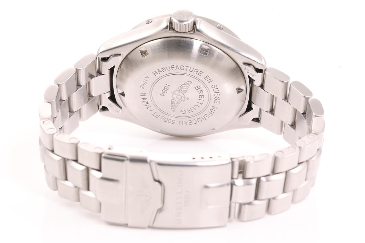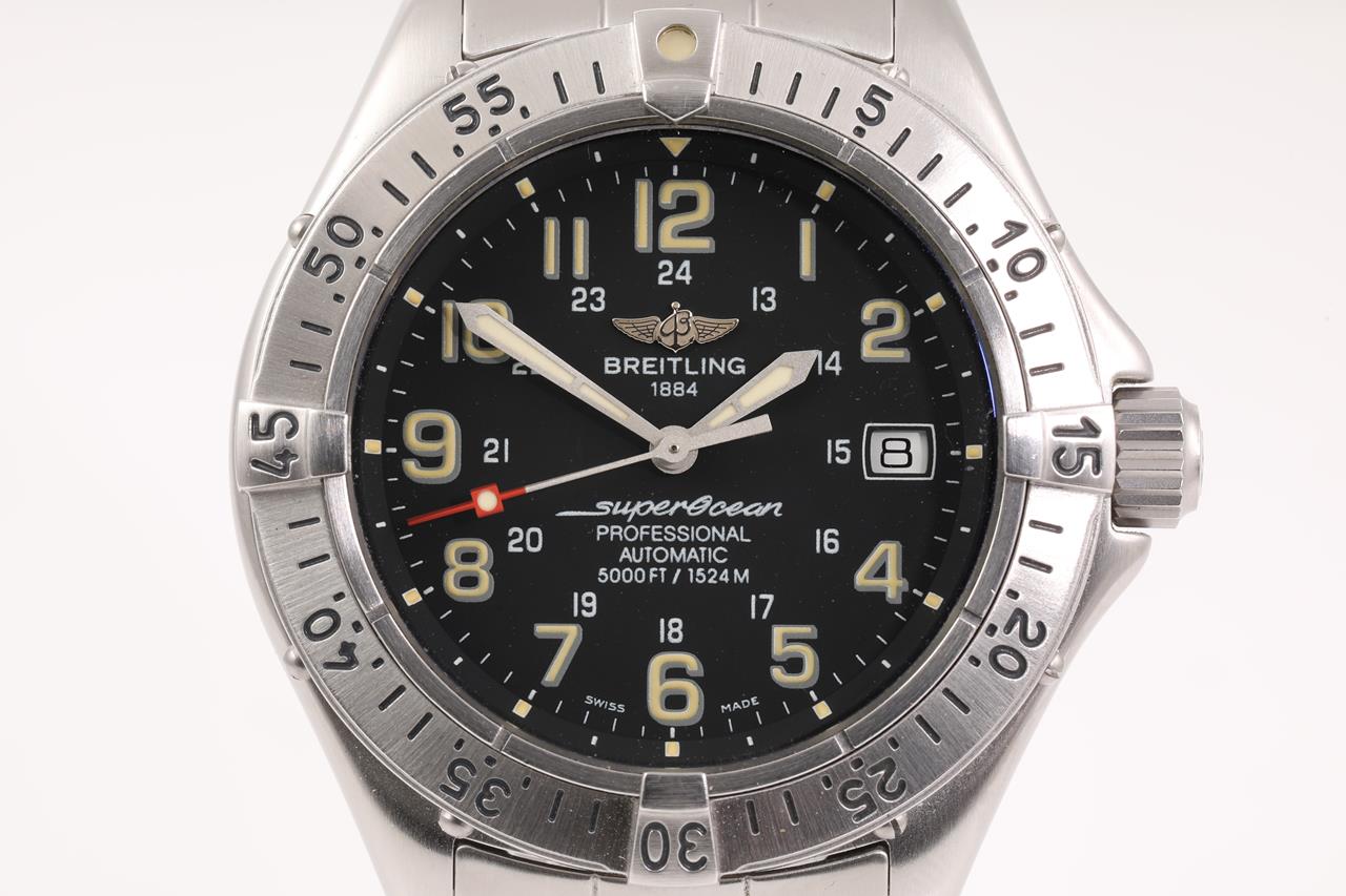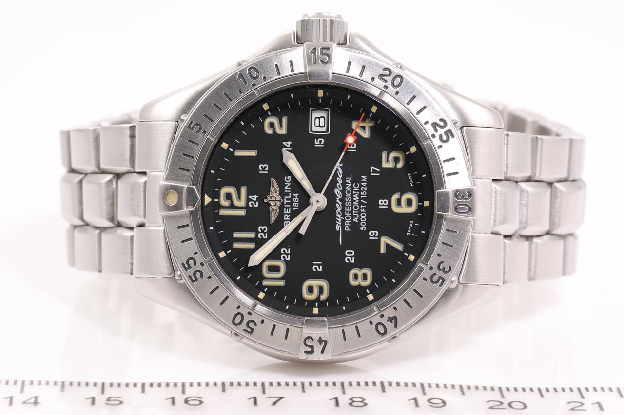 Breitling Superocean stainless steel automatic mens watch. Black dial, date, case diameter: 41mm, wrist size 17.5cm, Swiss made. Ref# A17045. With Breitling stainless steel bracelet and clasp. With certificate of authenticity, Breitling international warranty booklet dated 01/09/1999 and Breitling box. 3 month FSA warranty. (Pre-owned)