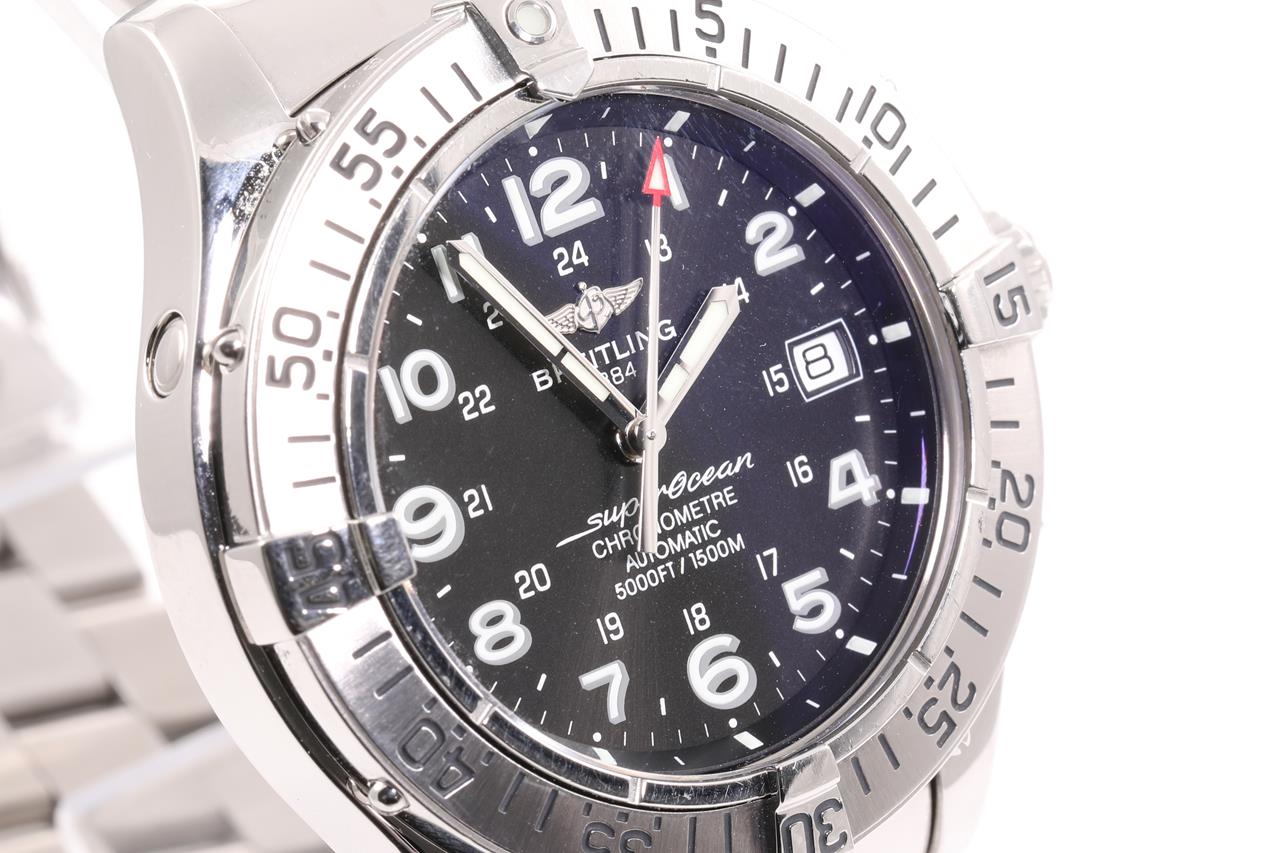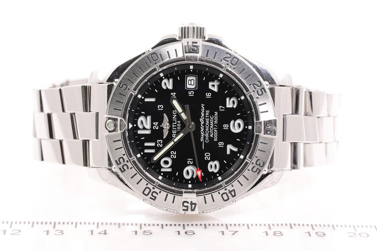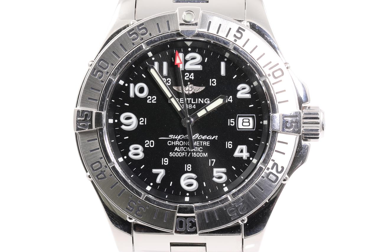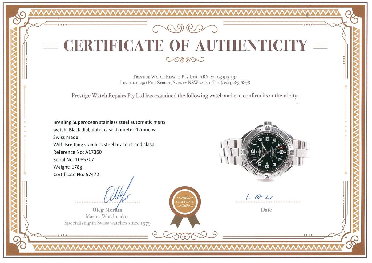 Breitling Superocean stainless steel automatic mens watch. Black dial, date, case diameter 42mm, wrist size 19.5cm, Swiss made. Ref# A17360. With Breitling stainless steel bracelet and clasp. With certificate of authenticity, Breitling international warranty booklet dated 01/07/2007 and Breitling box. 3 month FSA warranty. (Pre-owned)