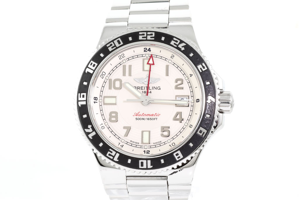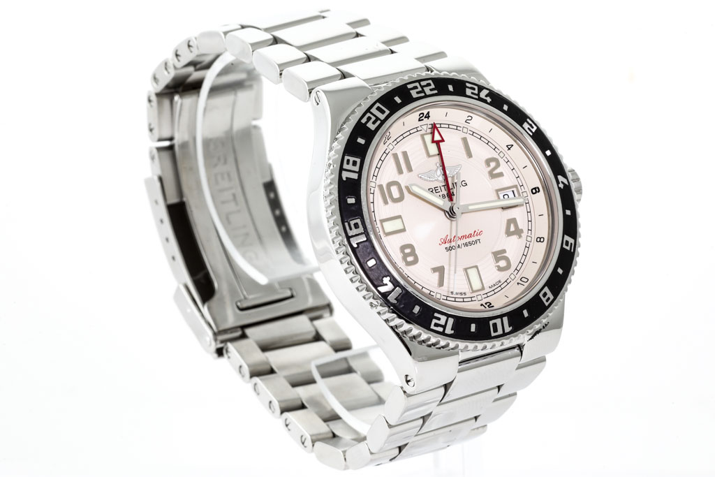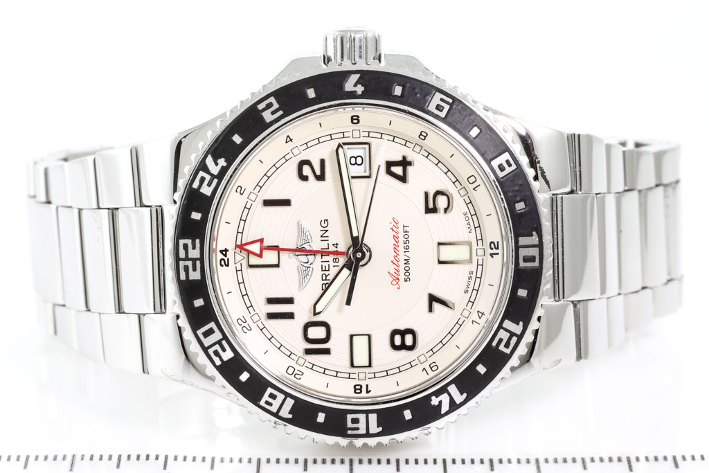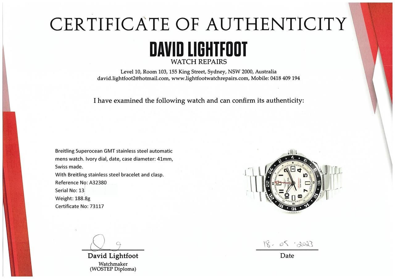 Breitling Superocean GMT stainless steel automatic mens watch. Ivory dial, date, case diameter: 41mm, wrist size: 20cm, Swiss made. Ref# A32380. With Breitling stainless steel bracelet and clasp. With Certificate of Authenticity, Breitling International Warranty booklet dated 29/08/2012 and Breitling box. 6 month David Lightfood Watchmaker warranty from the date of full service. (Pre-owned)
